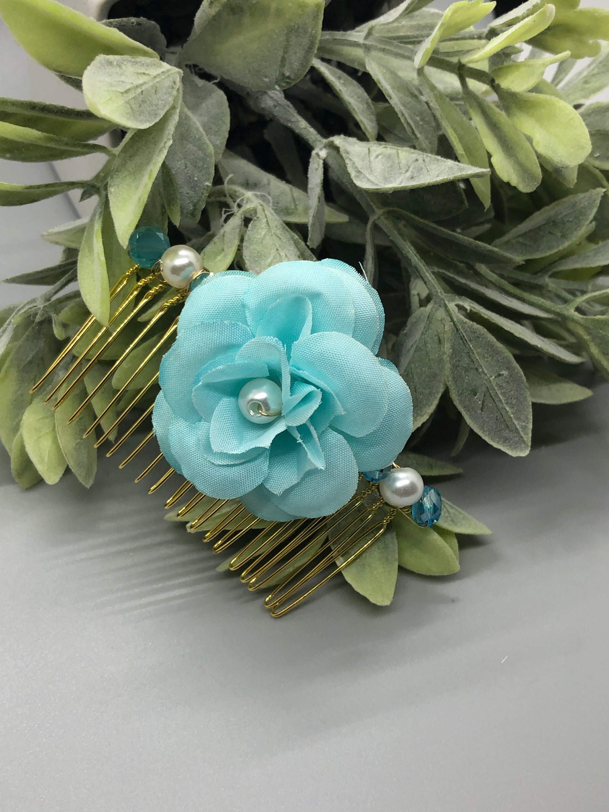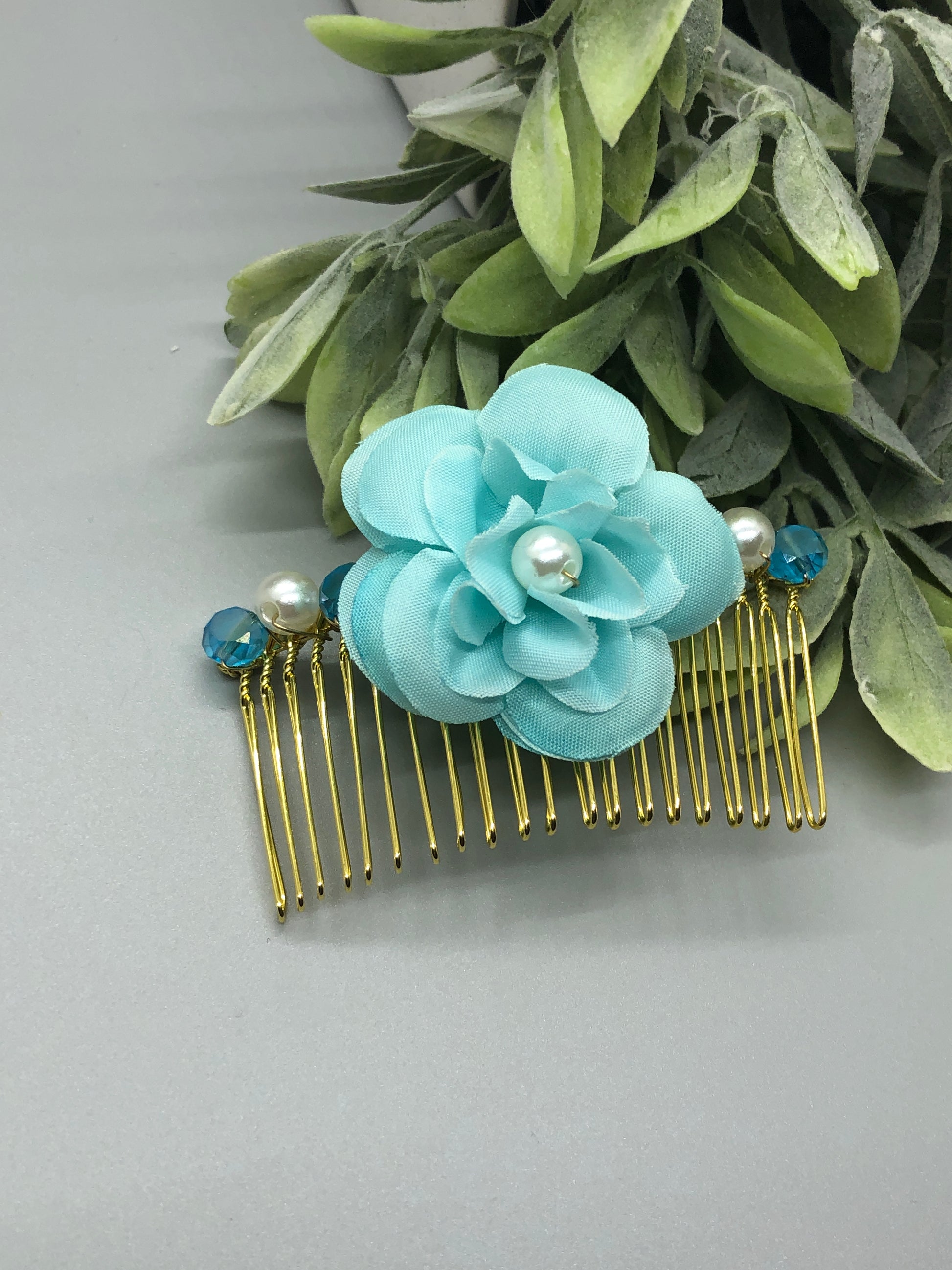 Baby Teal Flower Teal White Beads 3.5' Metal Side Comb Retro Vintage Style 1 pc