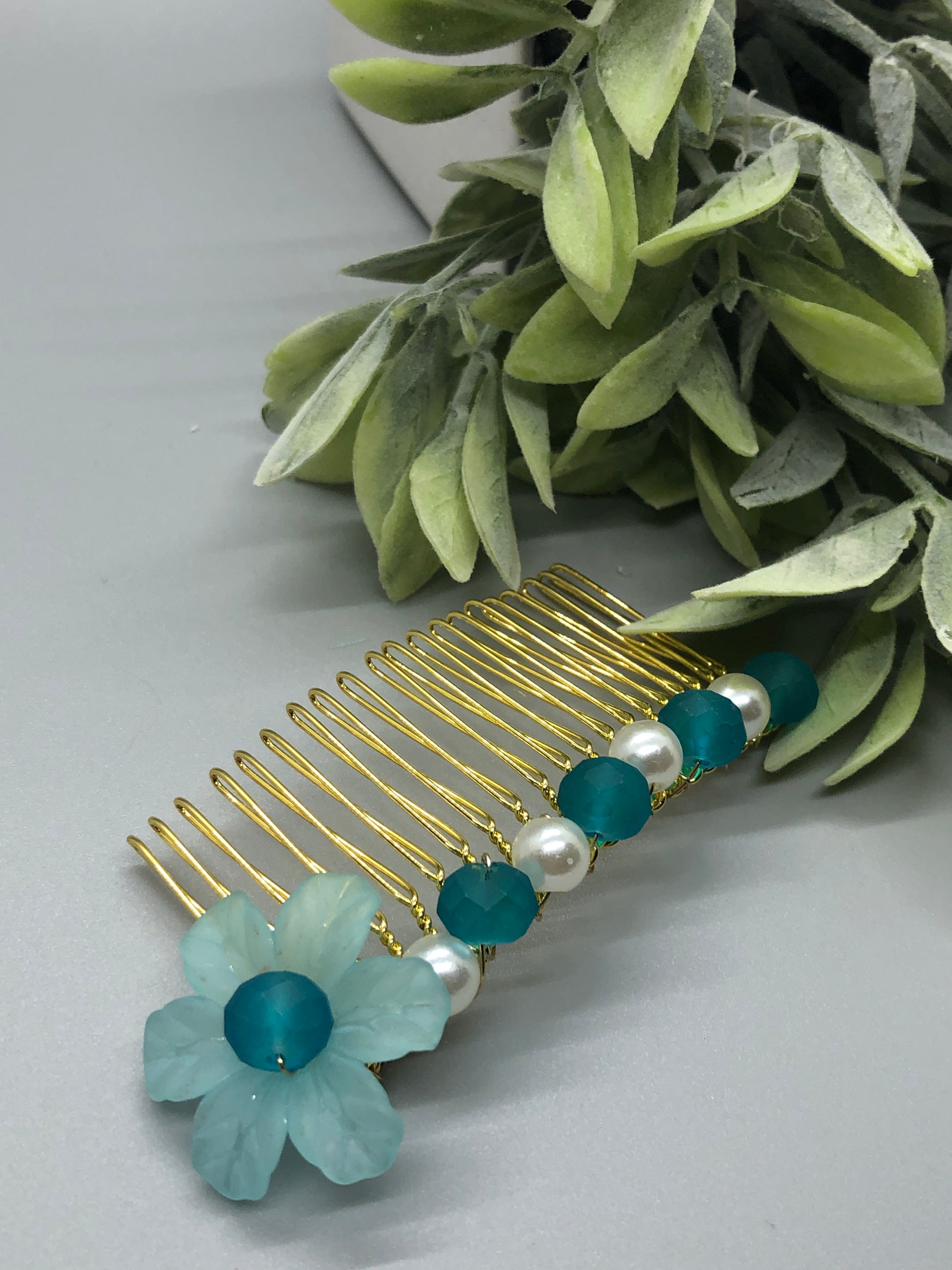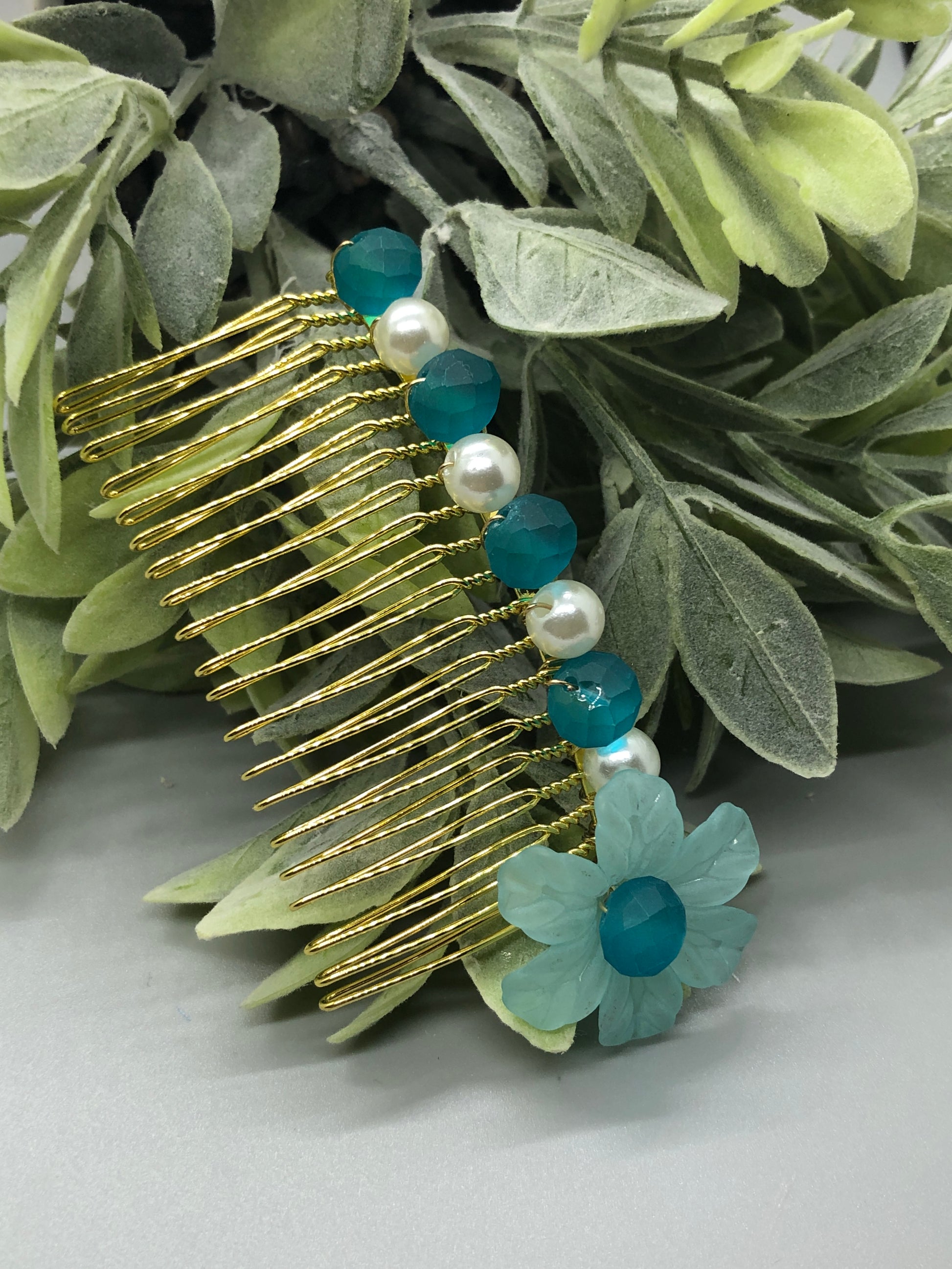 Teal Acrylic Flower Teal White Beads 3.5' Metal Side Comb Retro Vintage Style 1 pc