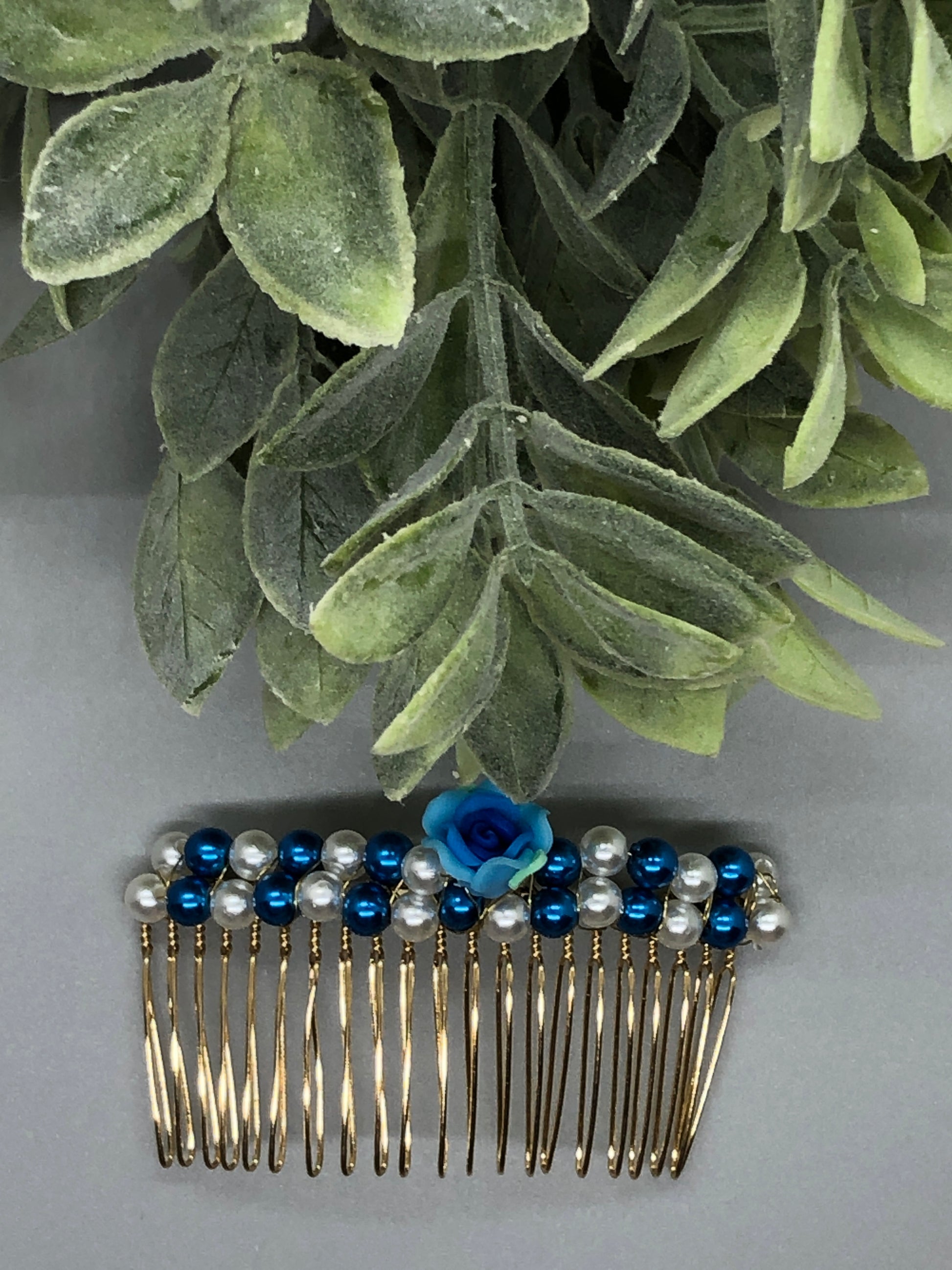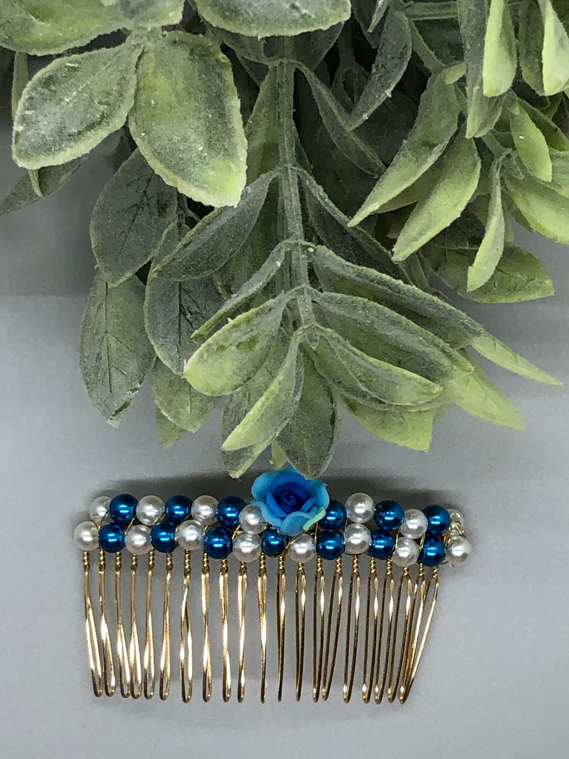 Blue White Flower Beaded Hair Comb 3.5' Gold Comb Retro Bridal Prom Wedding Party