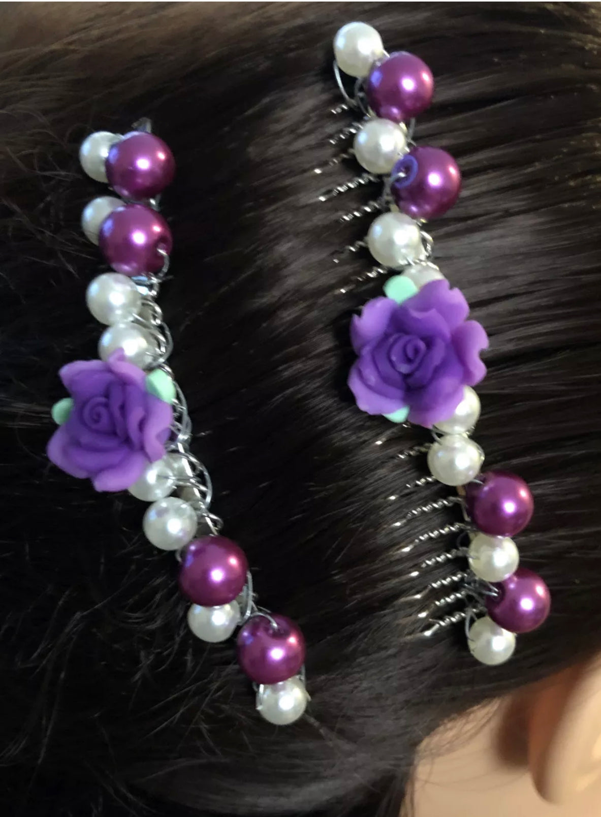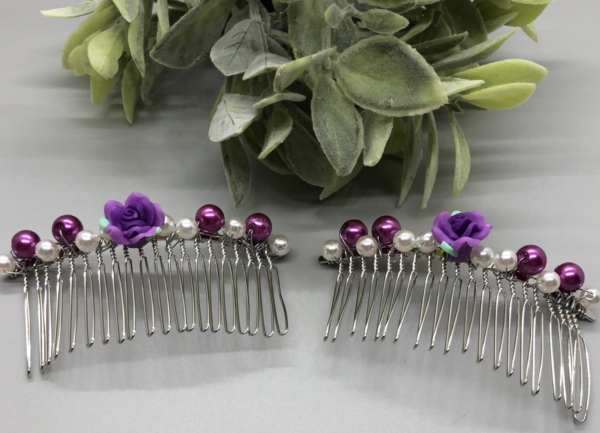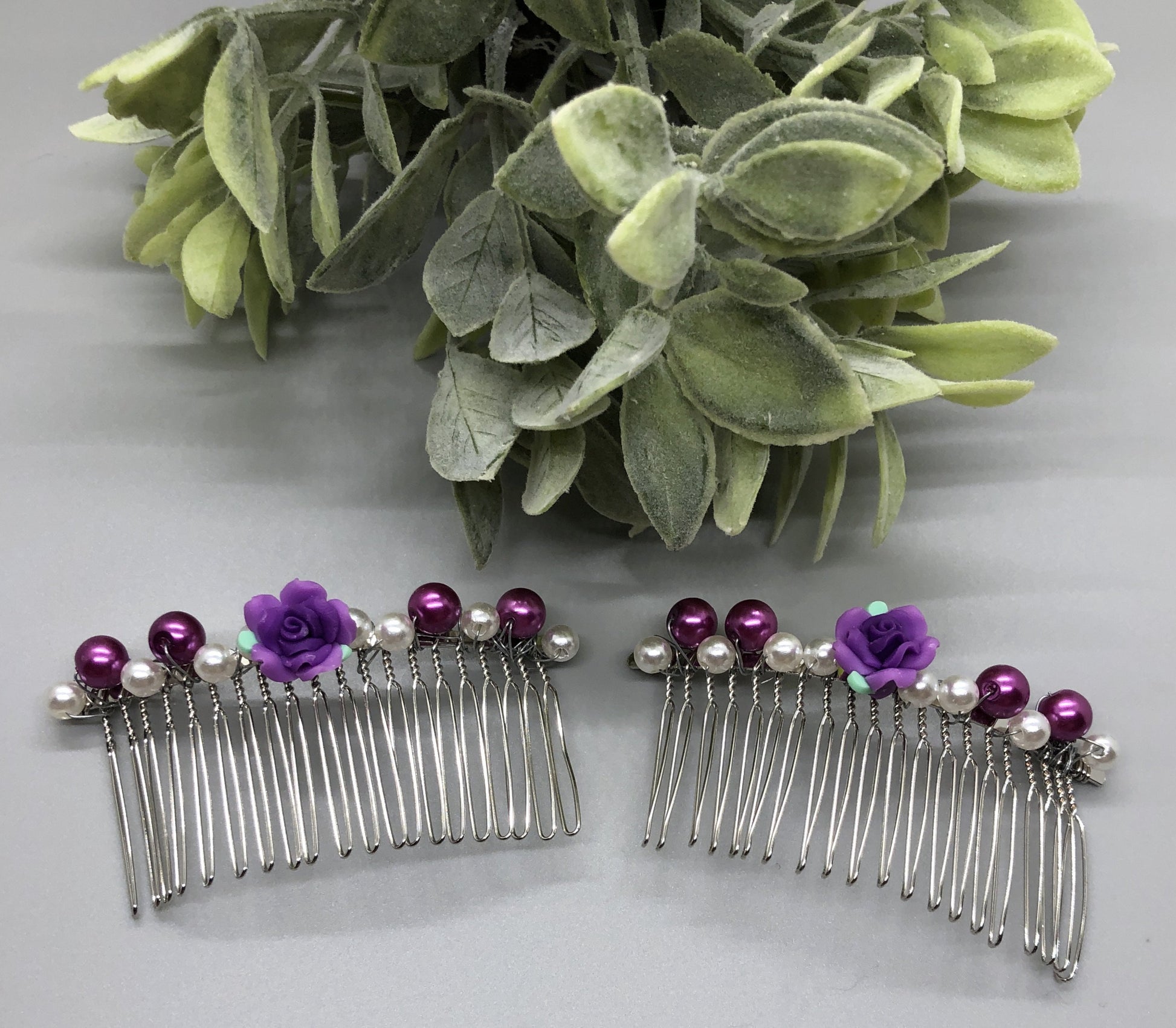 White Purple Flower Faux Beaded Pearls on a Silver Tone Metal Hair Comb 2pc Set 3.5"Handmade By Hairdazzel Retro Bridal Party Prom Birthday