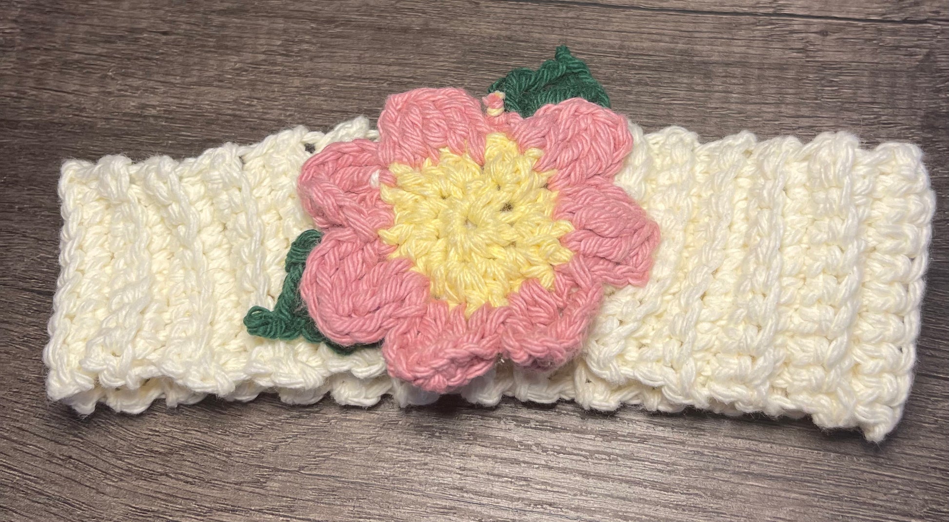 Handmade cream white pink floral headband 100% cotton girls headband gift flowers 18” strechable soft gentle headband