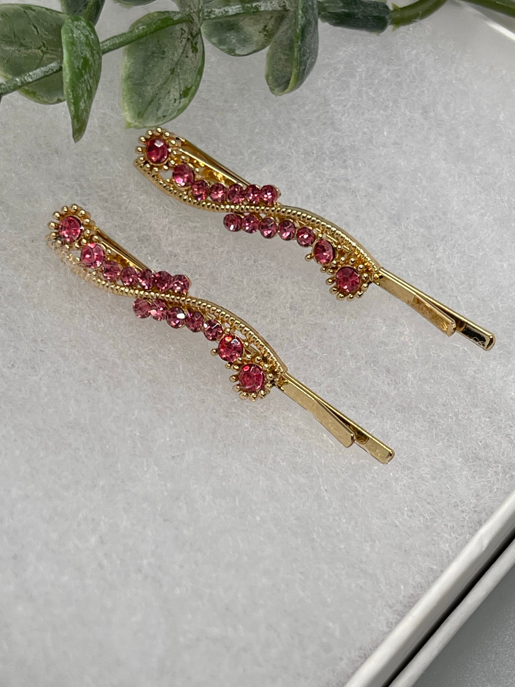 Pink crystal rhinestone approximately 2.5” gold tone hair pins 2 pc set wedding bridal shower engagement formal princess accessory accessories