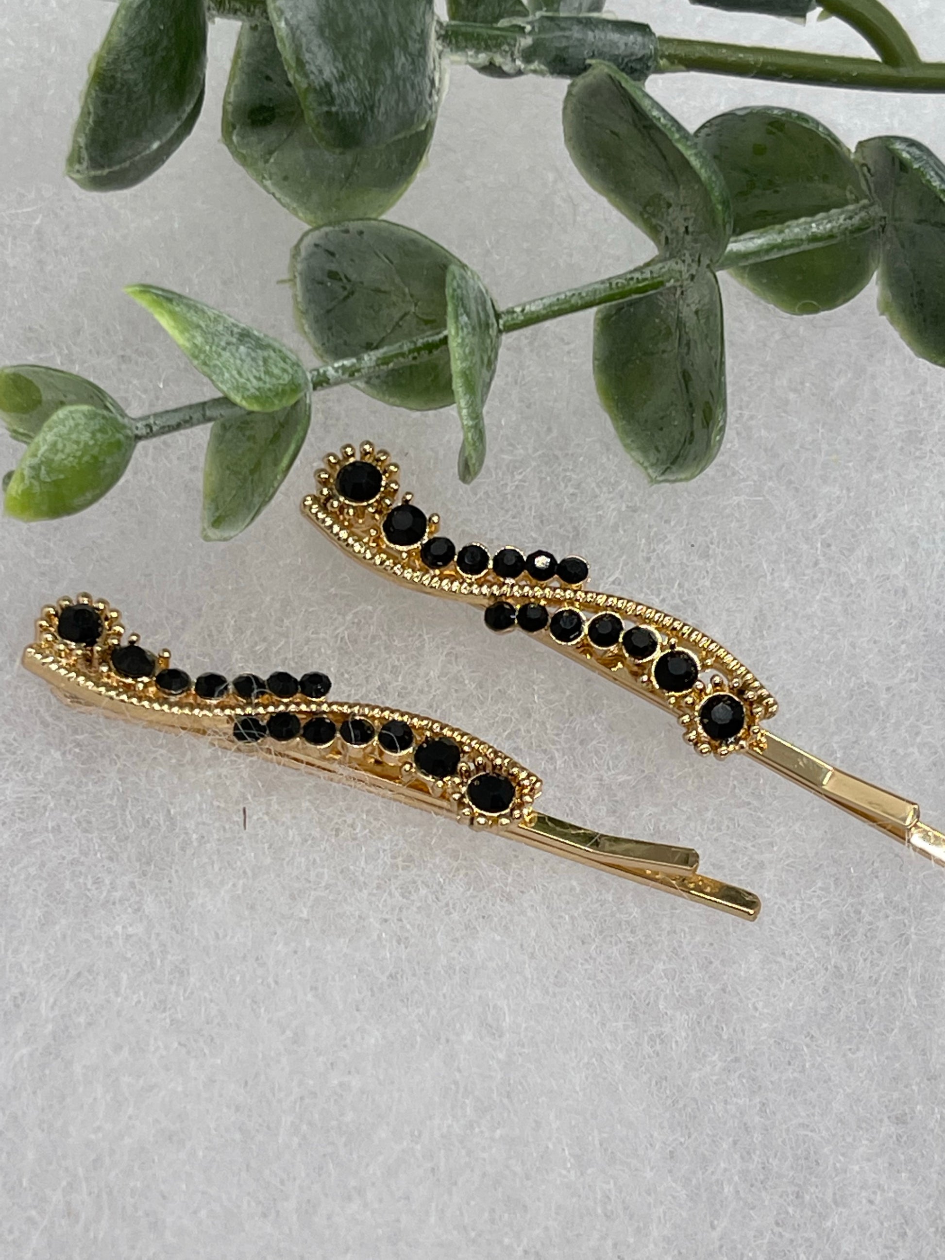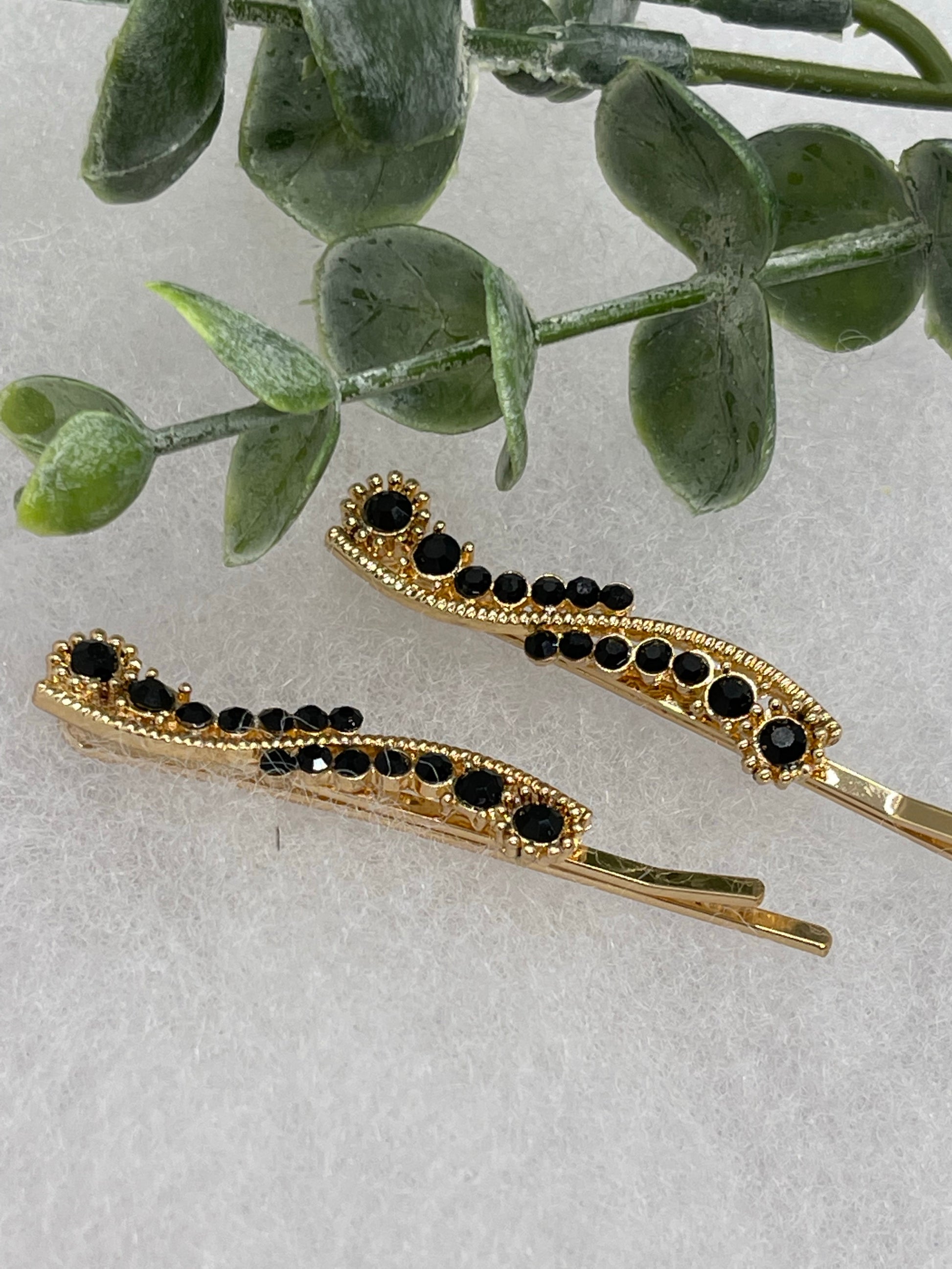 Black crystal rhinestone approximately 2.0” gold tone hair pins 2 pc set wedding bridal shower engagement formal princess accessory accessories