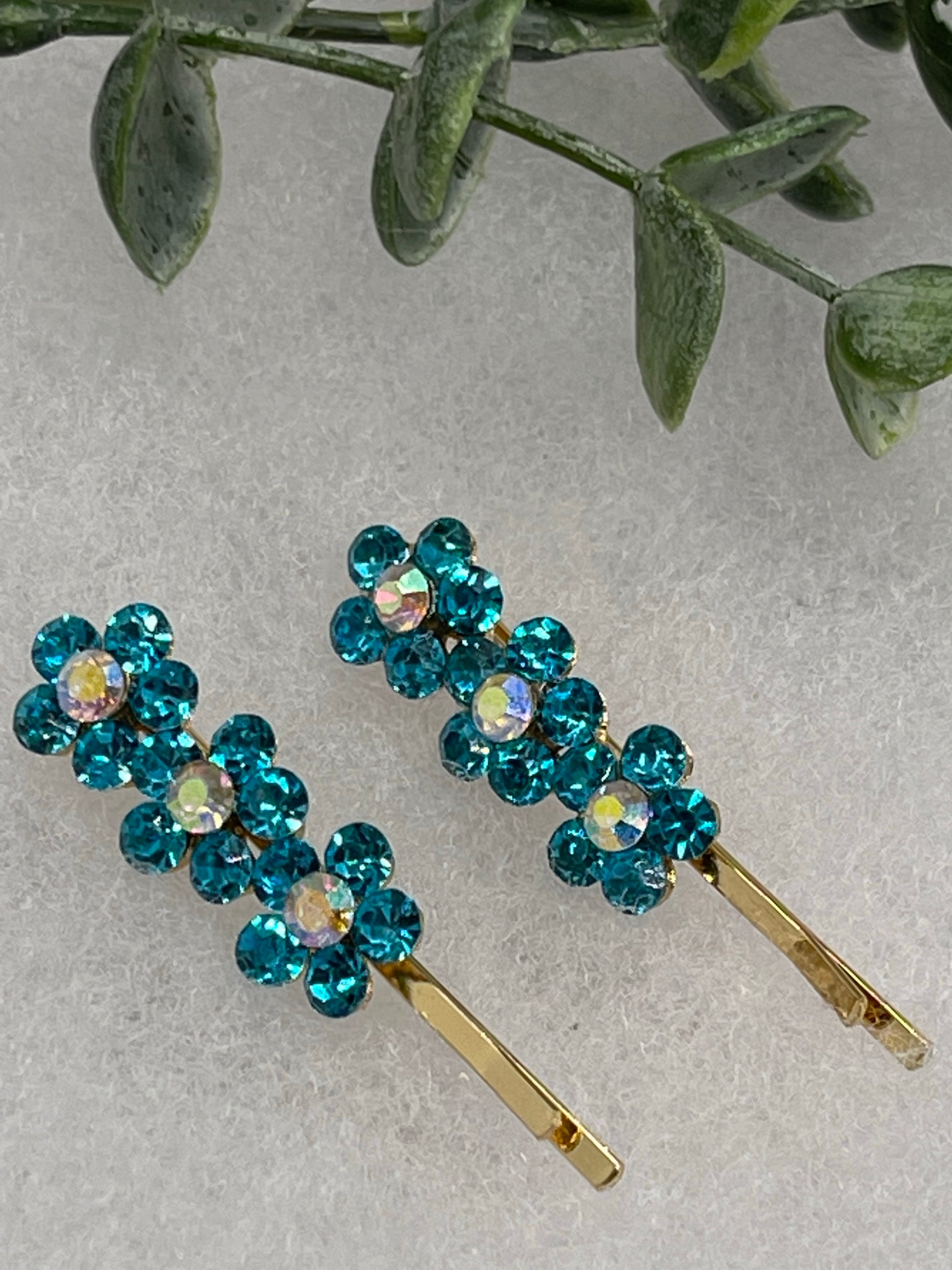 Teal blue crystal rhinestone flowers approximately 2.0” gold tone hair pins 2 pc set wedding bridal shower engagement formal princess accessory accessories