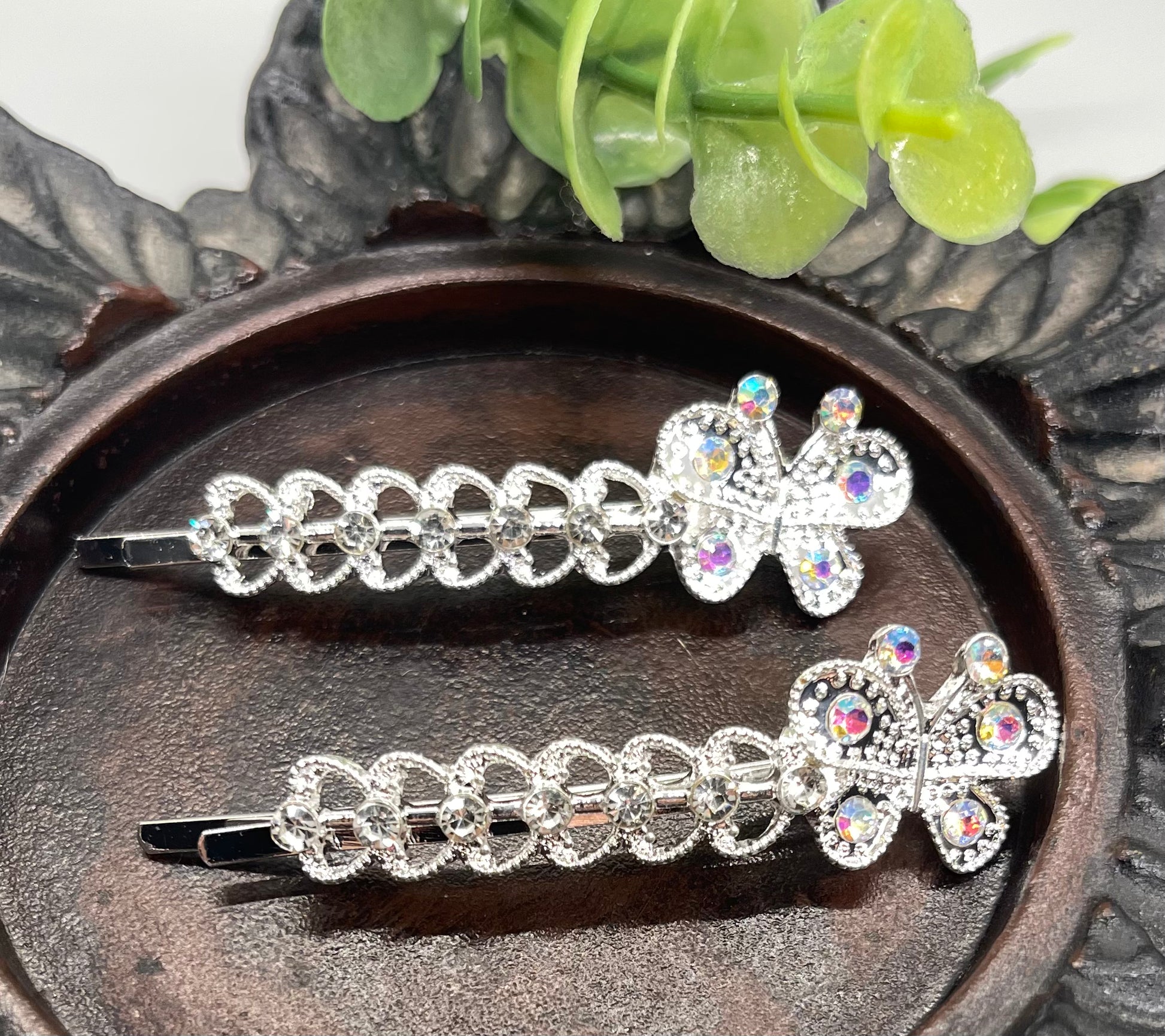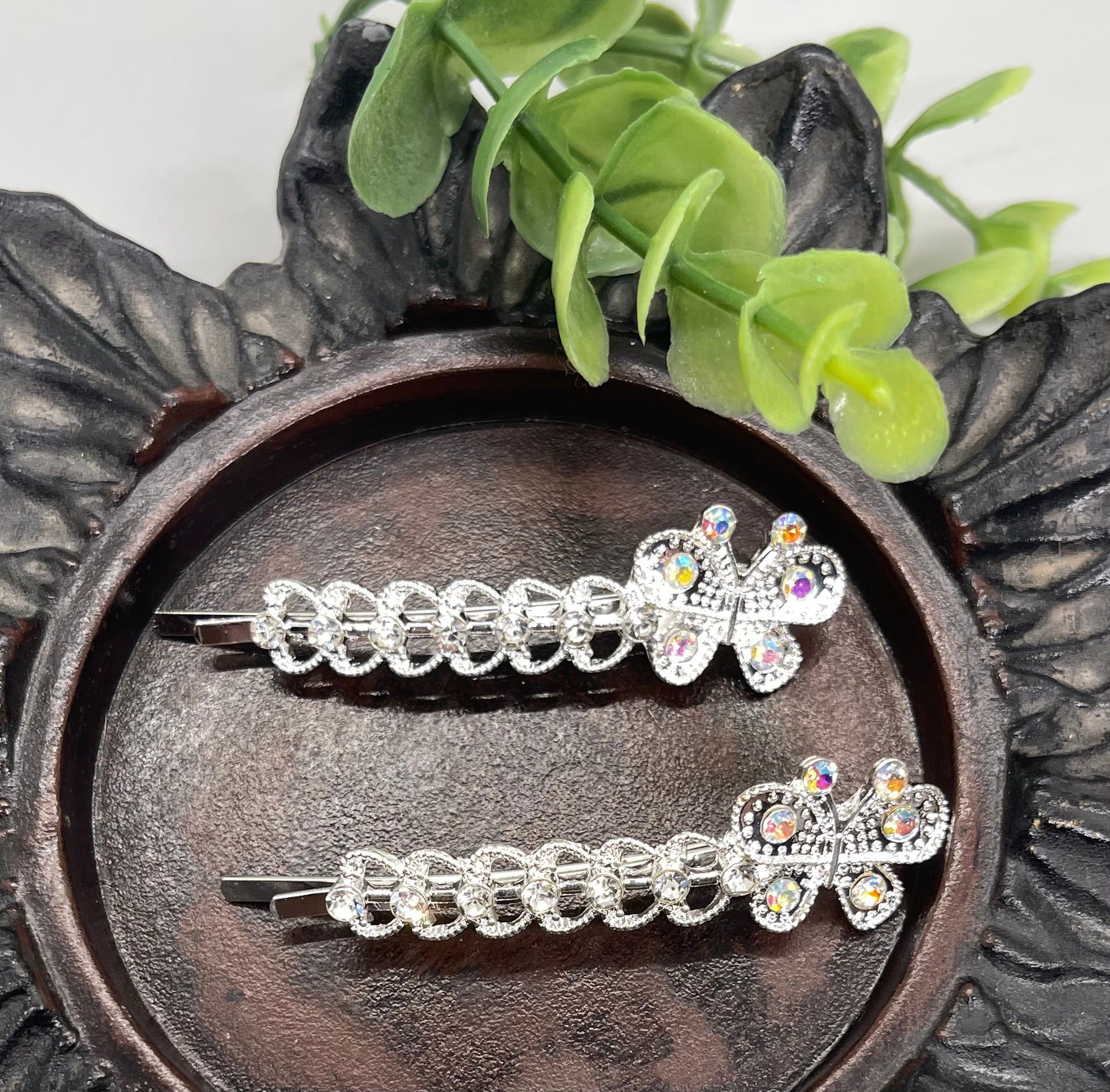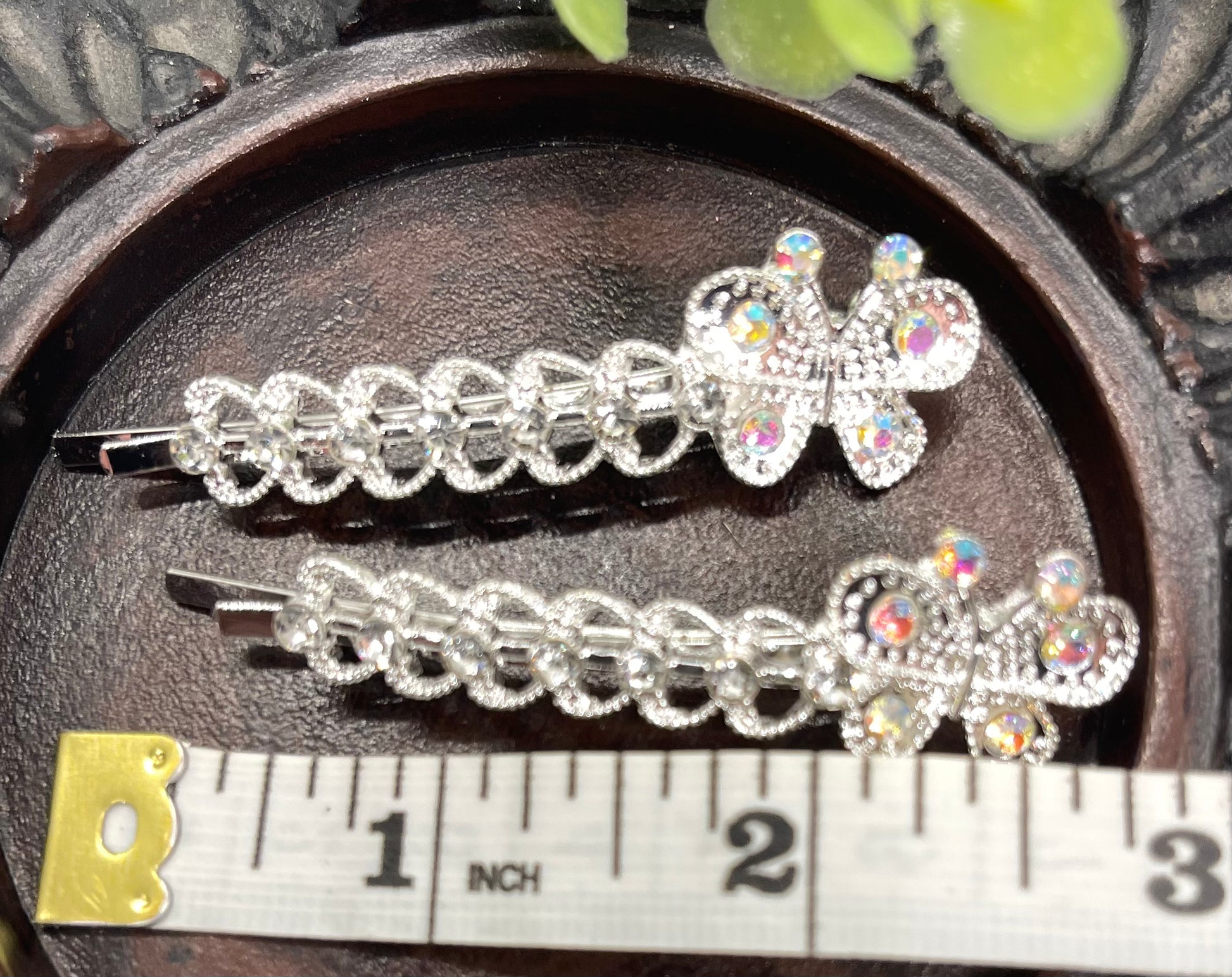 2 pc Butterfly iridescent Crystal rhinestone silver tone hair pins 2 pc set bridal Wedding shower prom sweet 16 birthday hair accessories