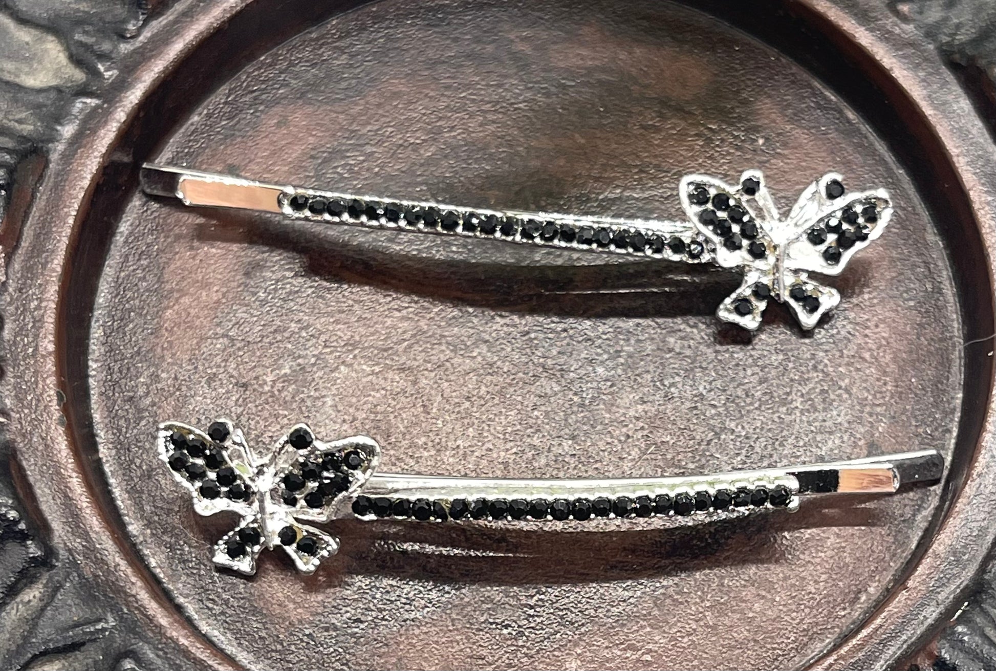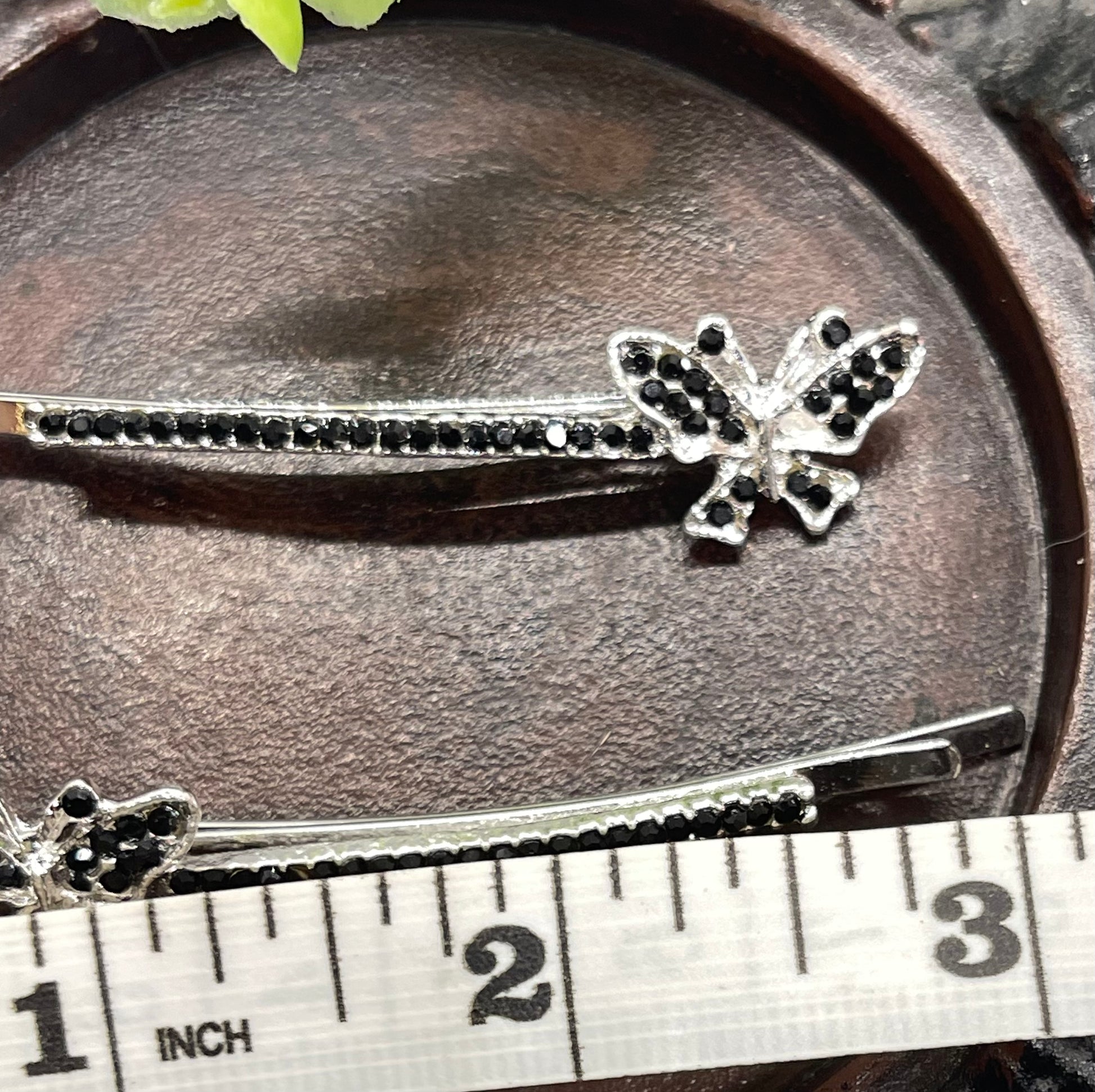 Black Crystal rhinestone butterfly silver tone hair pins 2 pc set bridal Wedding shower prom sweet 16 birthday hair accessories