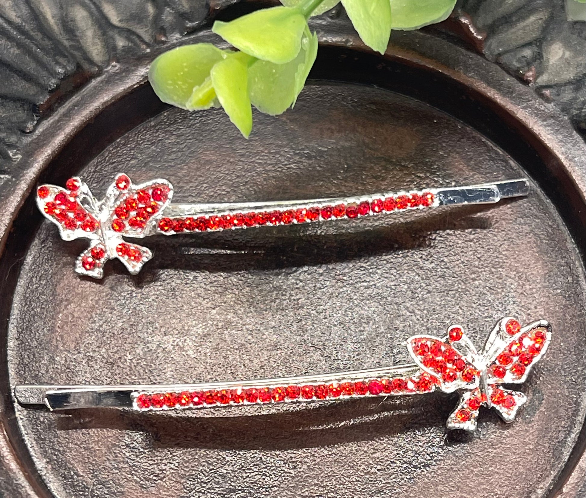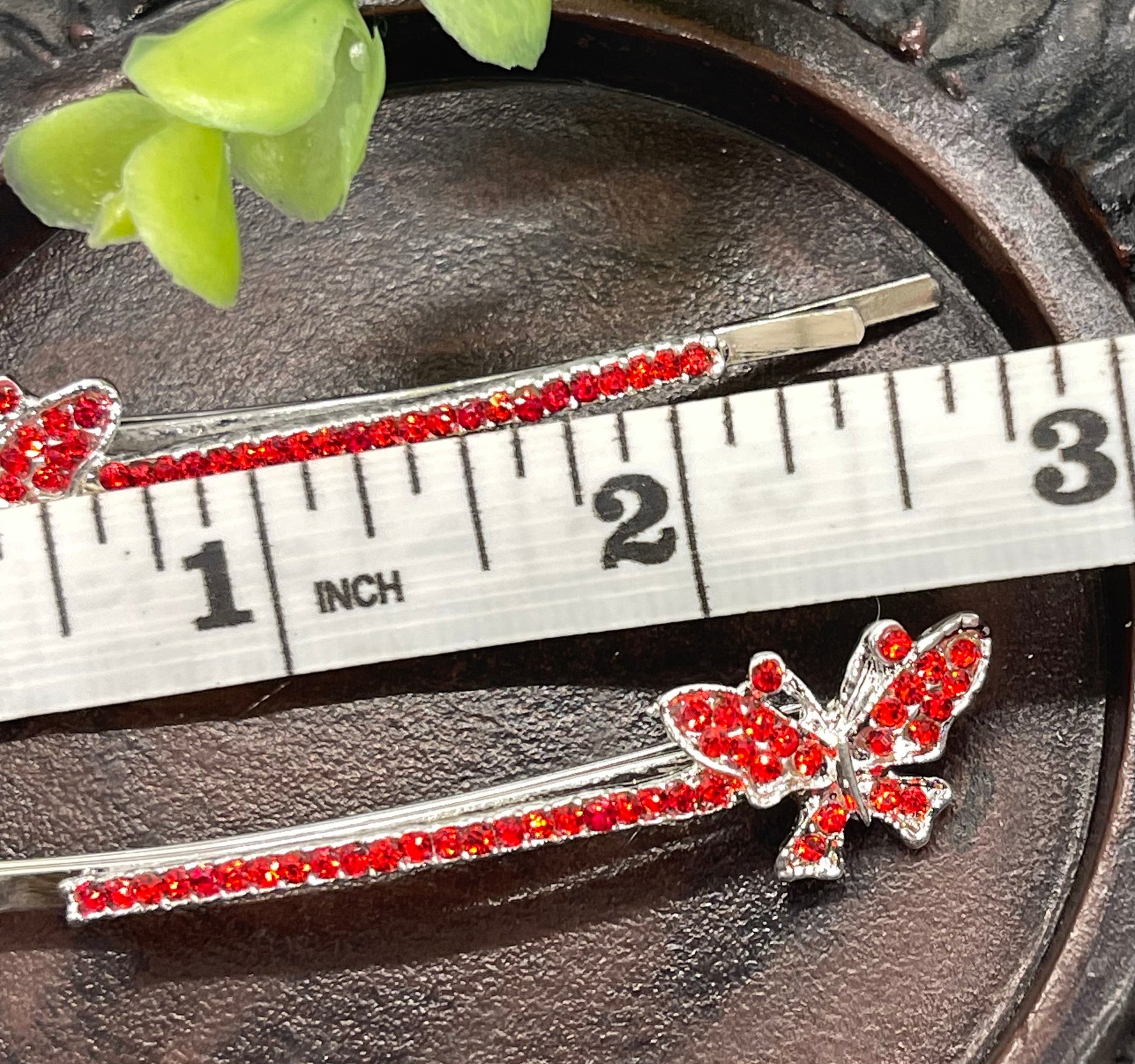 Ruby Red Crystal rhinestone butterfly silver tone hair pins 2 pc set bridal Wedding shower prom sweet 16 birthday hair accessories