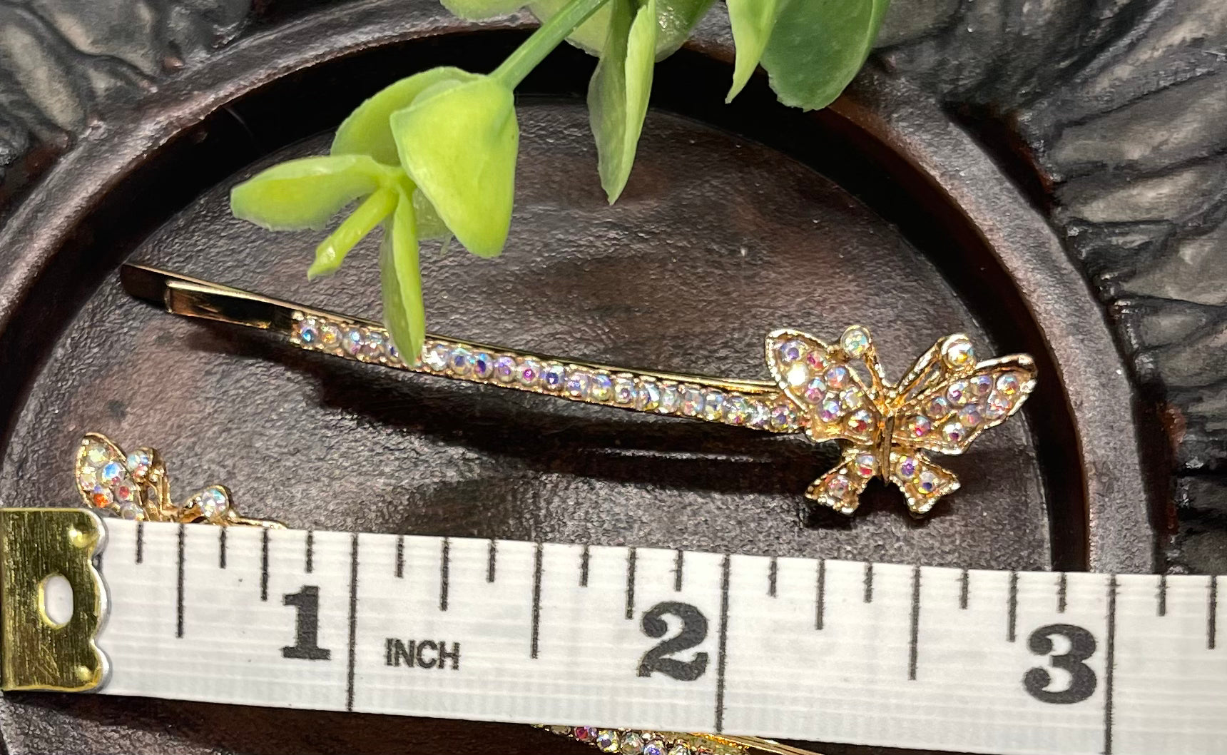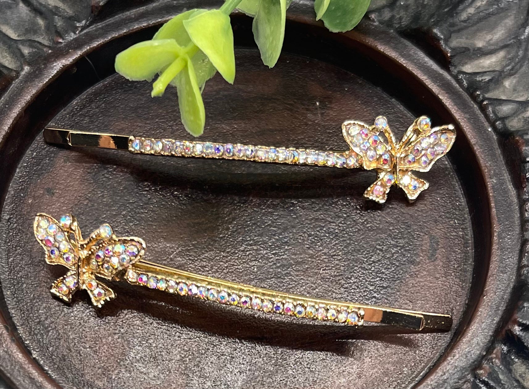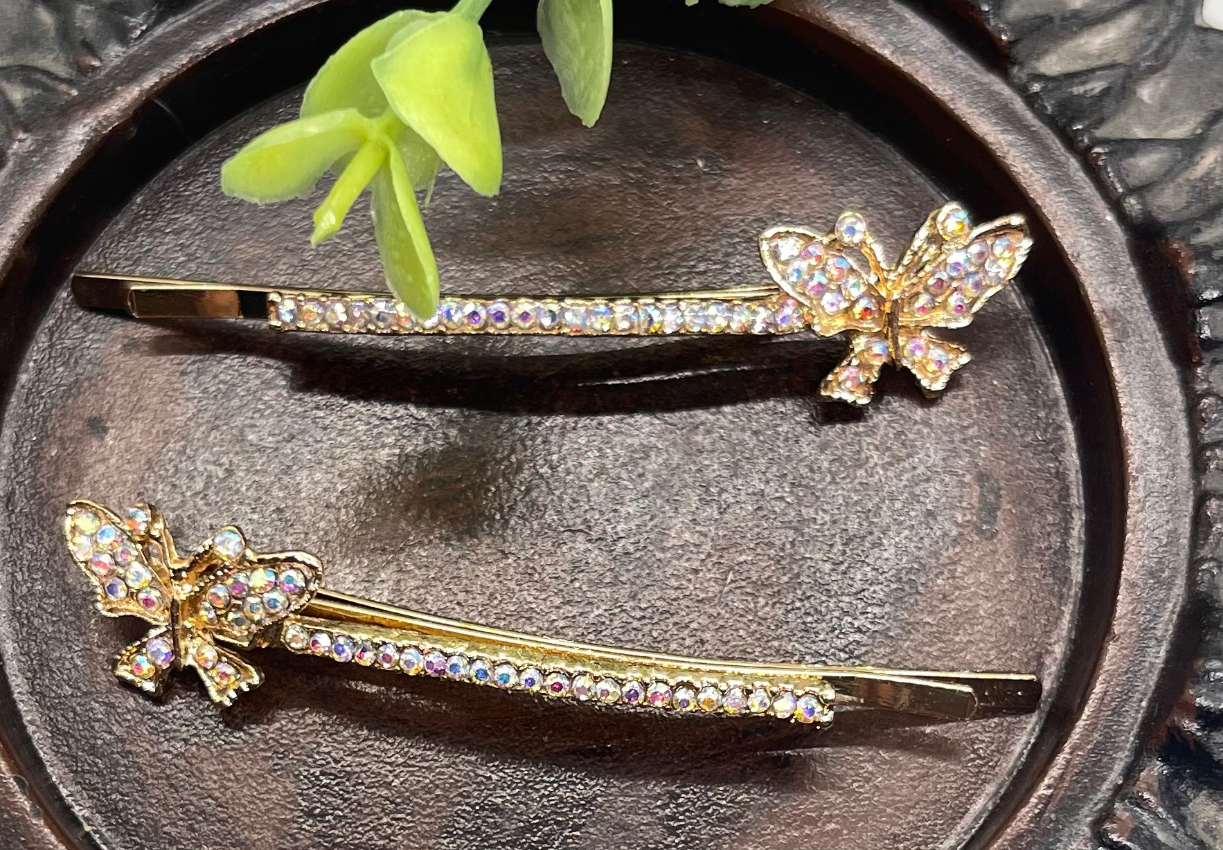 Iridescent Crystal rhinestone butterfly silver tone hair pins 2 pc set bridal Wedding shower prom sweet 16 birthday hair accessories