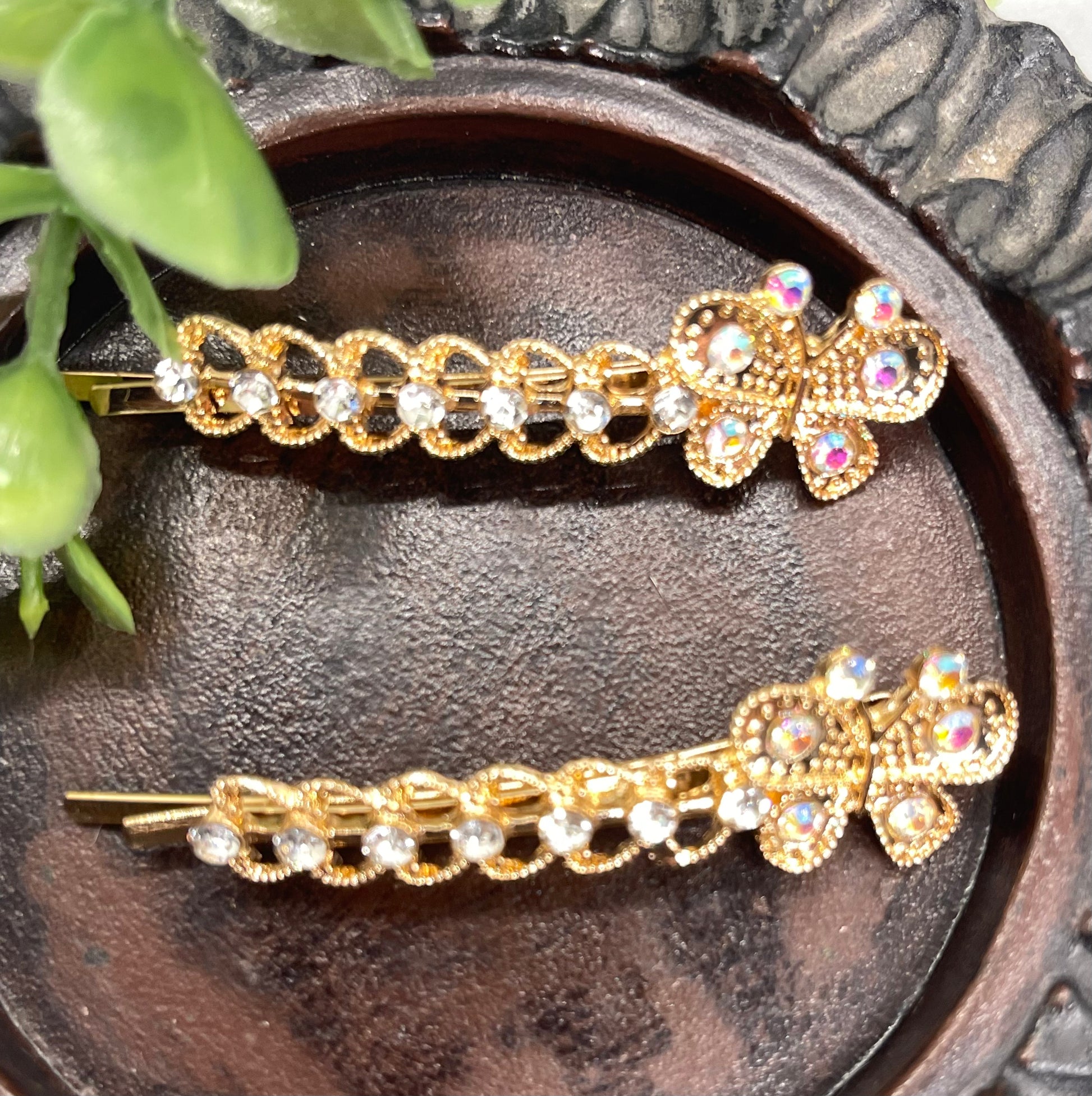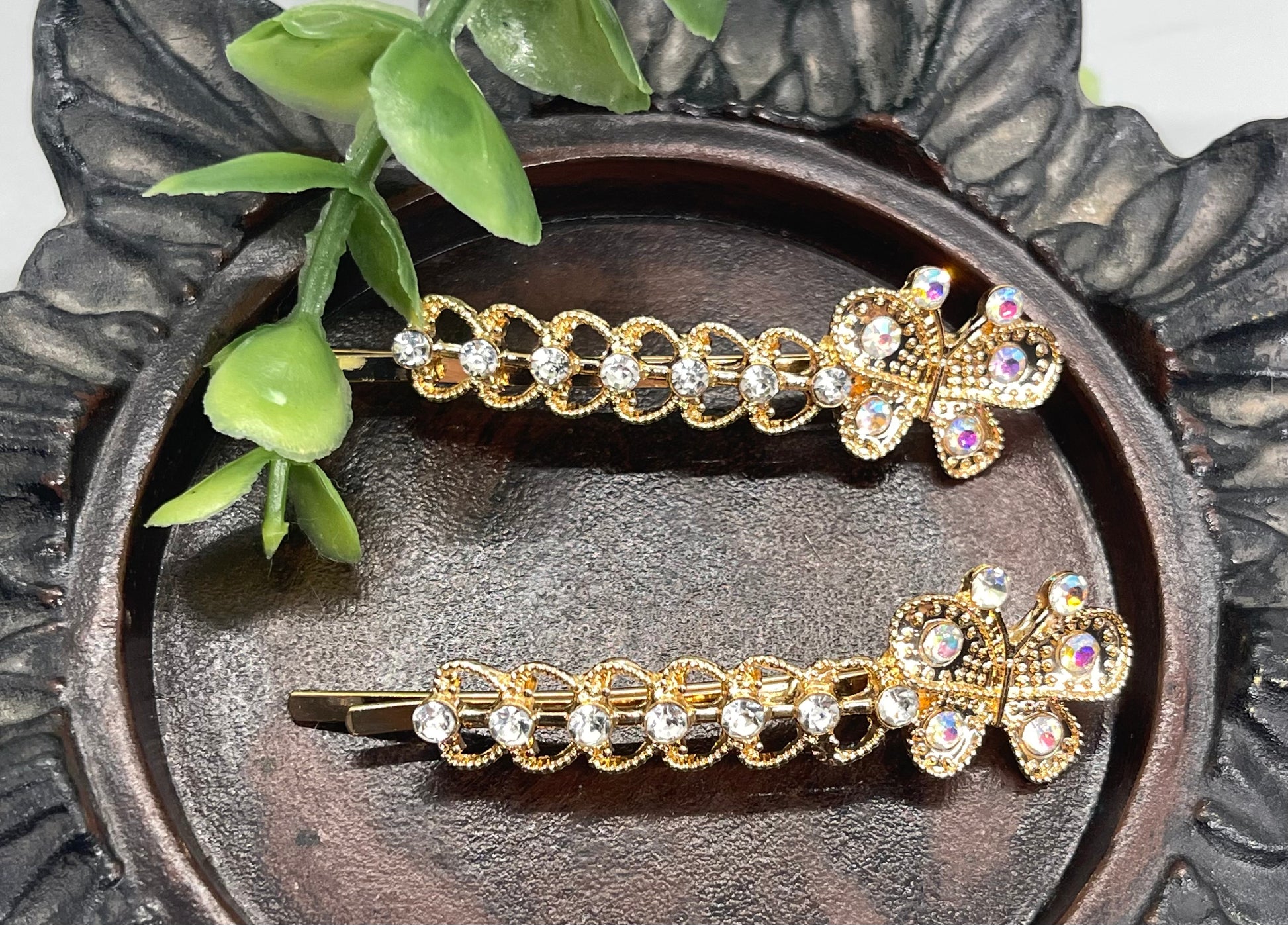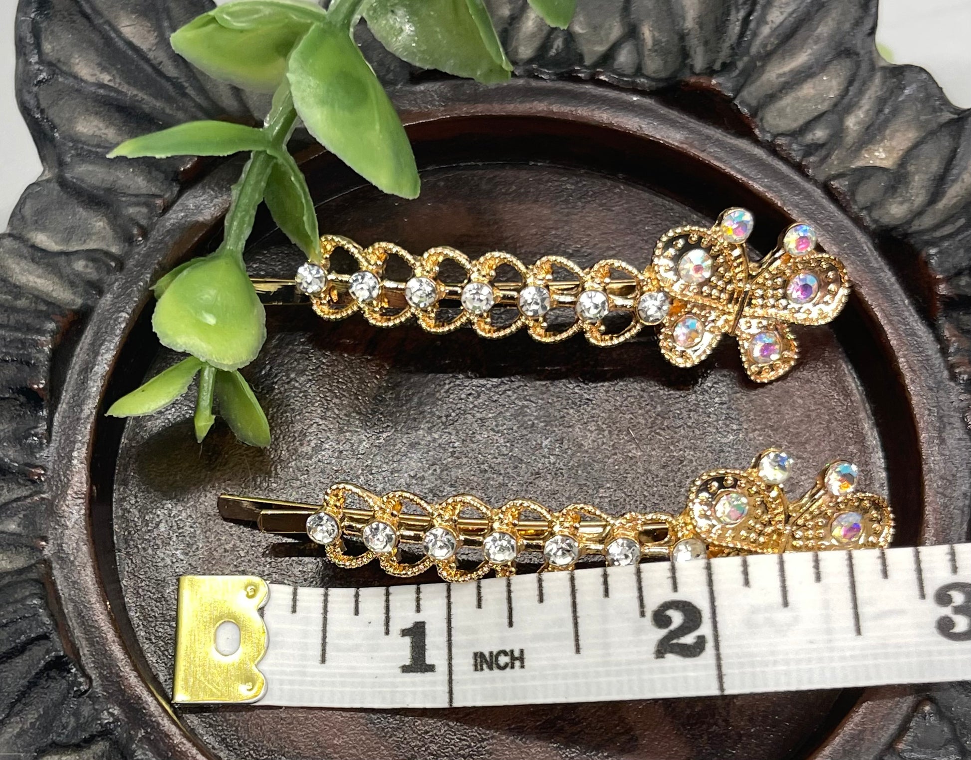 2 pc Butterfly iridescent Crystal rhinestone gold tone hair pins 2 pc set bridal Wedding shower prom sweet 16 birthday hair accessories