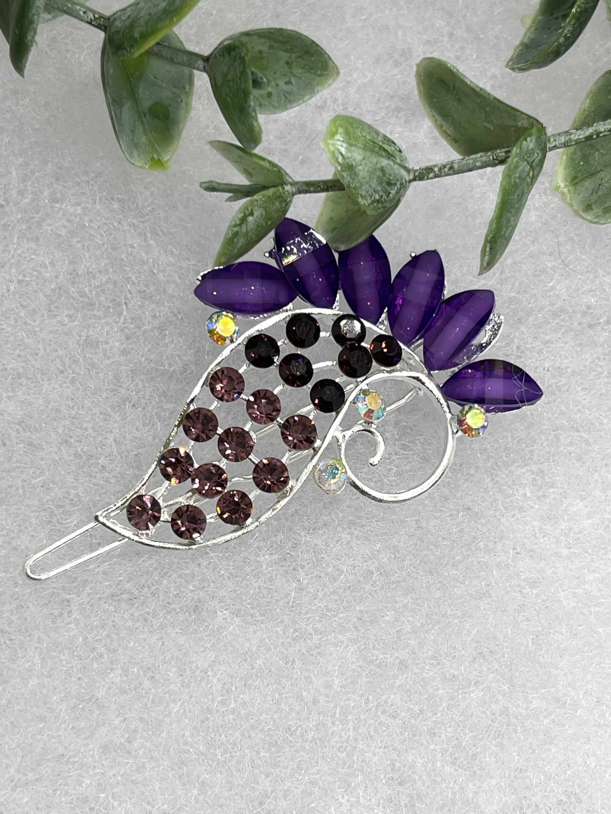 Purple Crystal Rhinestone peacock hair clip approximately 3.0”Metal silver tone formal hair accessory gift wedding bridal engagement