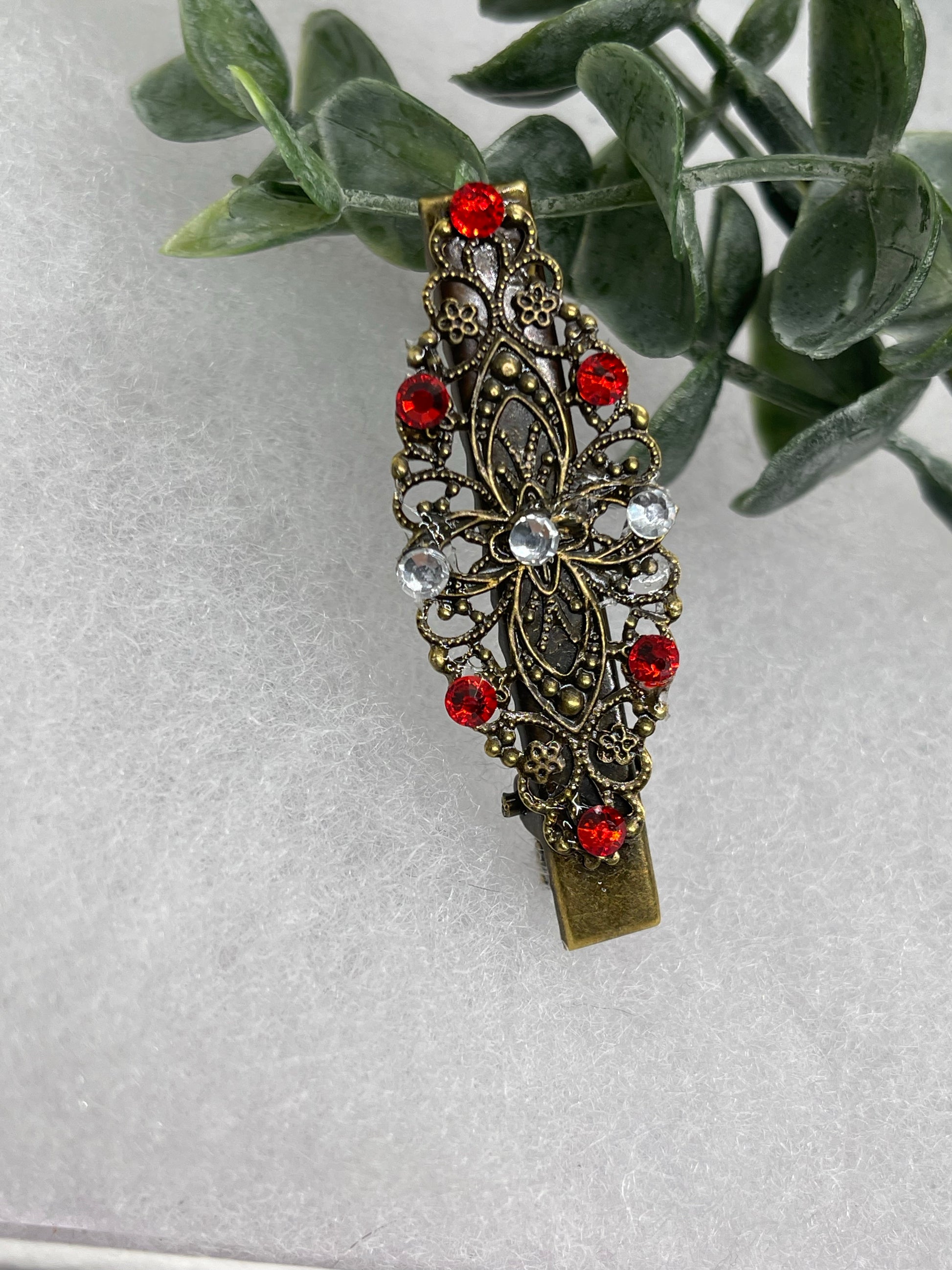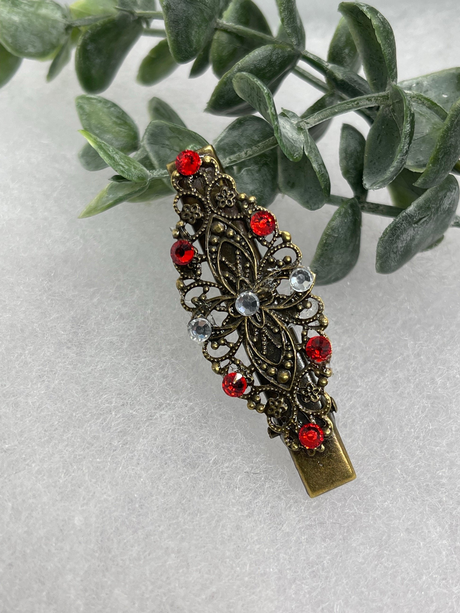 Red Crystal vintage antique style leaf hair alligator clip approximately 2.5” long Handmade hair accessory bridal wedding Retro