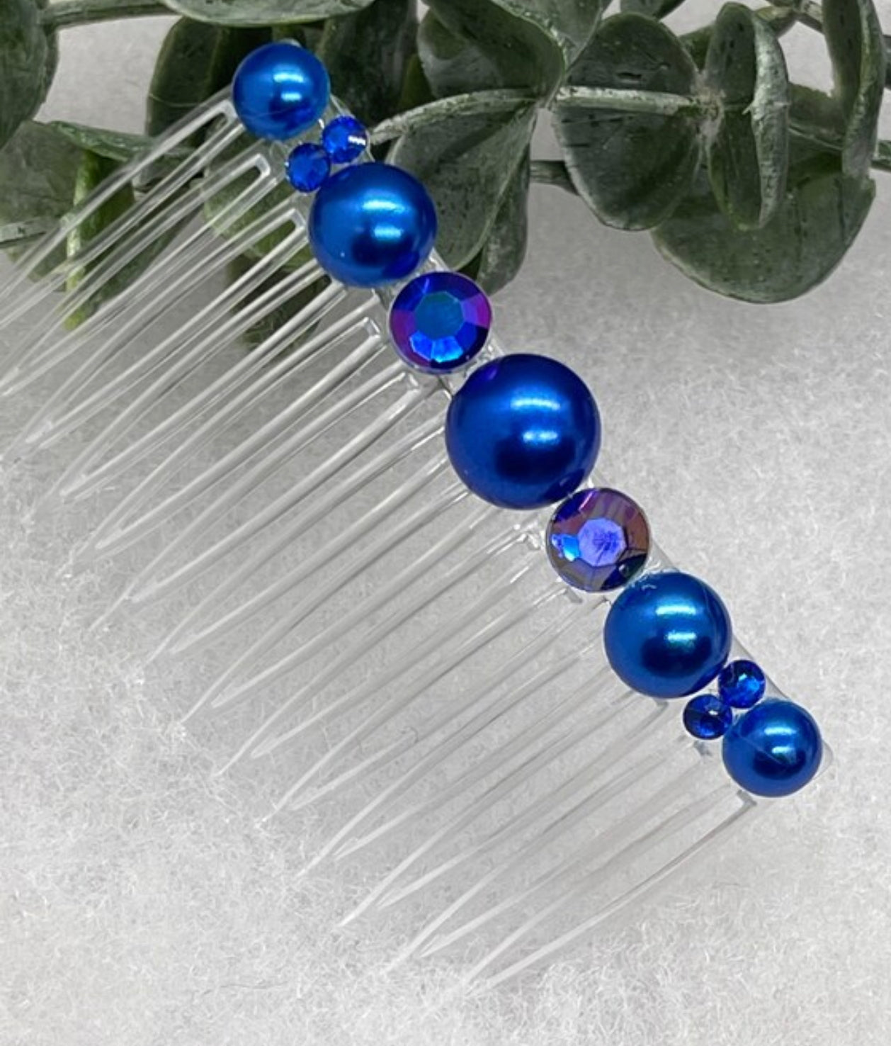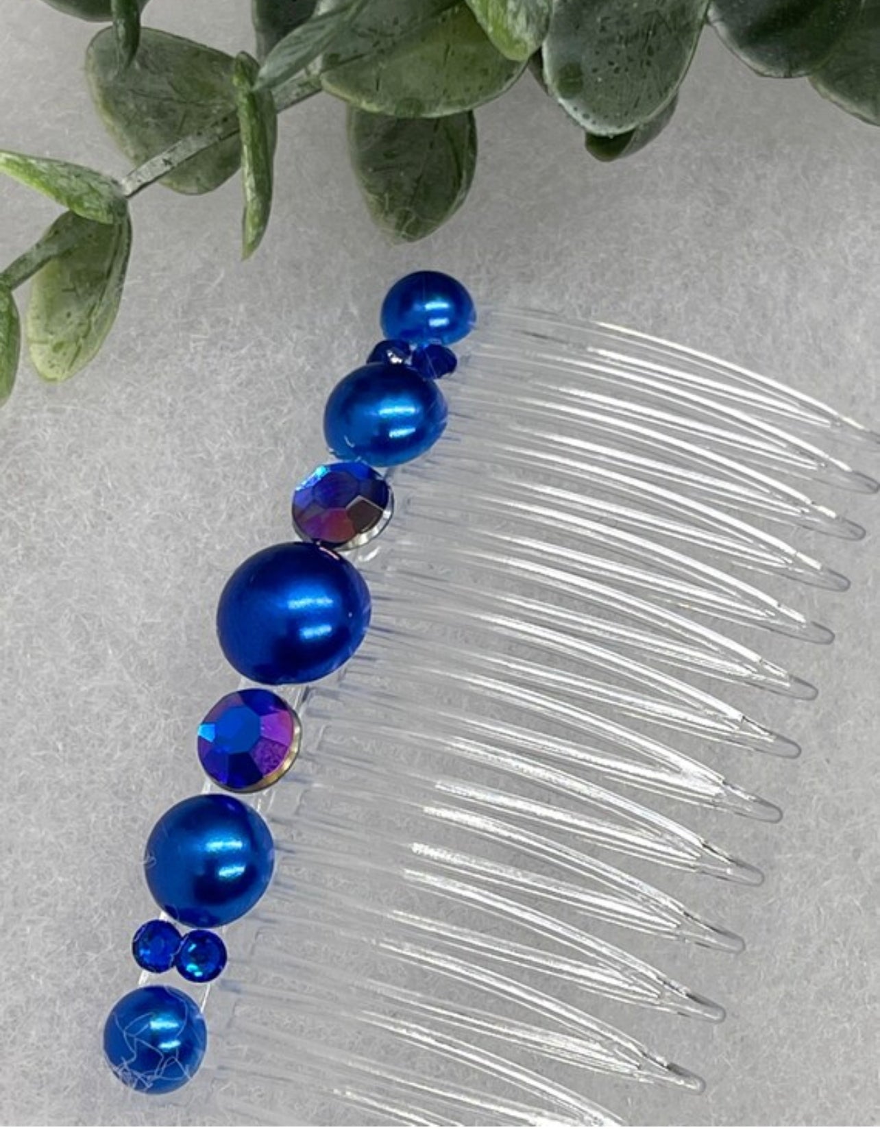 Royal blue faux Pearl crystal side comb approximately 3.5” long plastic hair accessory bridal wedding Retro