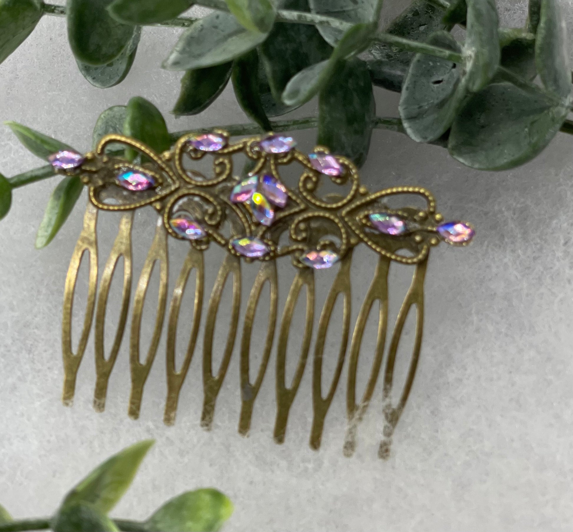 Lavender iridescent gel crystal vintage style antique hair accessories gift birthday event formal bridesmaid 2.5” Metal side Comb #255