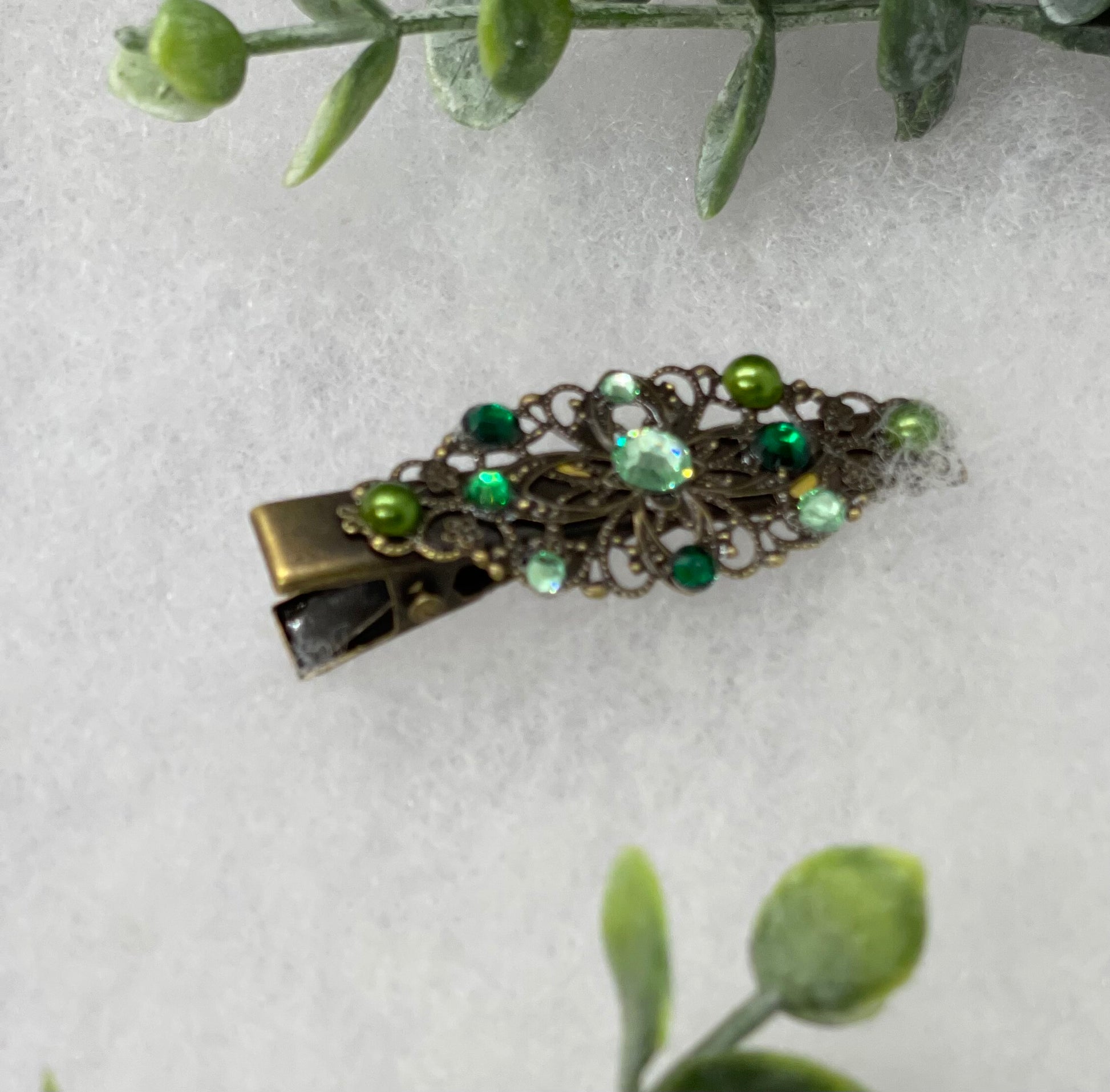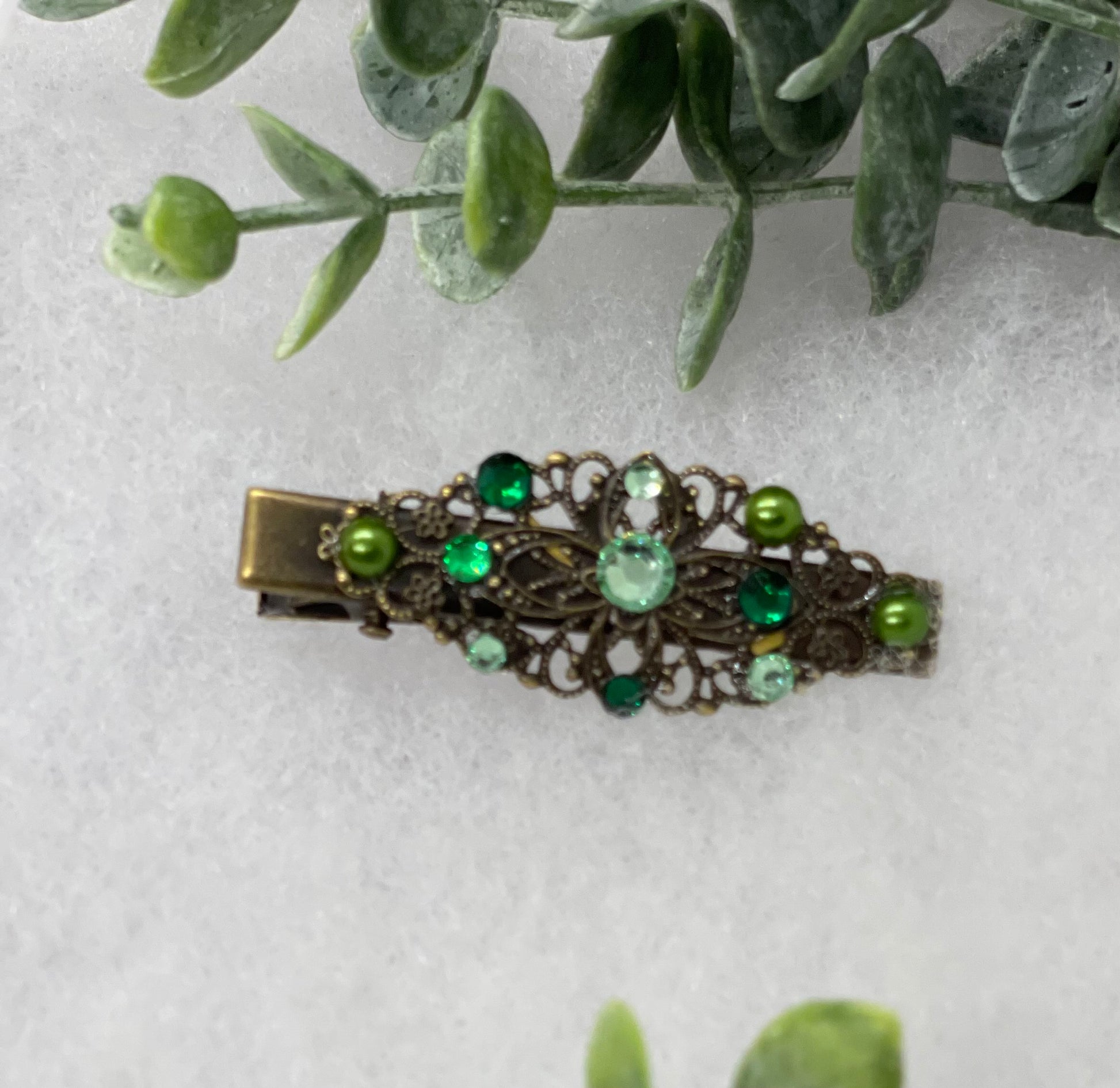 Green Pearl Crystal vintage antique style leaf hair alligator clip approximately 2.5” long Handmade hair accessory bridal wedding Retro