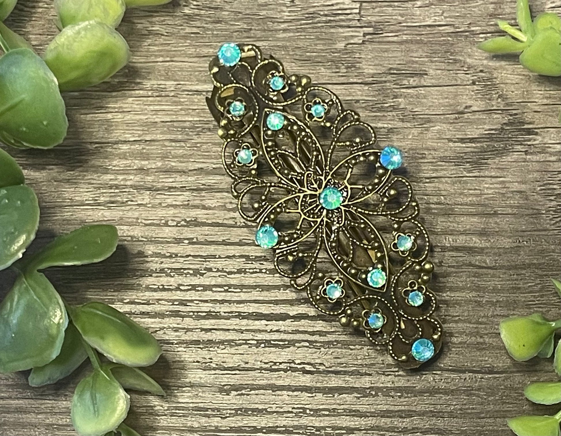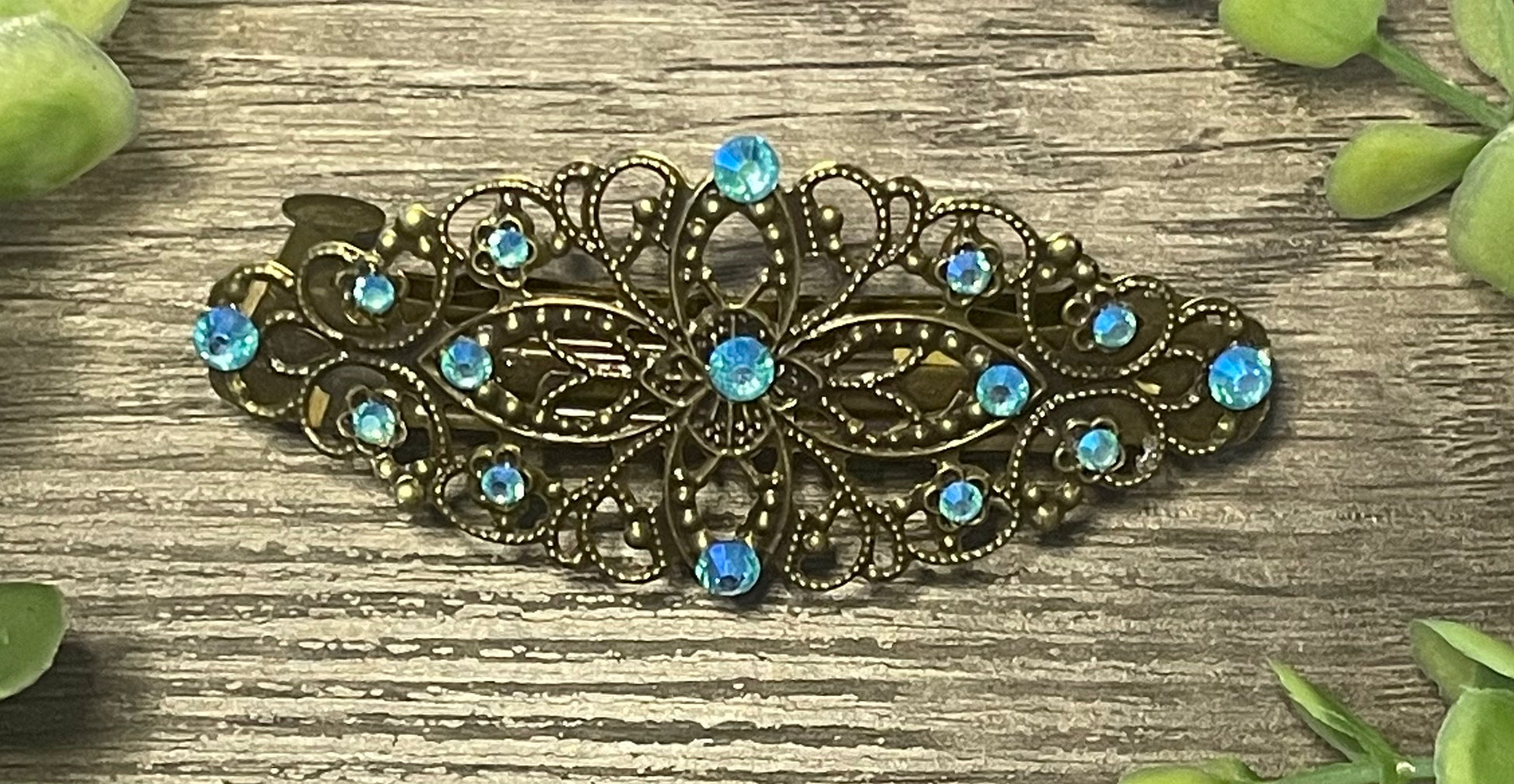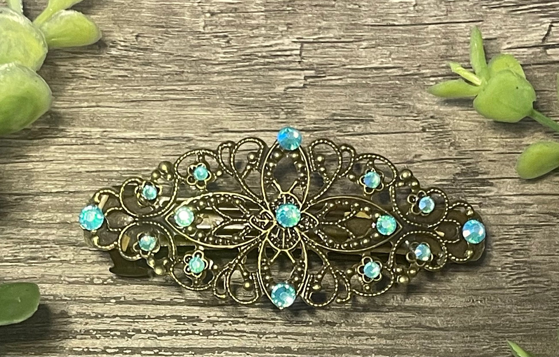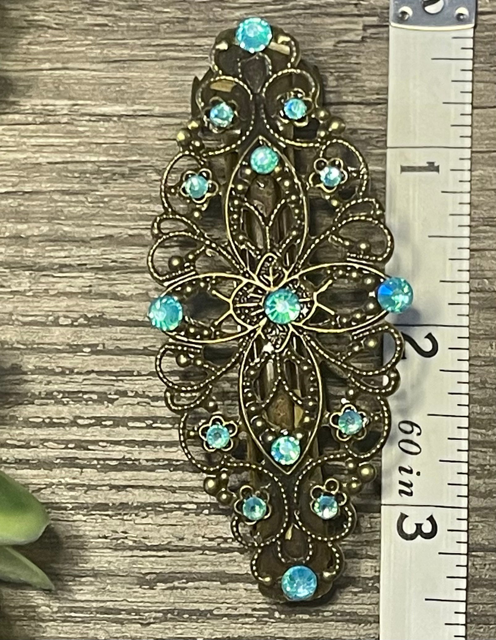 Aqua crystal barrette Vintage Style 3.5”antique tone Metal bridal wedding shower birthday princess prom gift accessories