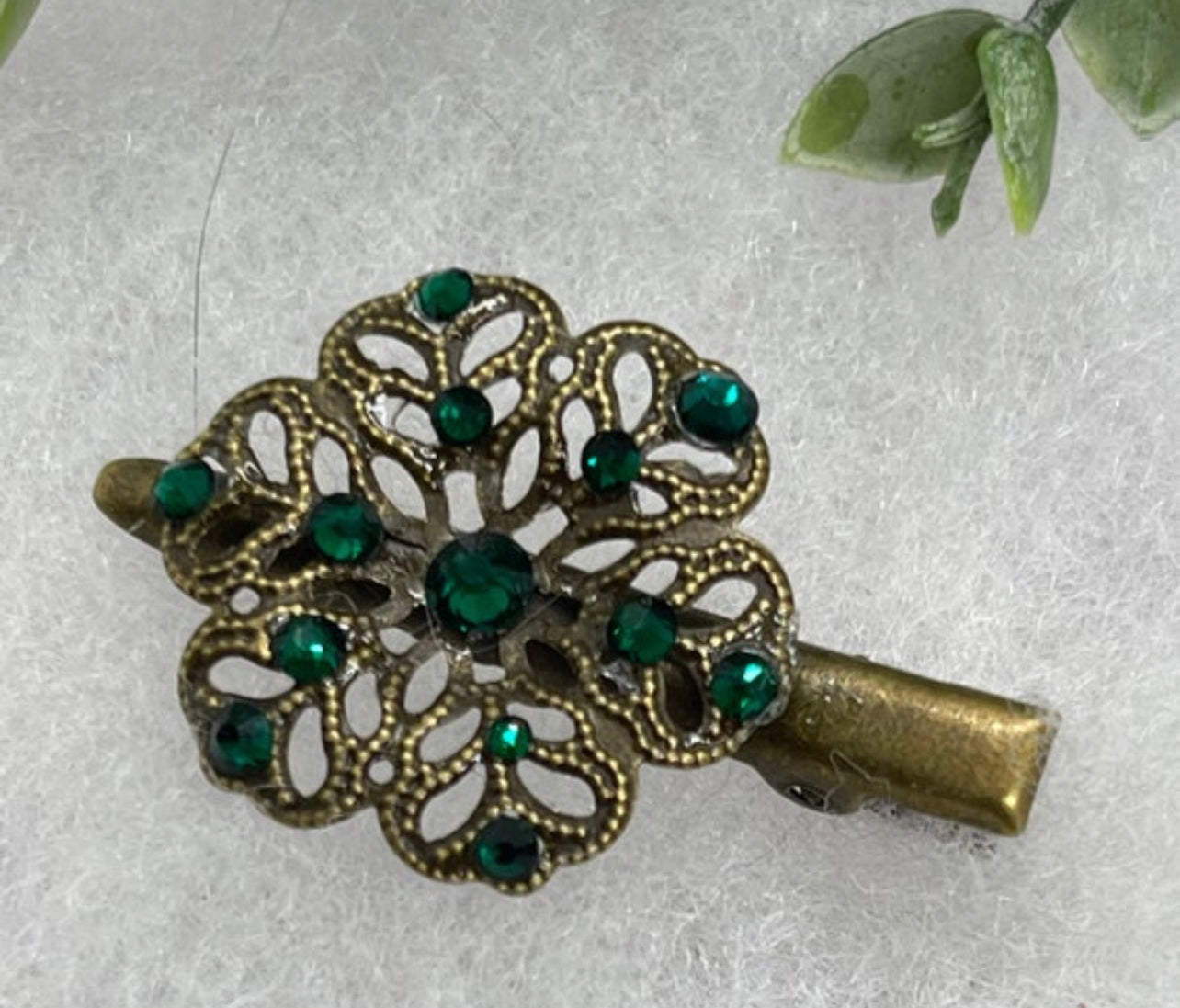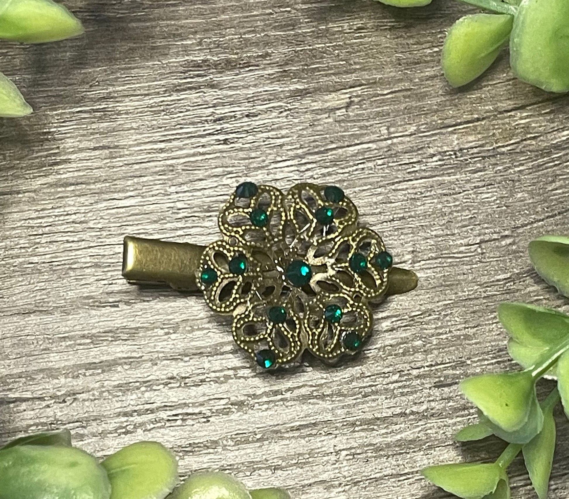 Emerald green Flower crystal rhinestone 2..0” antique vintage style alligator clip wedding shower bridesmaid