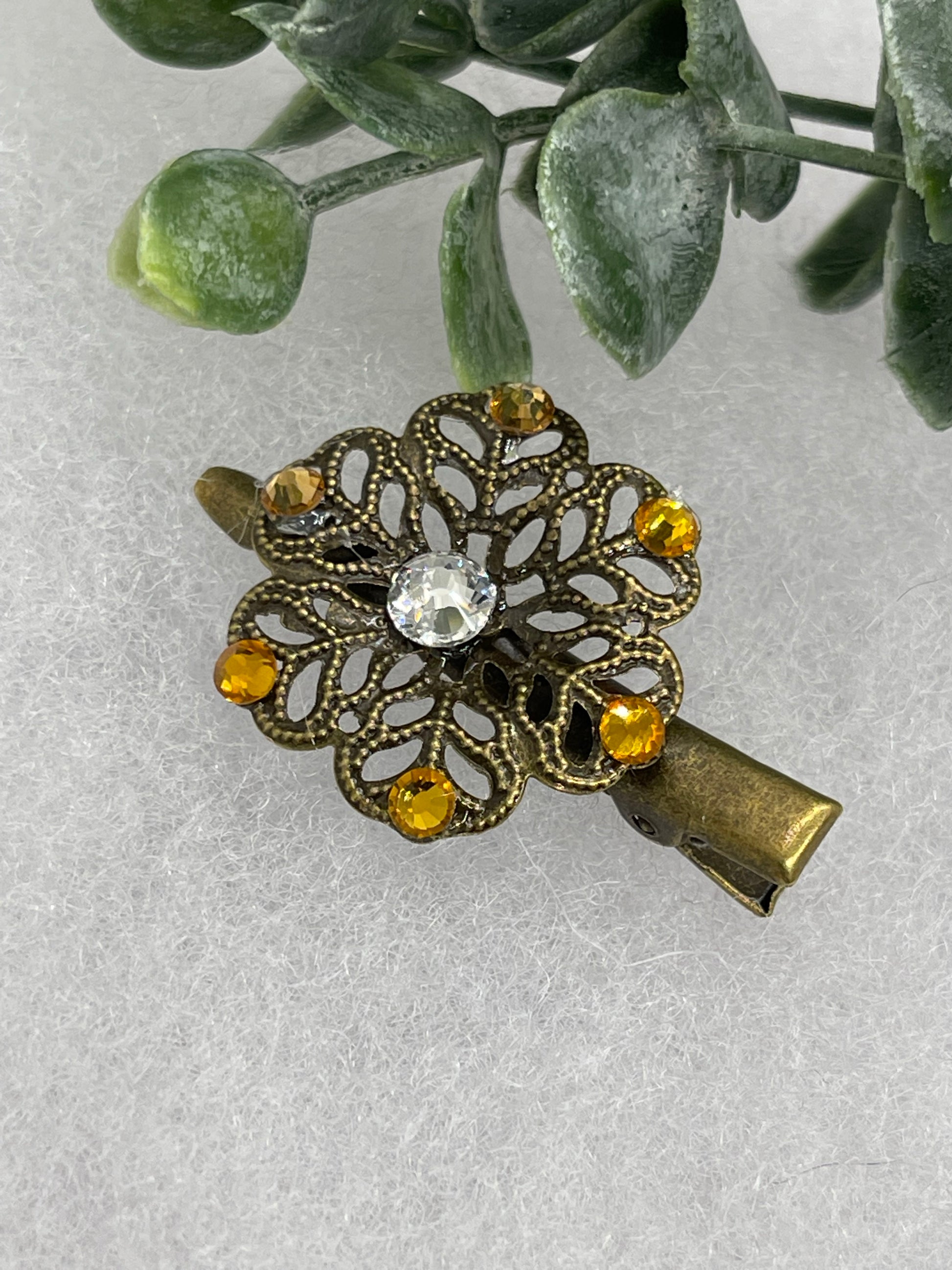 Yellow crystal rhinestone flower 2.0”alligator clip Antique vintage style bridal Wedding shower sweet 16 birthday princess bridesmaid hair accessory