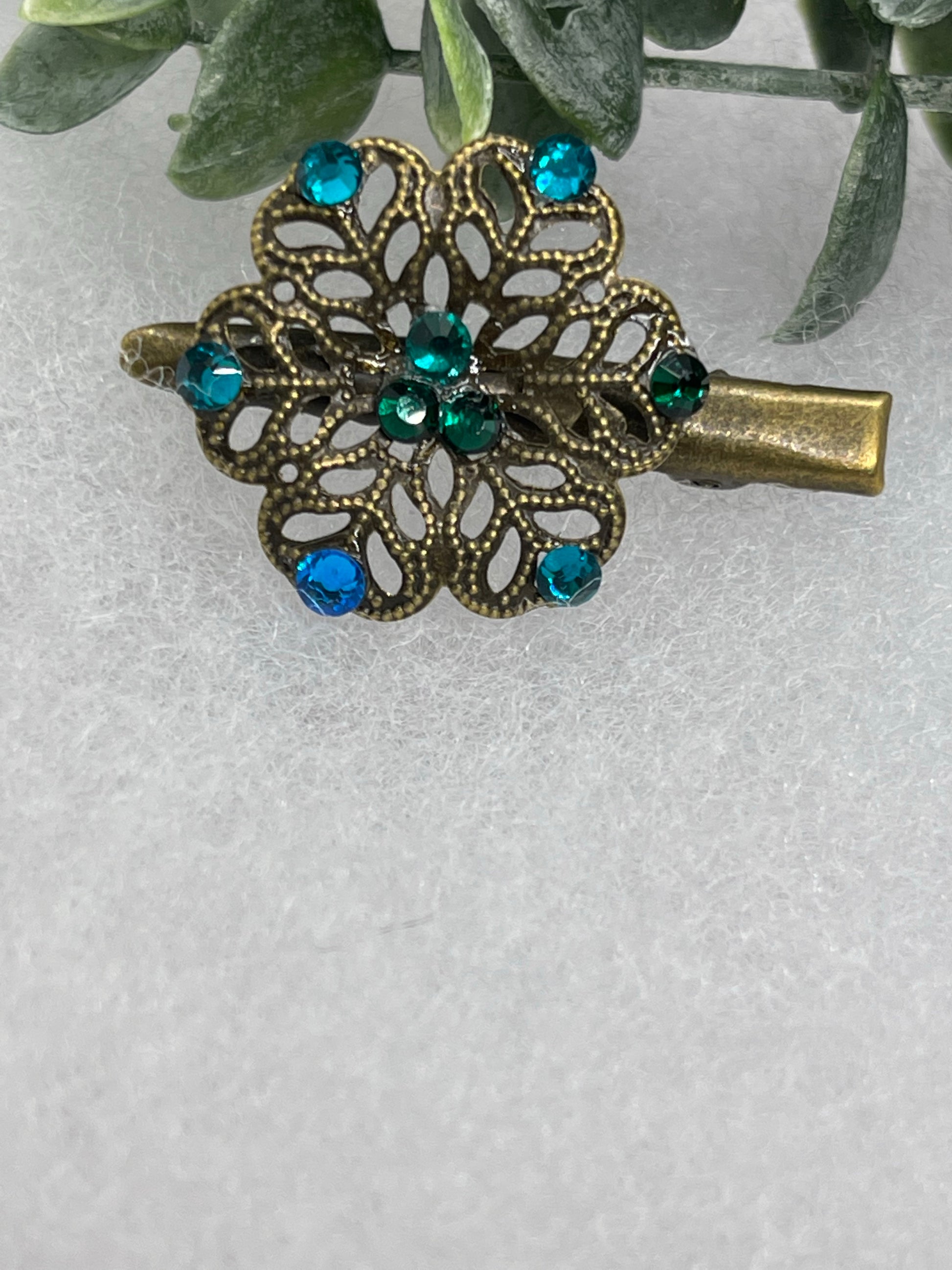 Teal Blue crystal rhinestone flower 2.0”alligator clip Antique vintage style bridal Wedding shower