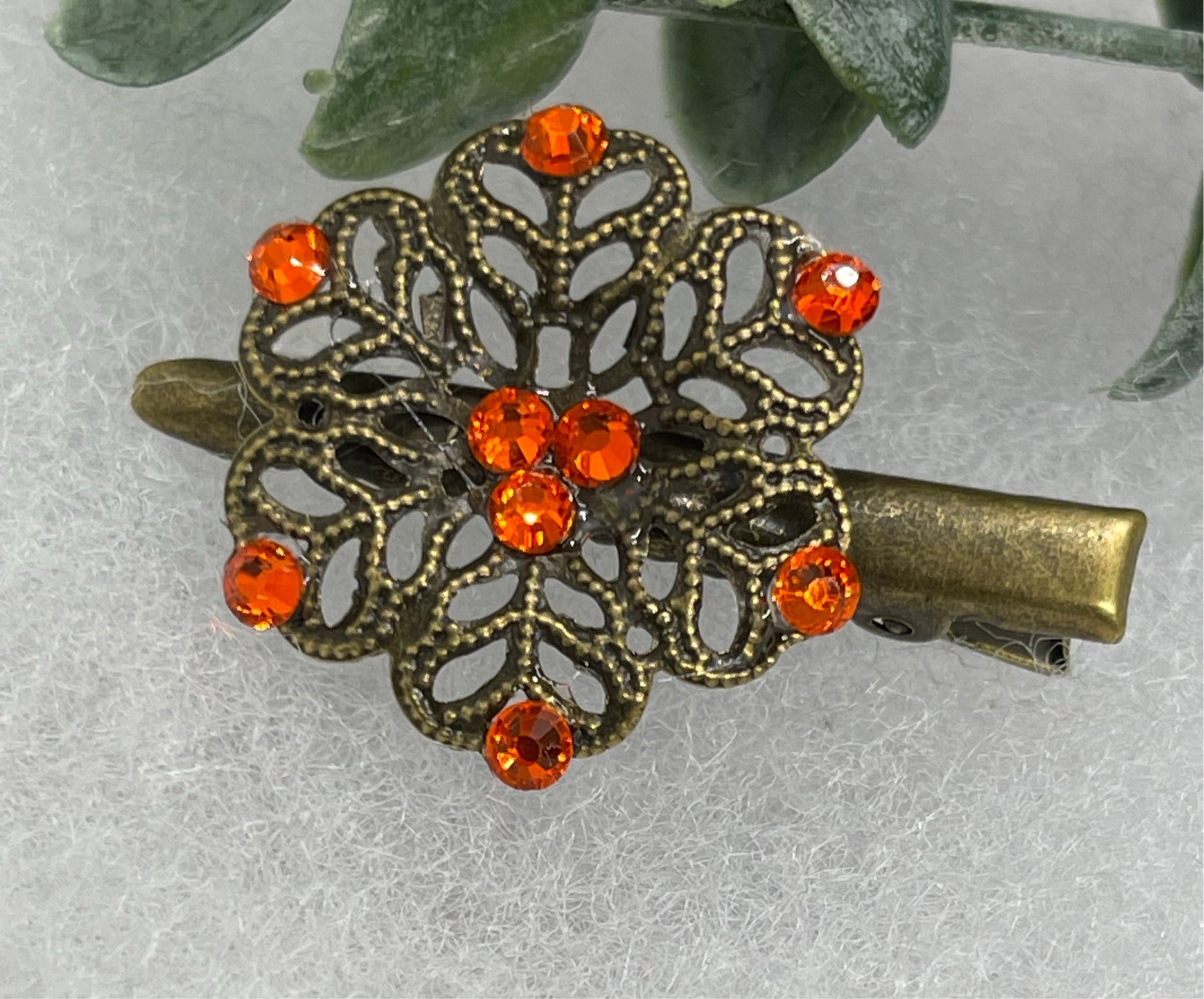 Orange crystal rhinestone flower 2.0”alligator clip Antique vintage style bridal Wedding shower sweet 16 birthday princess bridesmaid hair accessory
