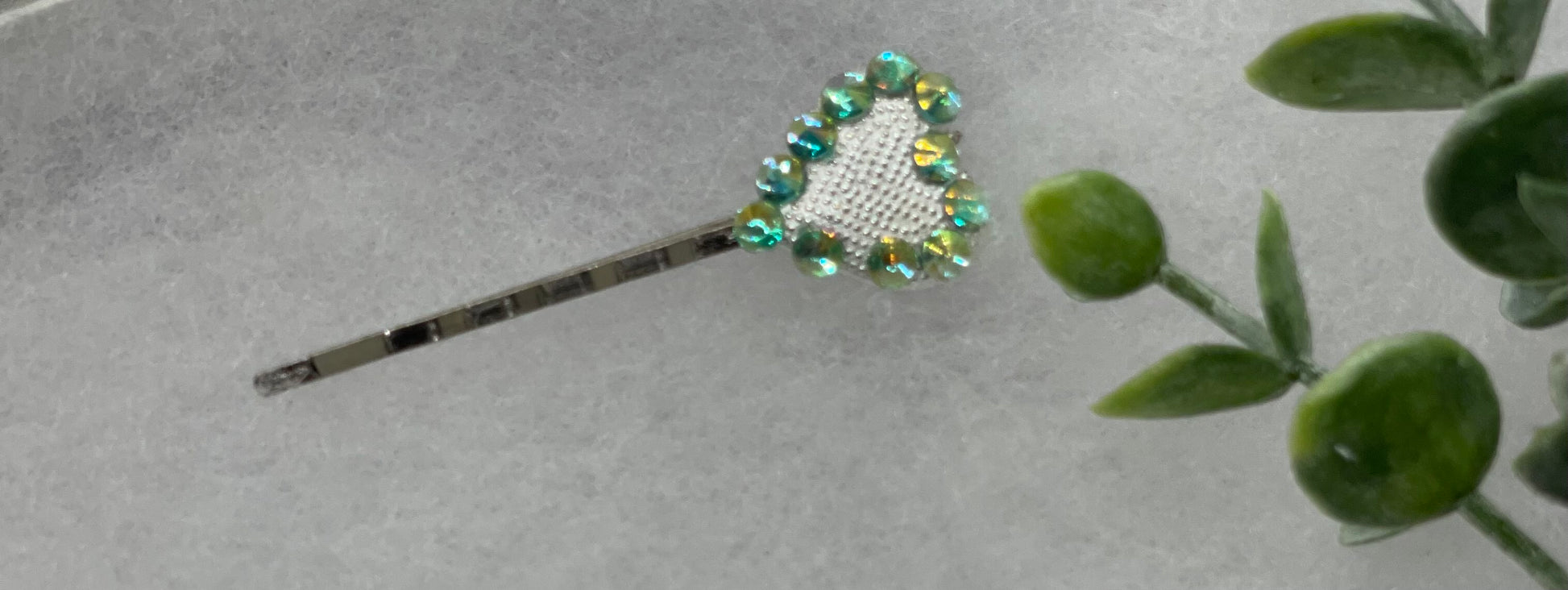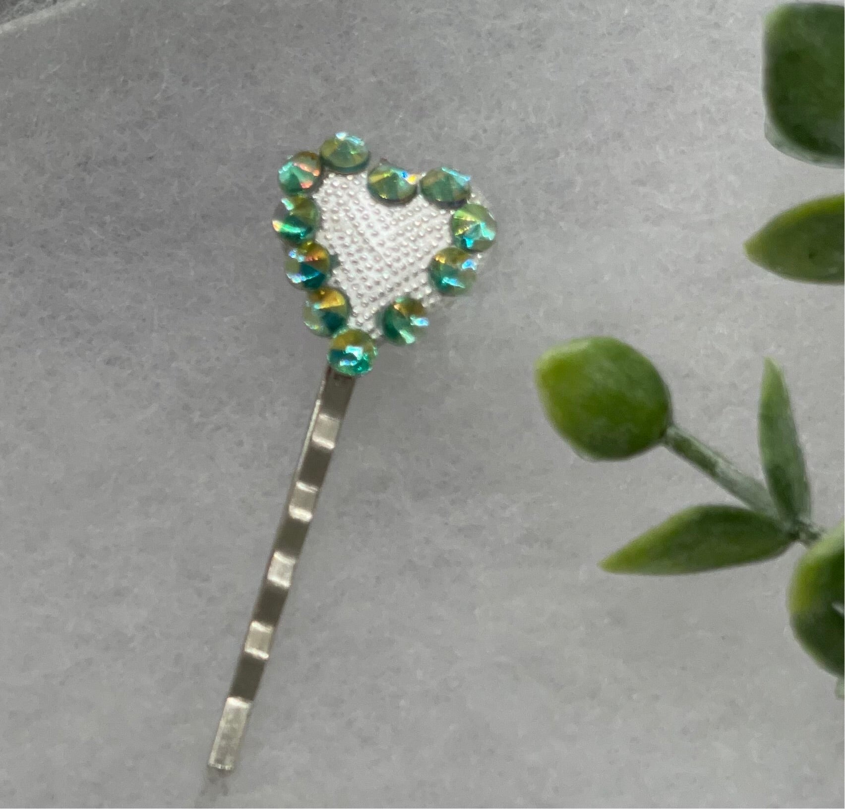 Heart green iridescent crystal rhinestone Silver2.5” long hair hair pin hair Accessories gifts birthday princess