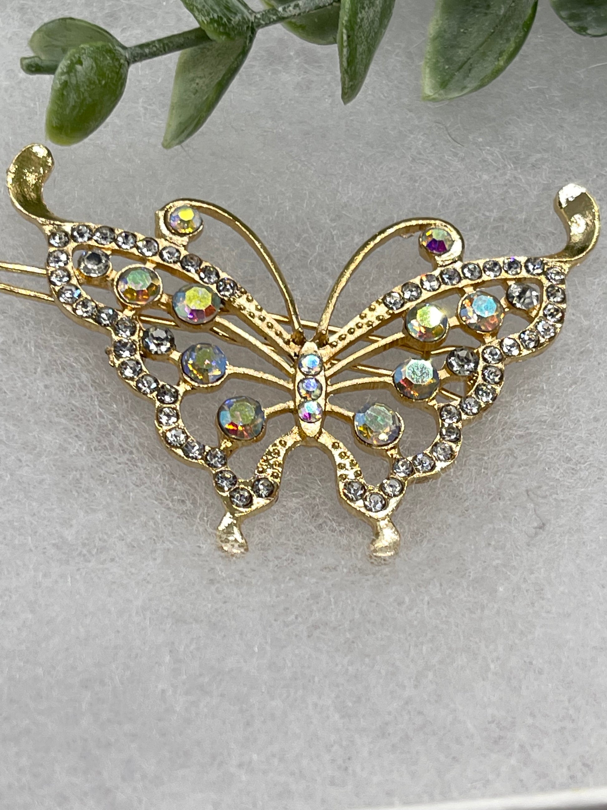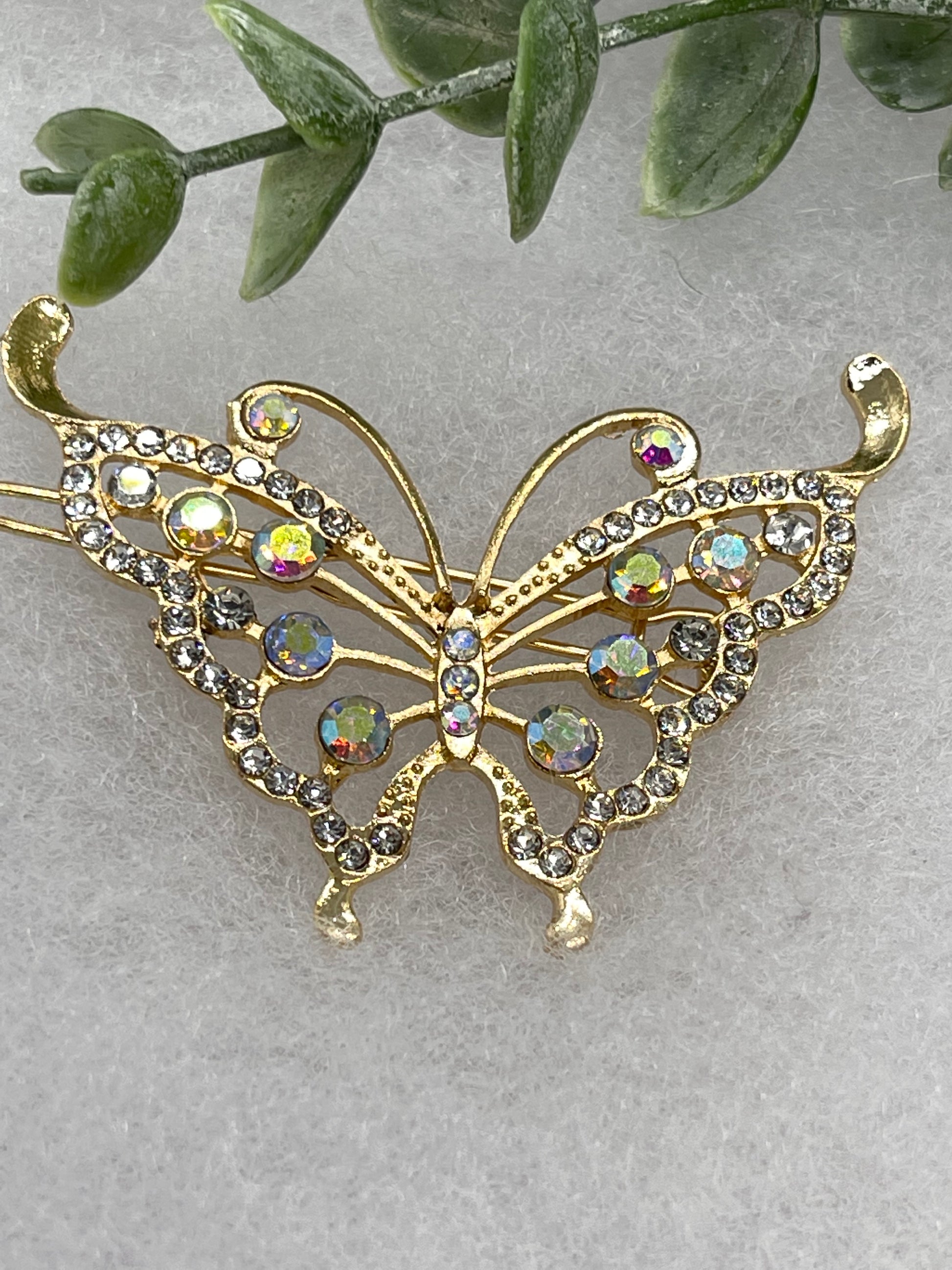 iridescent gold butterfly Crystal Rhinestone Barrette approximately 3.5”Metal gold tone formal hair accessory gift wedding bridal engagement