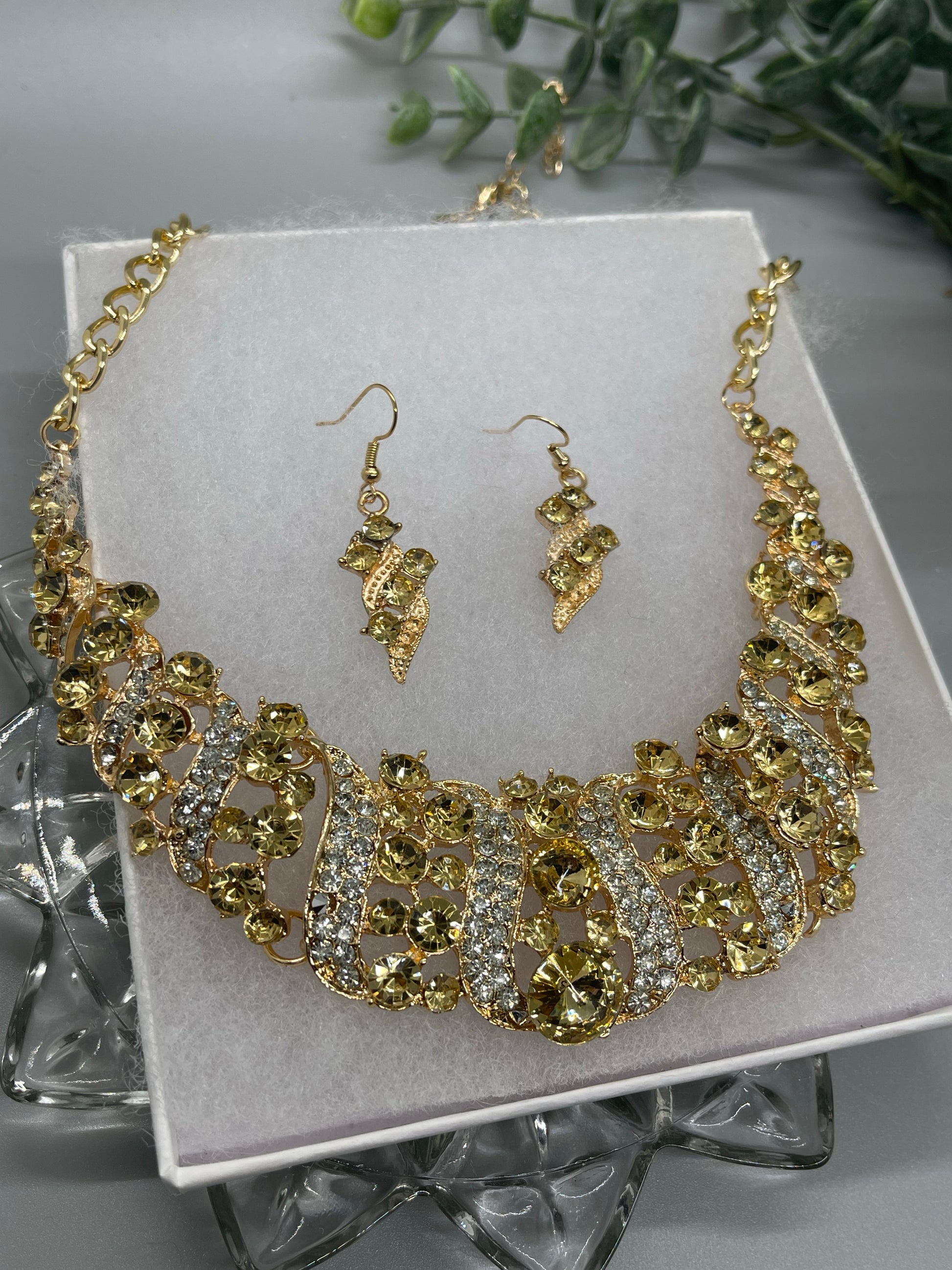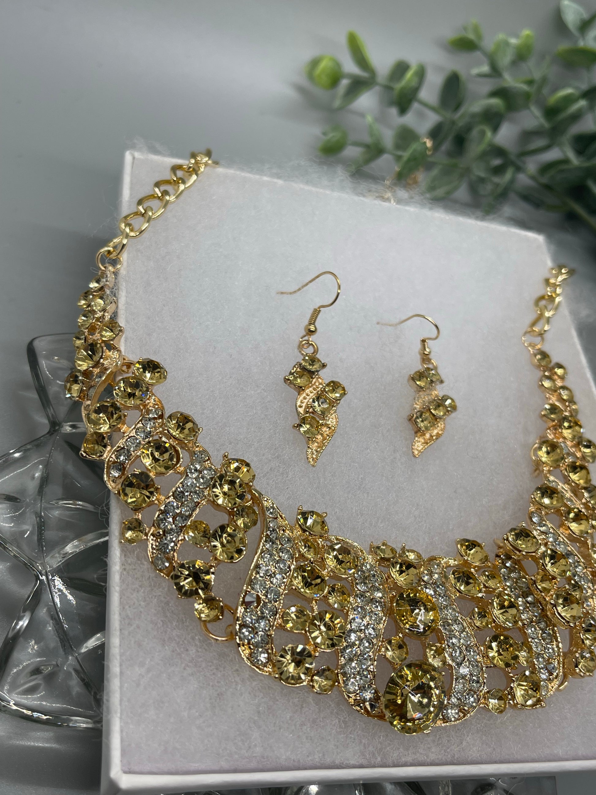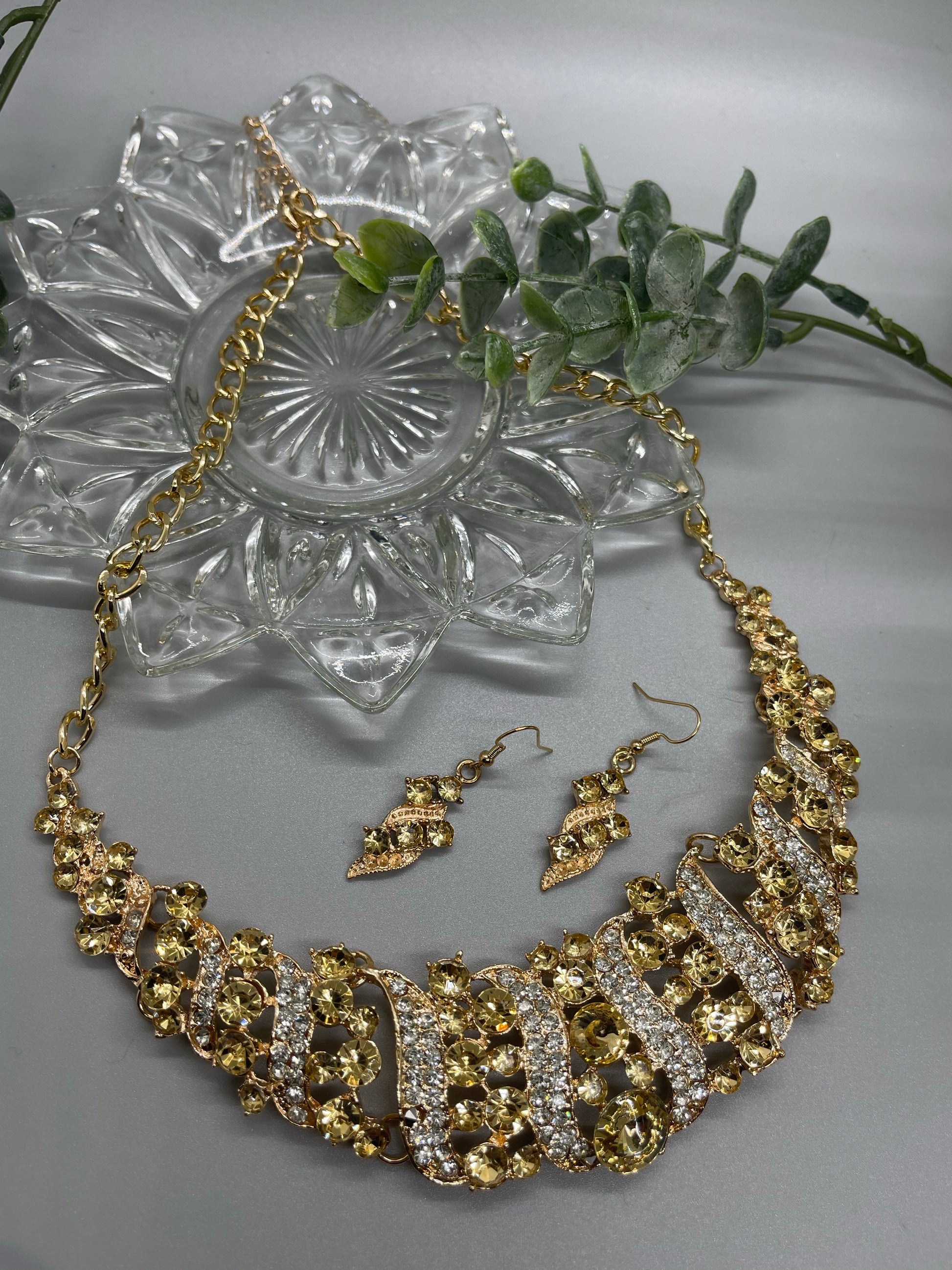 Gold Crystal rhinestone necklace earrings set wedding engagement formal accessory