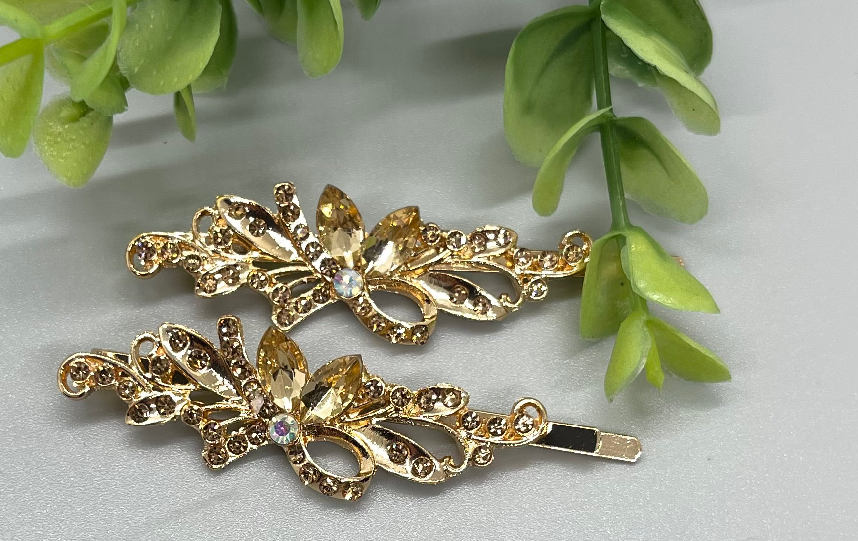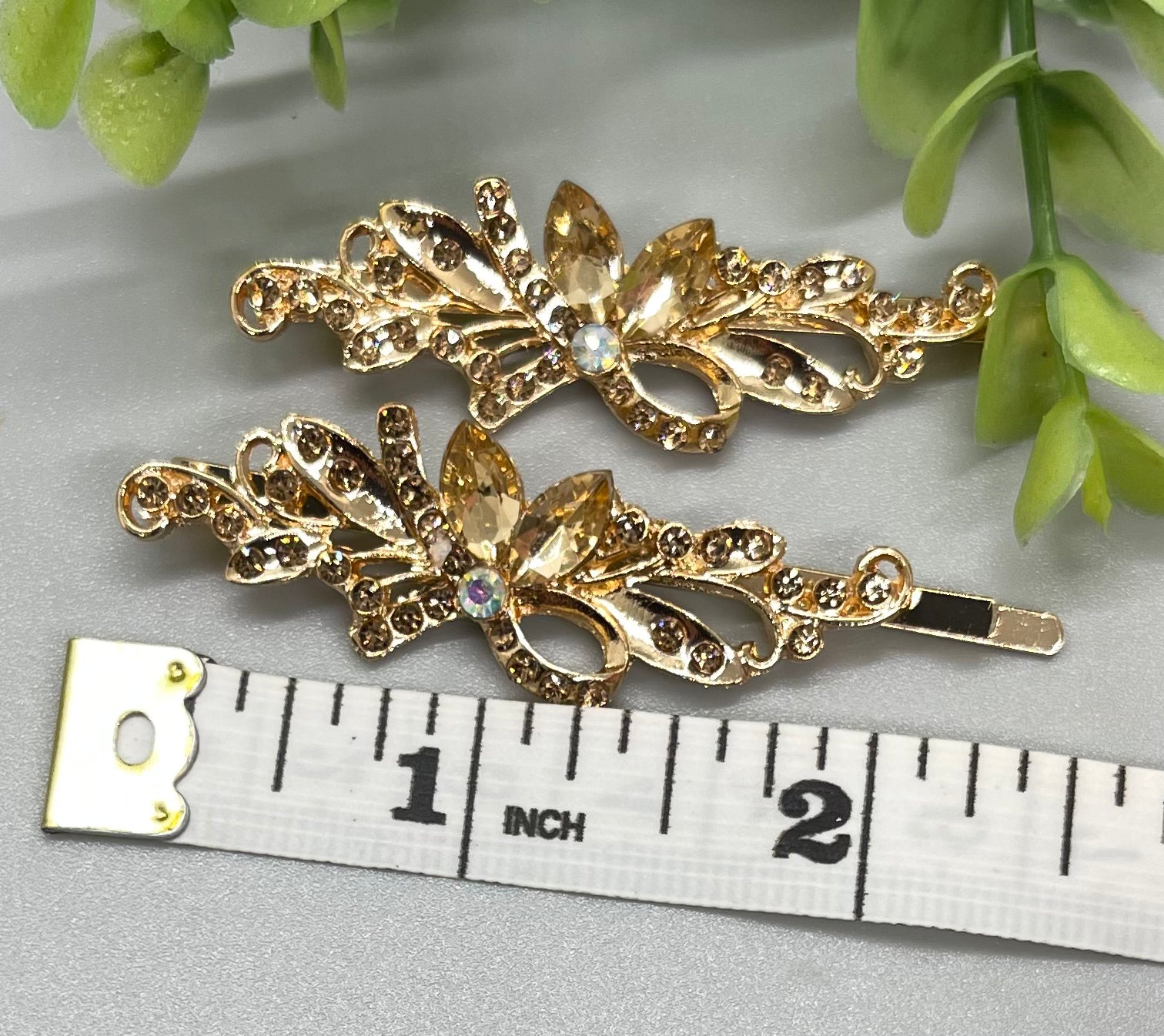 Gold crystal rhinestone Rose Gold approximately 2.75 hair pins 2 pc set wedding bridal shower engagement formal princess accessory birthday prom