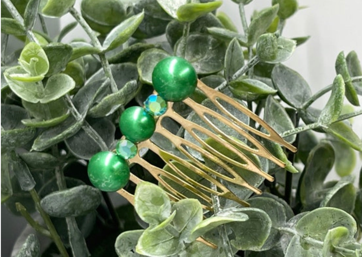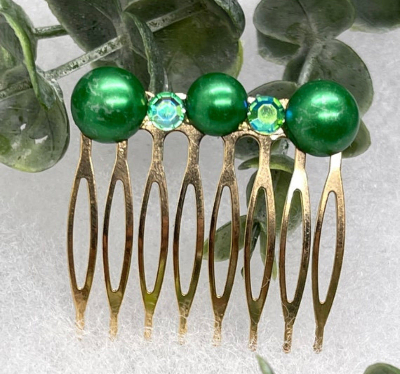 Emerald Green faux Pearl crystal side comb approximately 2.0”long gold metal hair accessory bridal wedding Retro