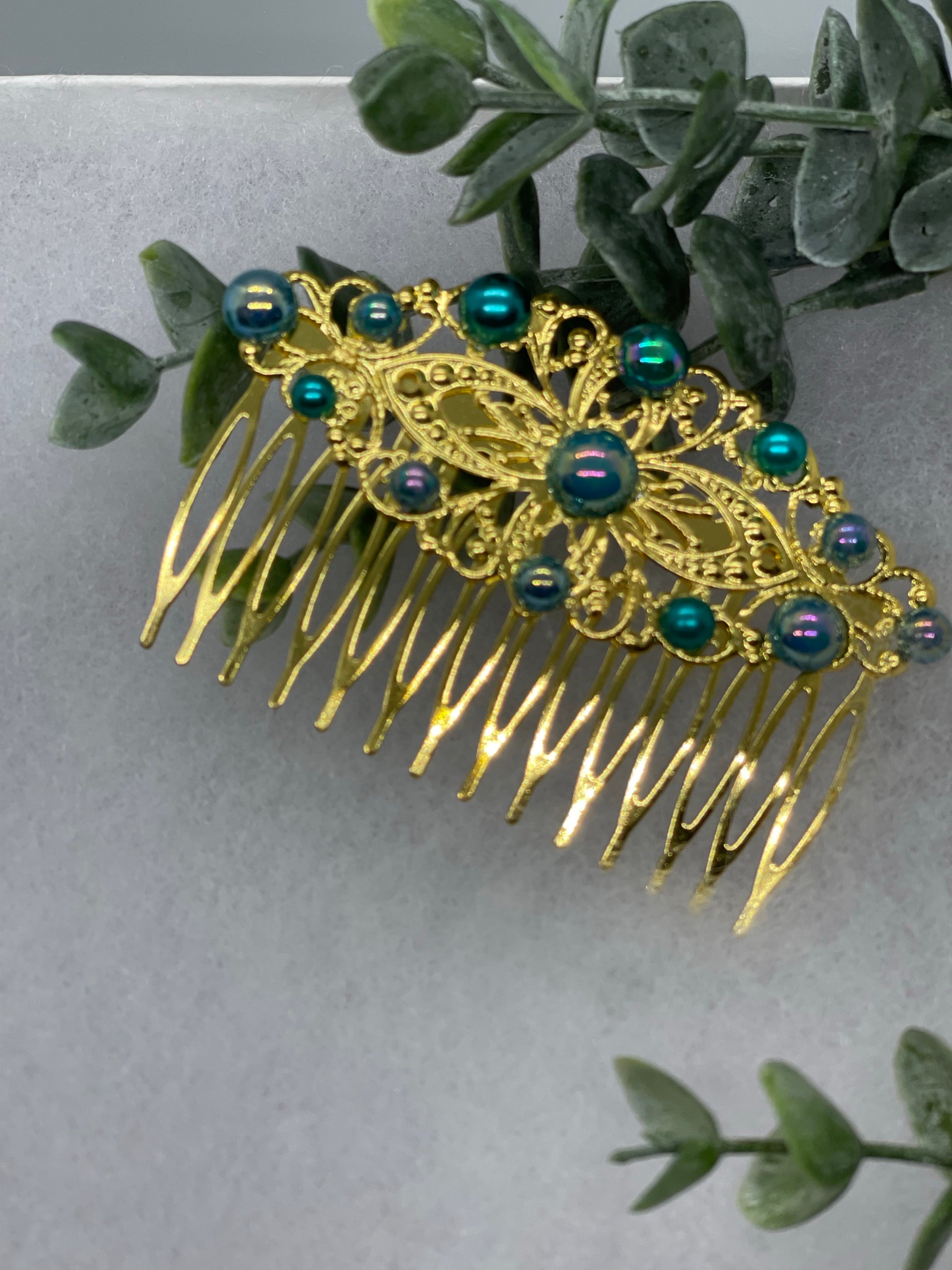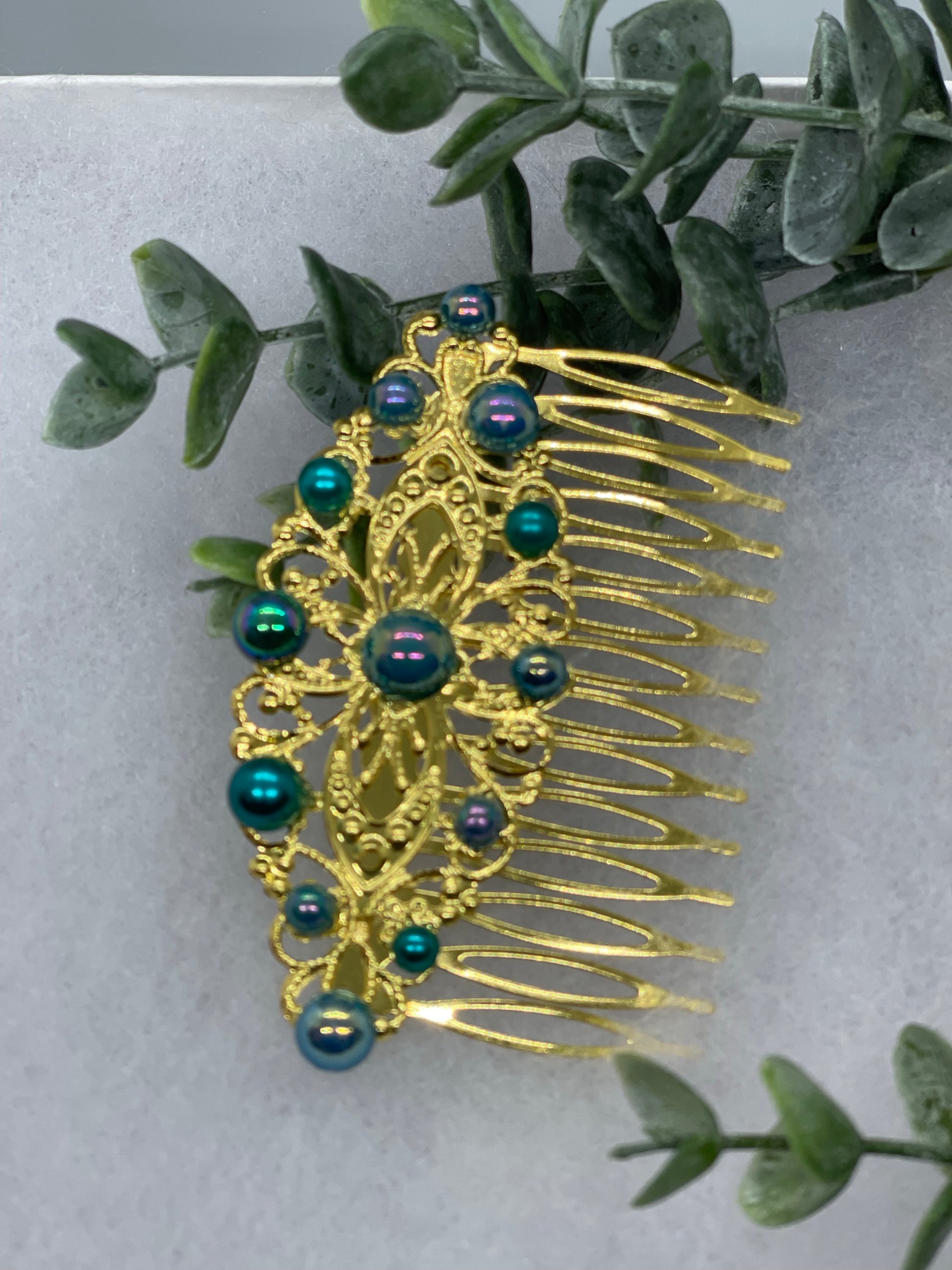 Green blue iridescent pearls vintage style side comb hair accessories gift birthday 3.5” Metal side Comb