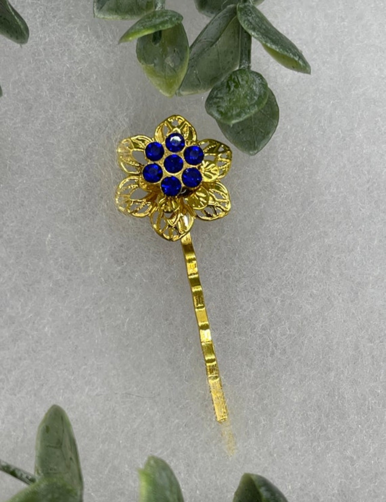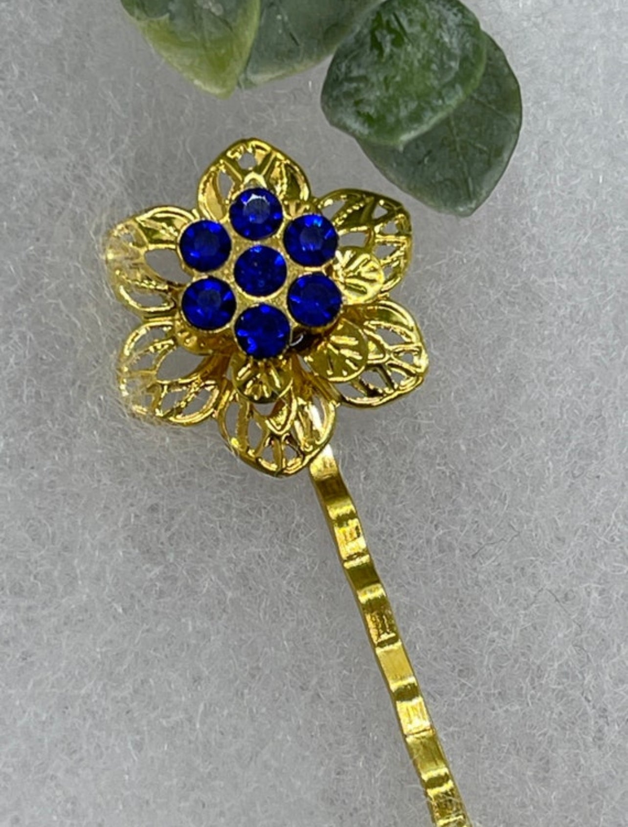 Royal Blue Crystal flower vintage antique style hair pin approximately 2.5” long Handmade hair accessory bridal wedding Retro