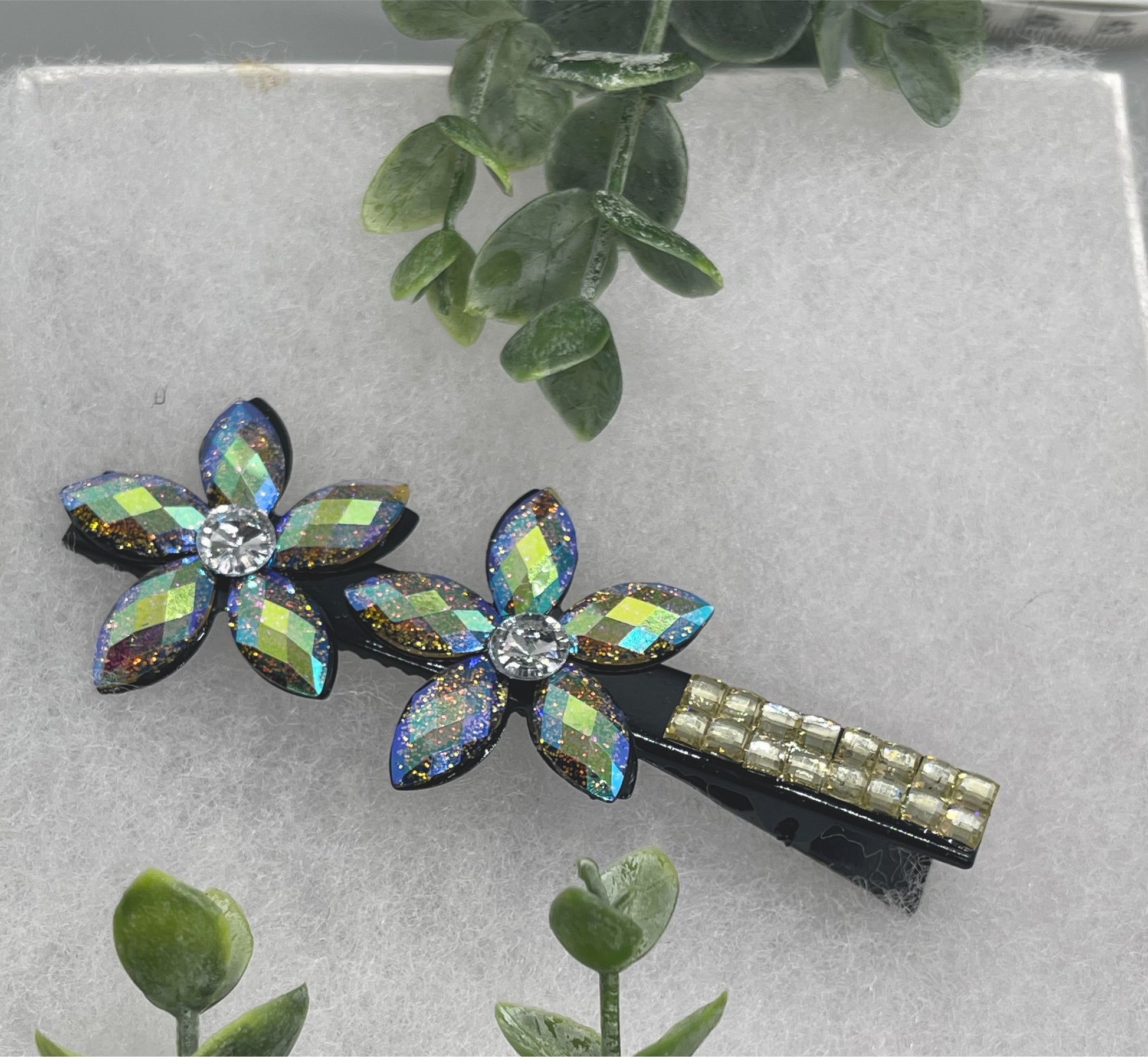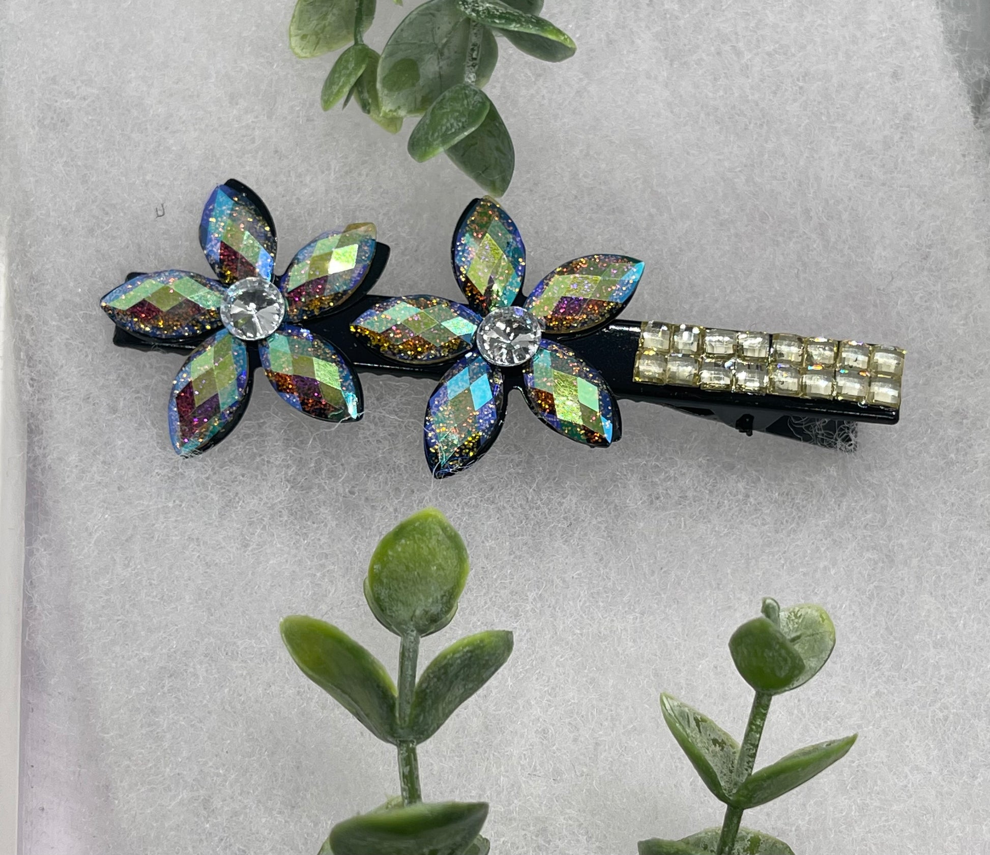 Iridescent Crystal flower hair clip approximately 4.0” black tone formal hair accessory gift wedding bridal engagement