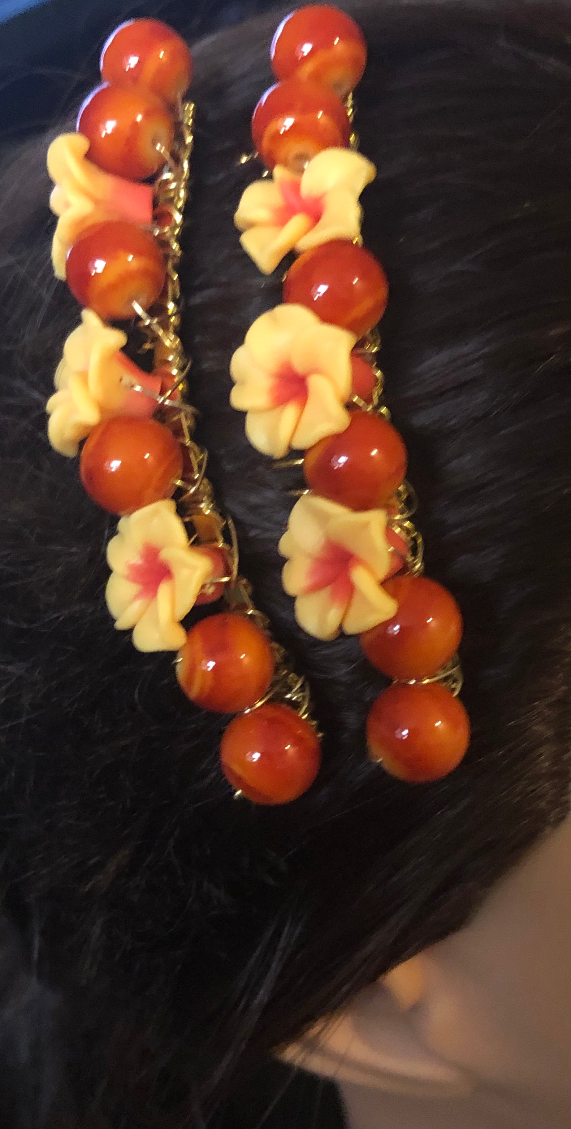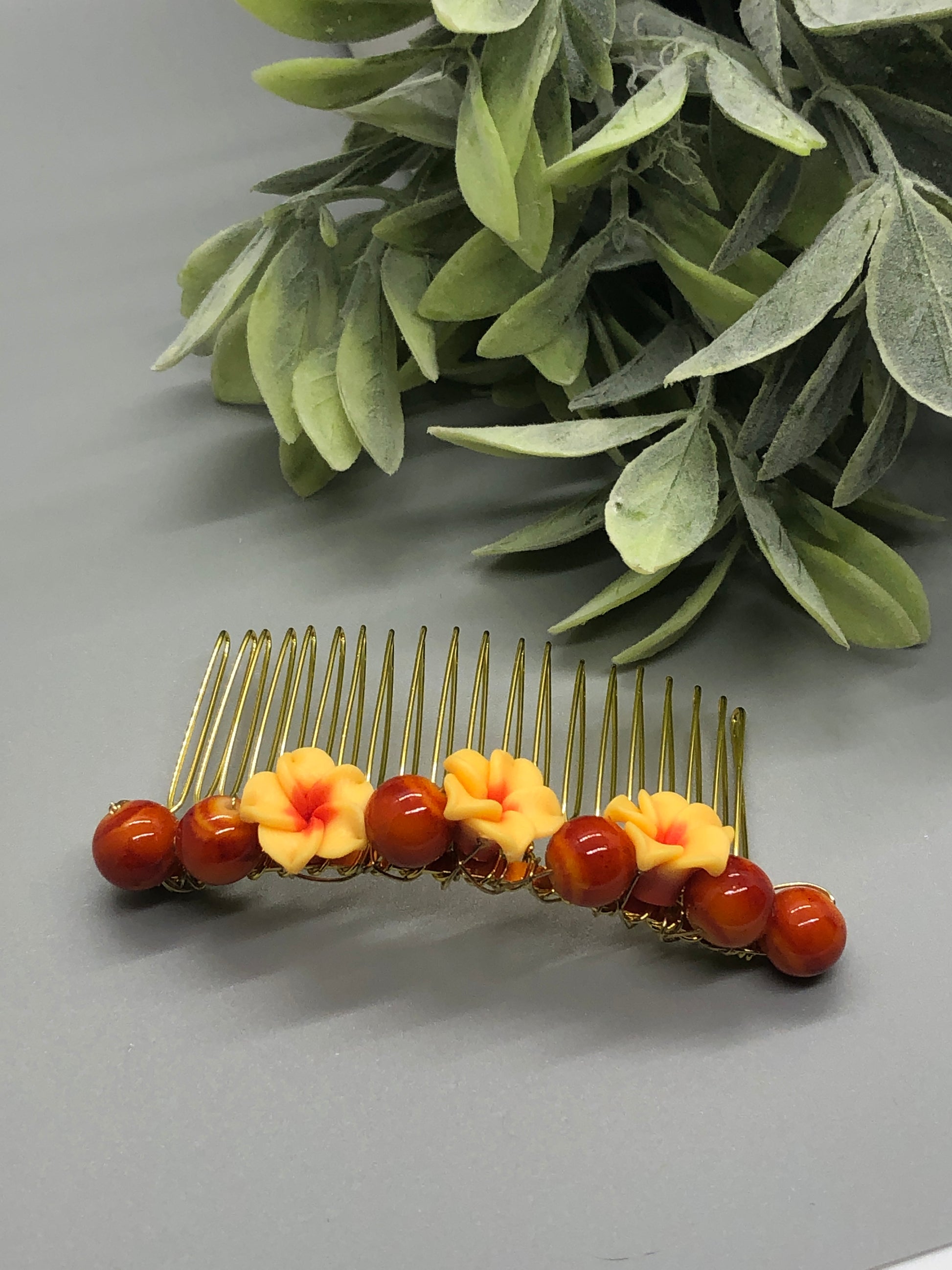 MAUI Collection Yellow Coral Flowers Beads Side Combs Gold Tone Beautiful for any occasion