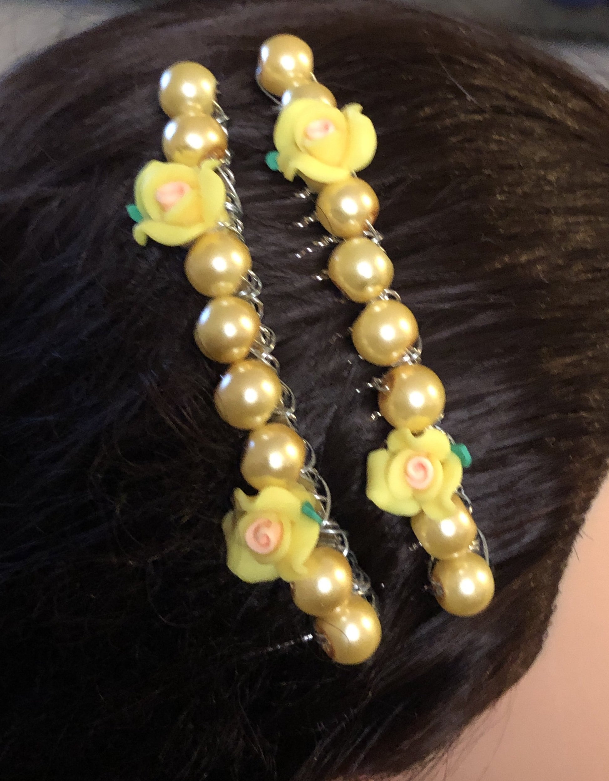 Yellow Flower Beads Silver Tone Side Comb 2pc Set
