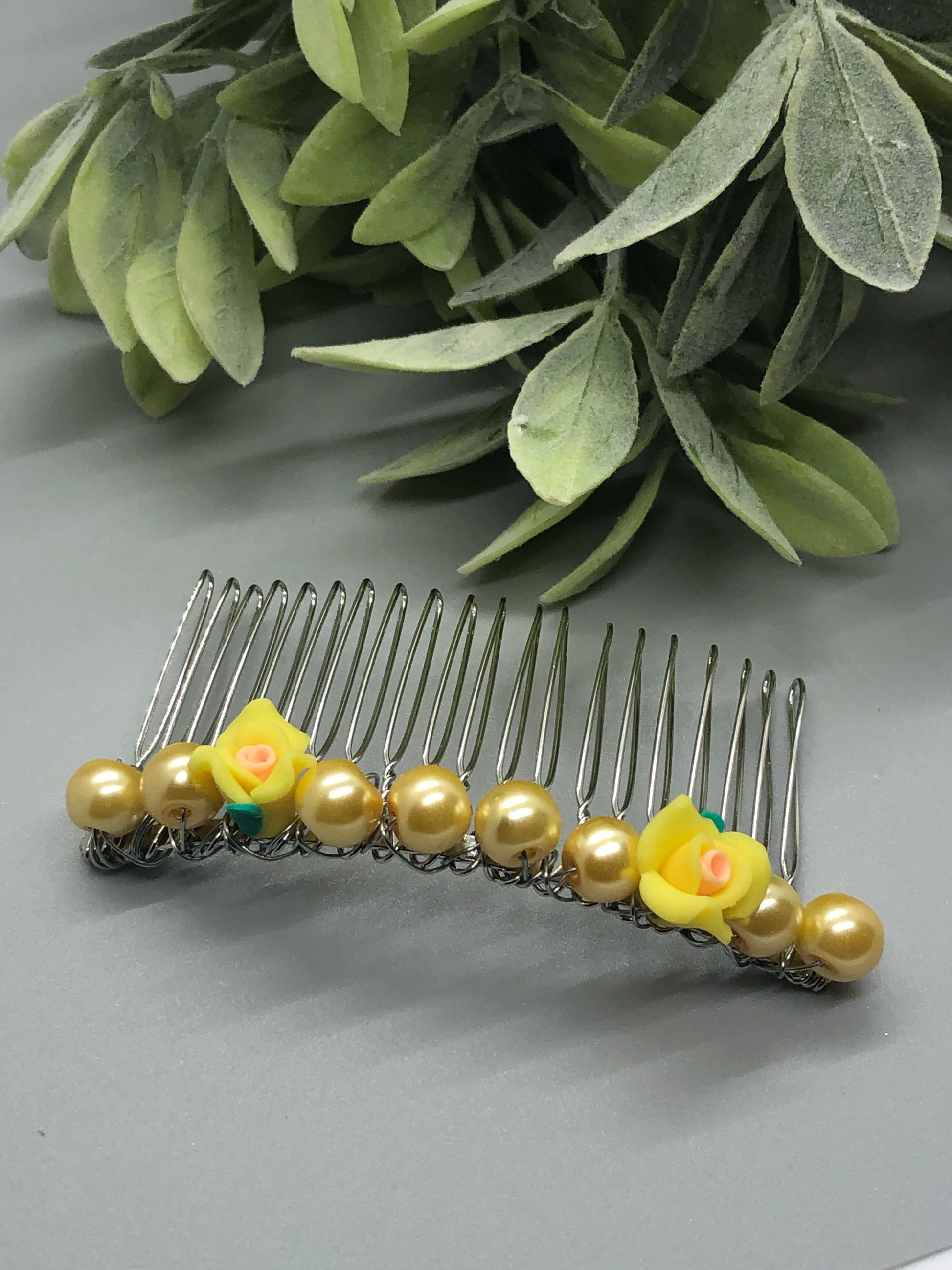 MAUI Collection Yellow Flowers Beads Side Combs Silver Tone Metal Combs 2pc set