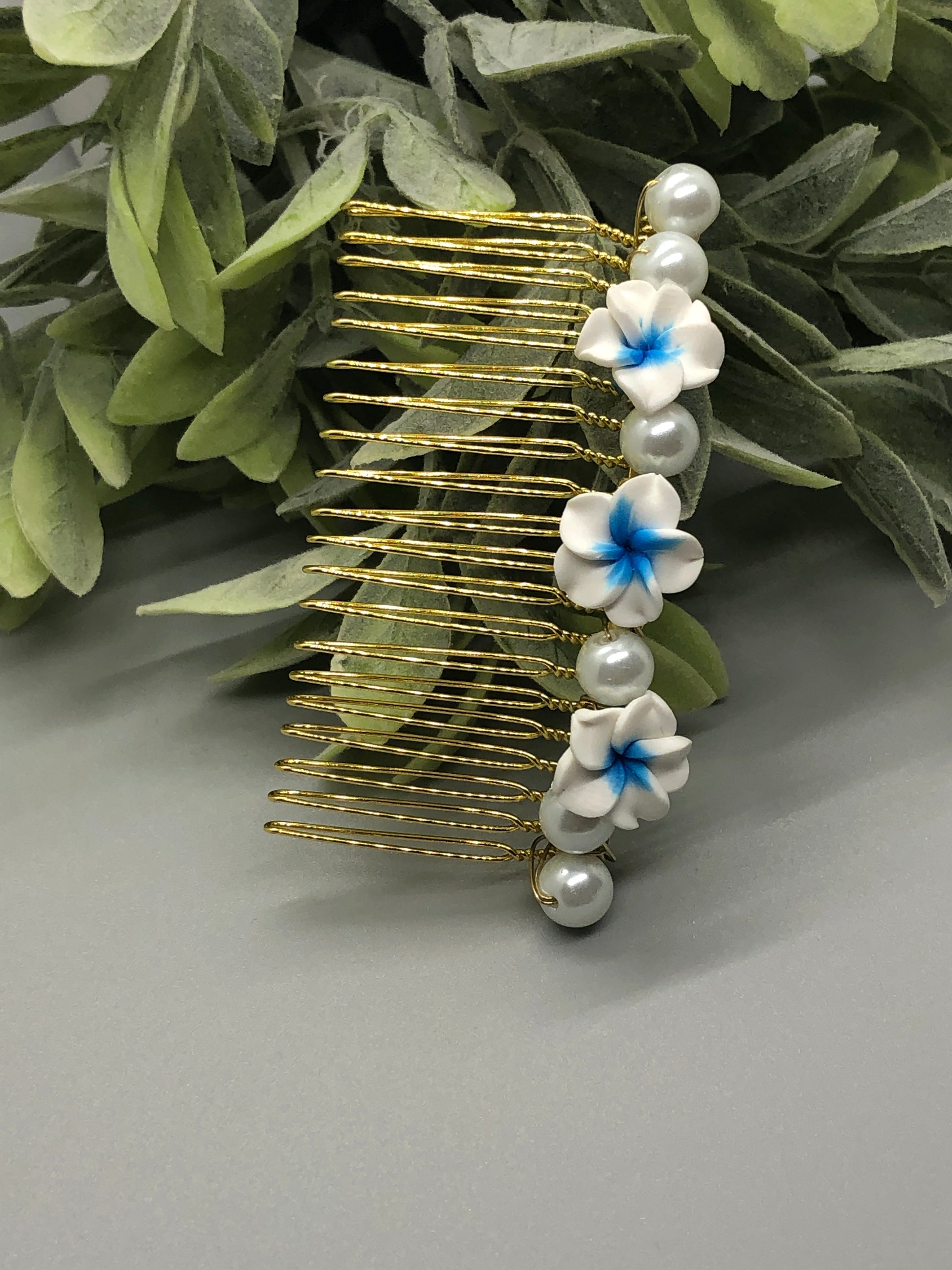 White Blue Flower White Beads Gold Tone Side 3.5'Comb