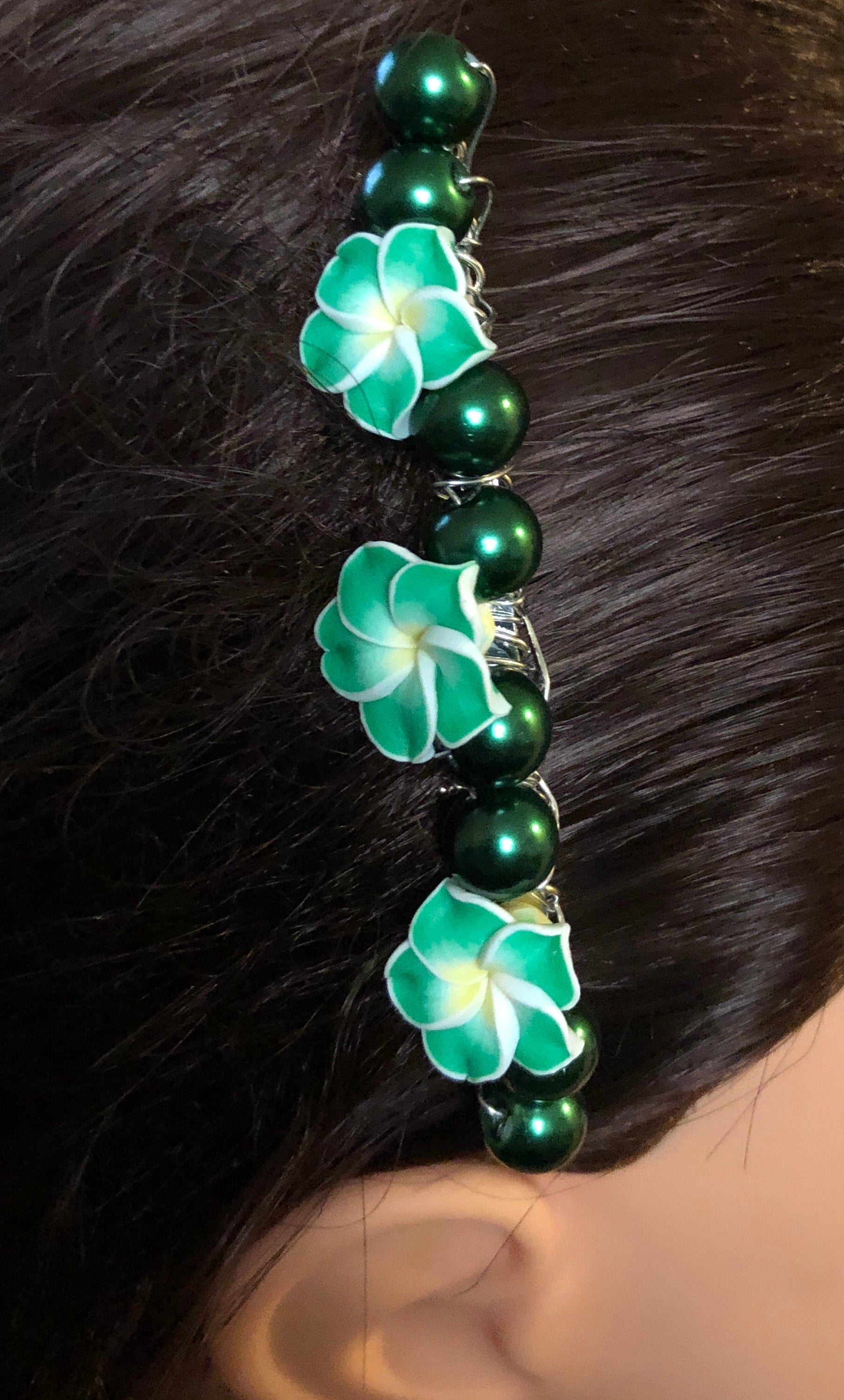 White Green Yellow Flowers Green Beads Silver Tone Side3.5' Comb 1pc