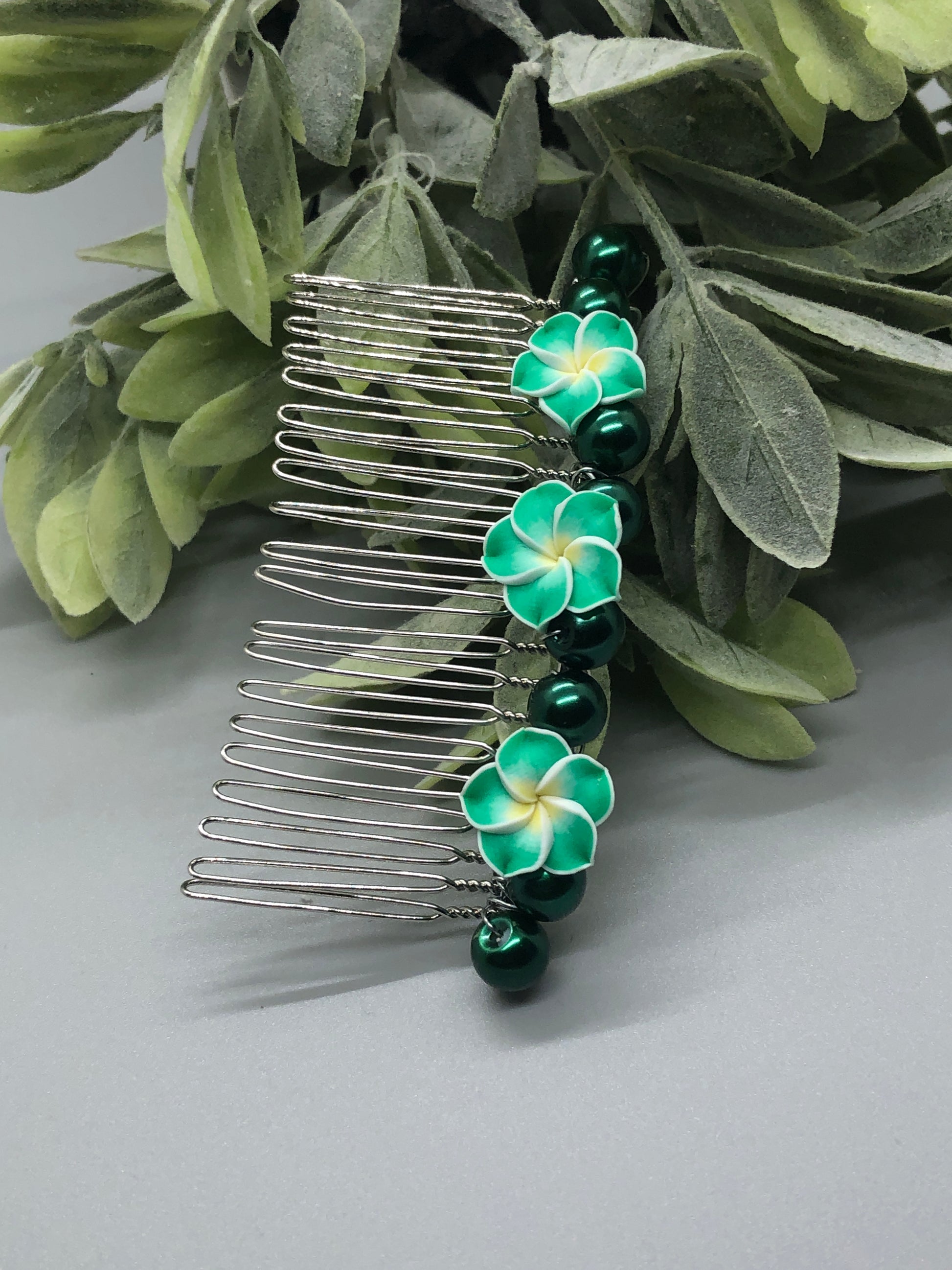 Green Yellow Flowers Green Beads Side Combs Silver Tone Metal Comb Beautiful for any occasion