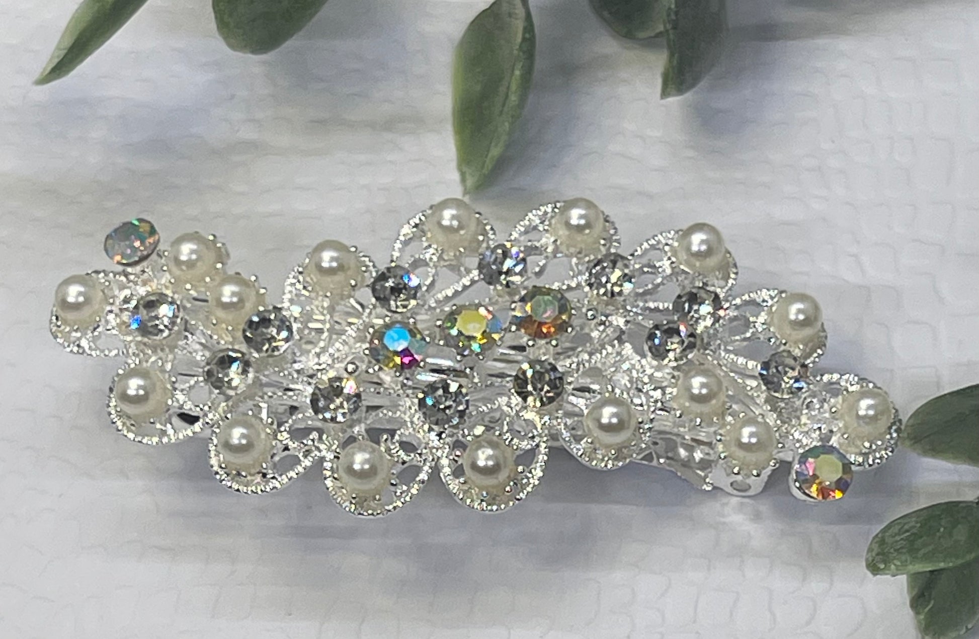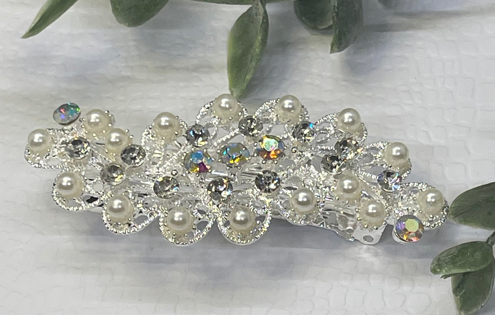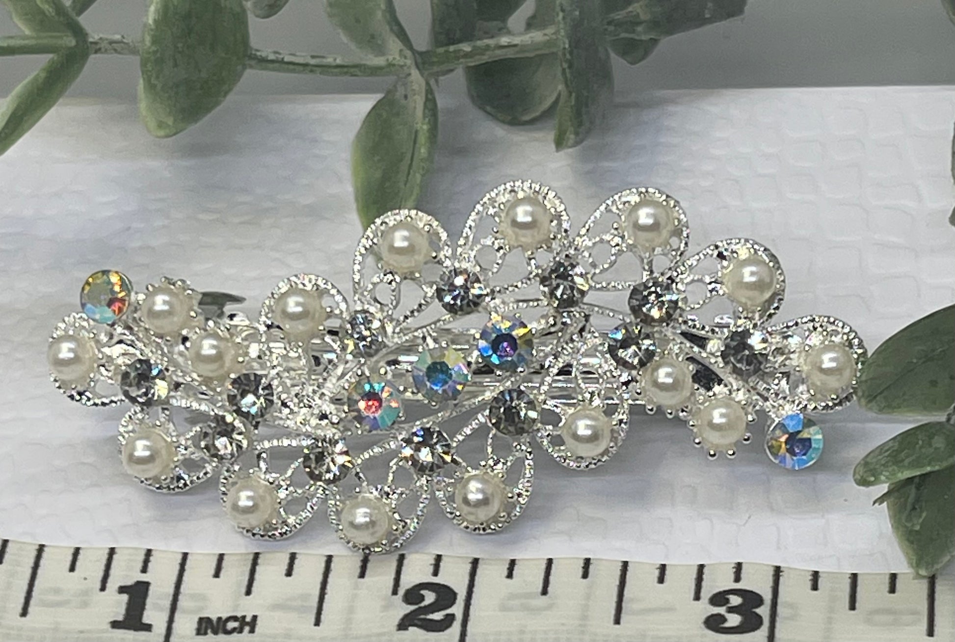 Pearl Crystal rhinestone barrette approximately 3.0” silver tone formal hair accessories gift wedding bridesmaid