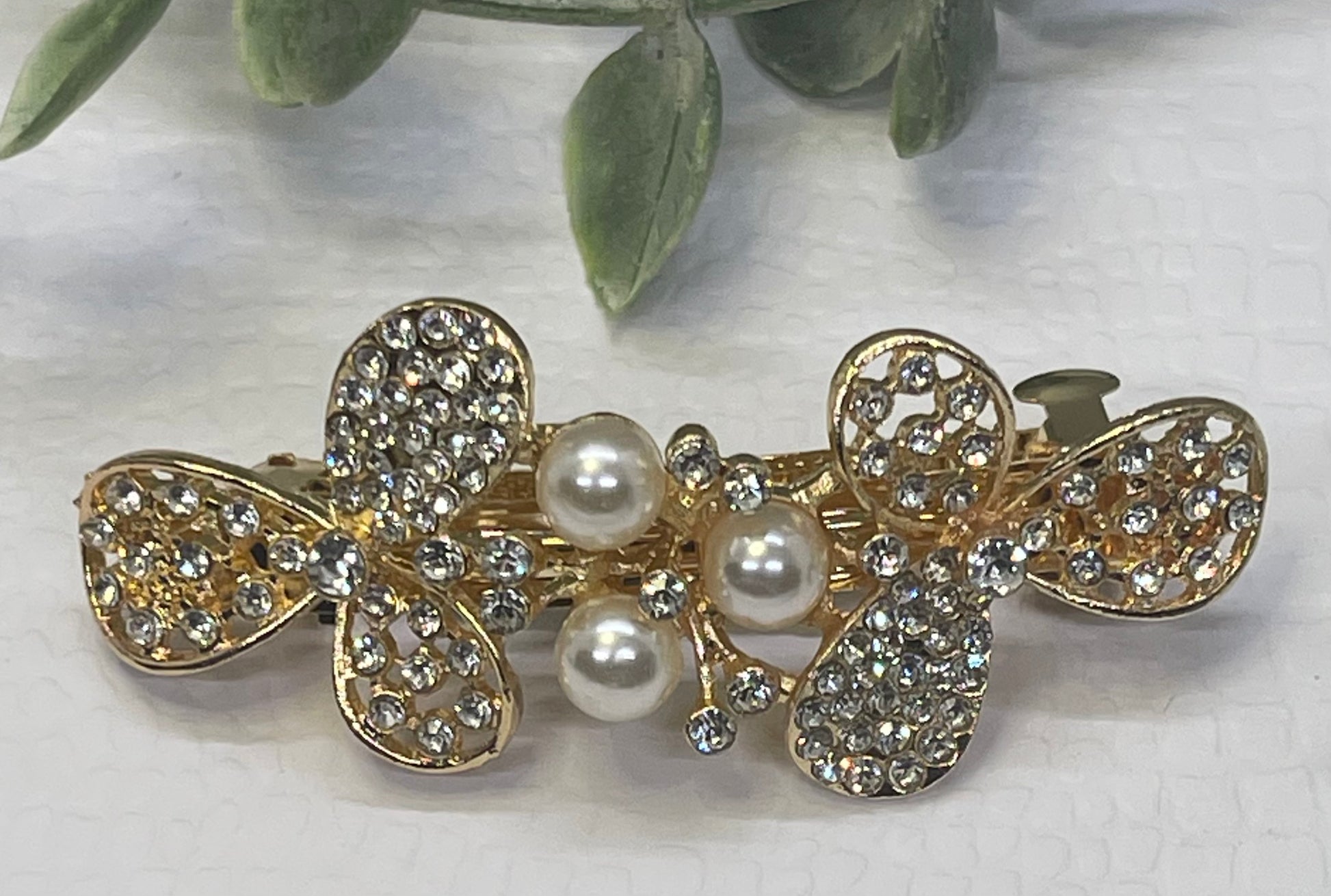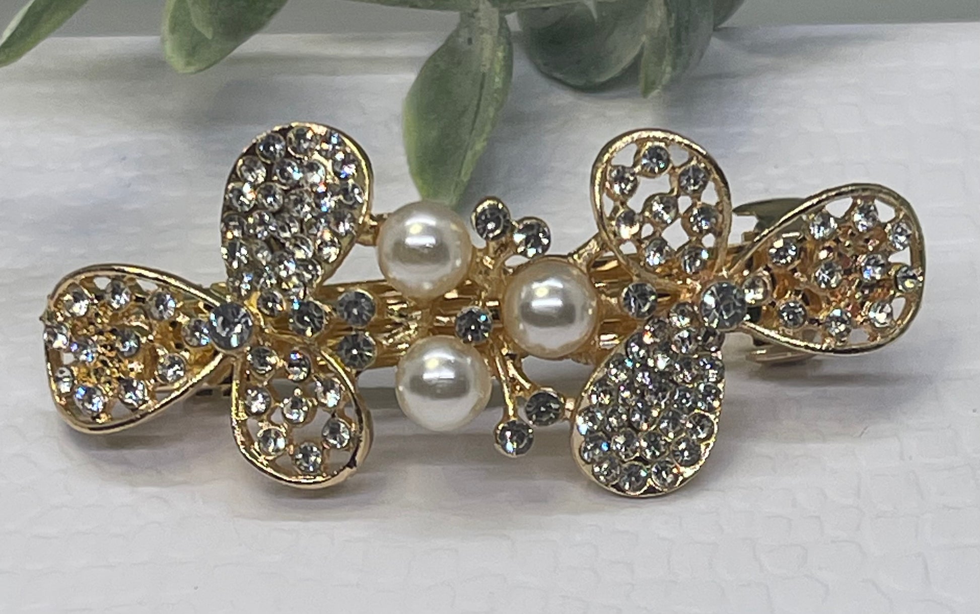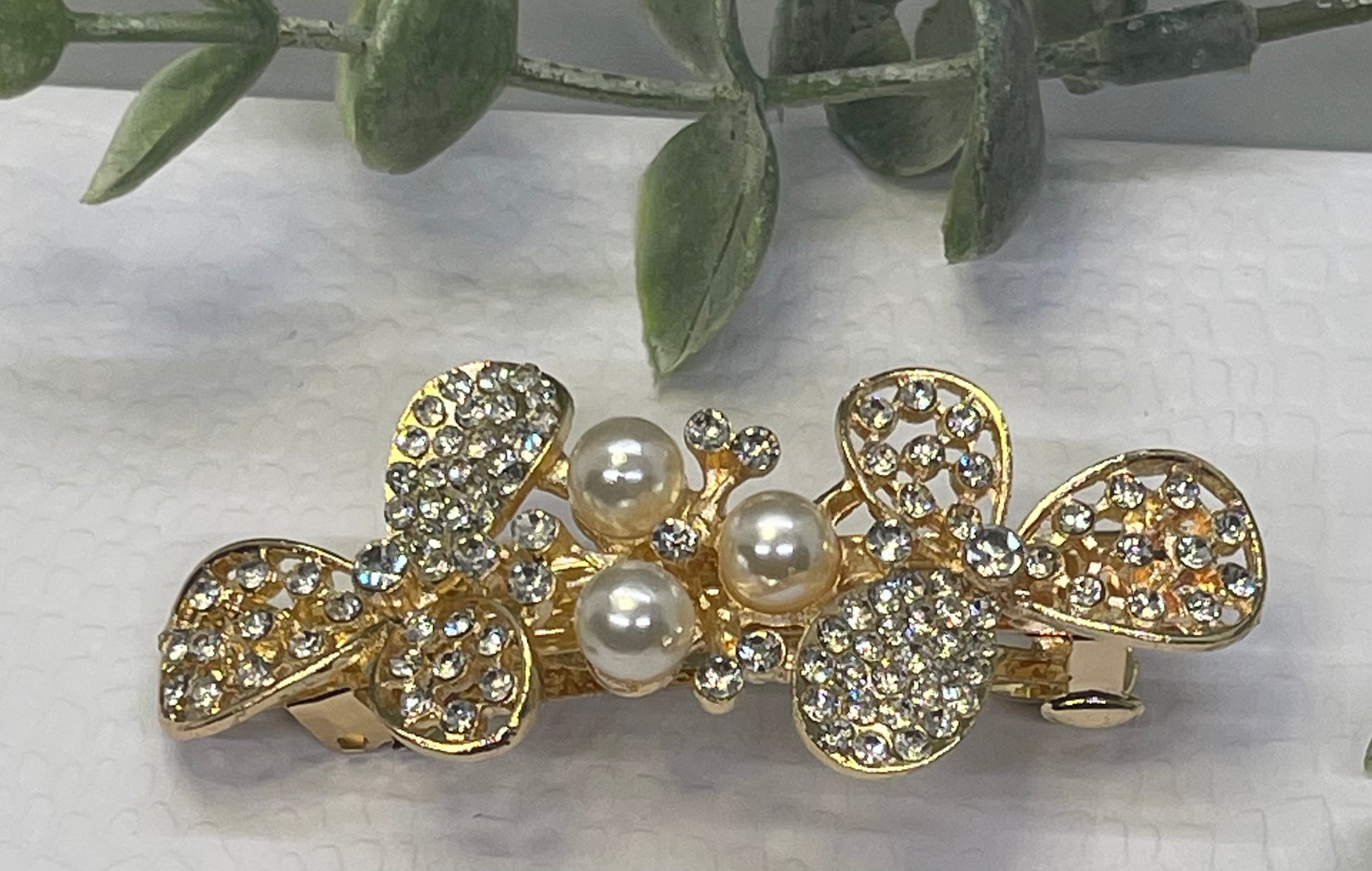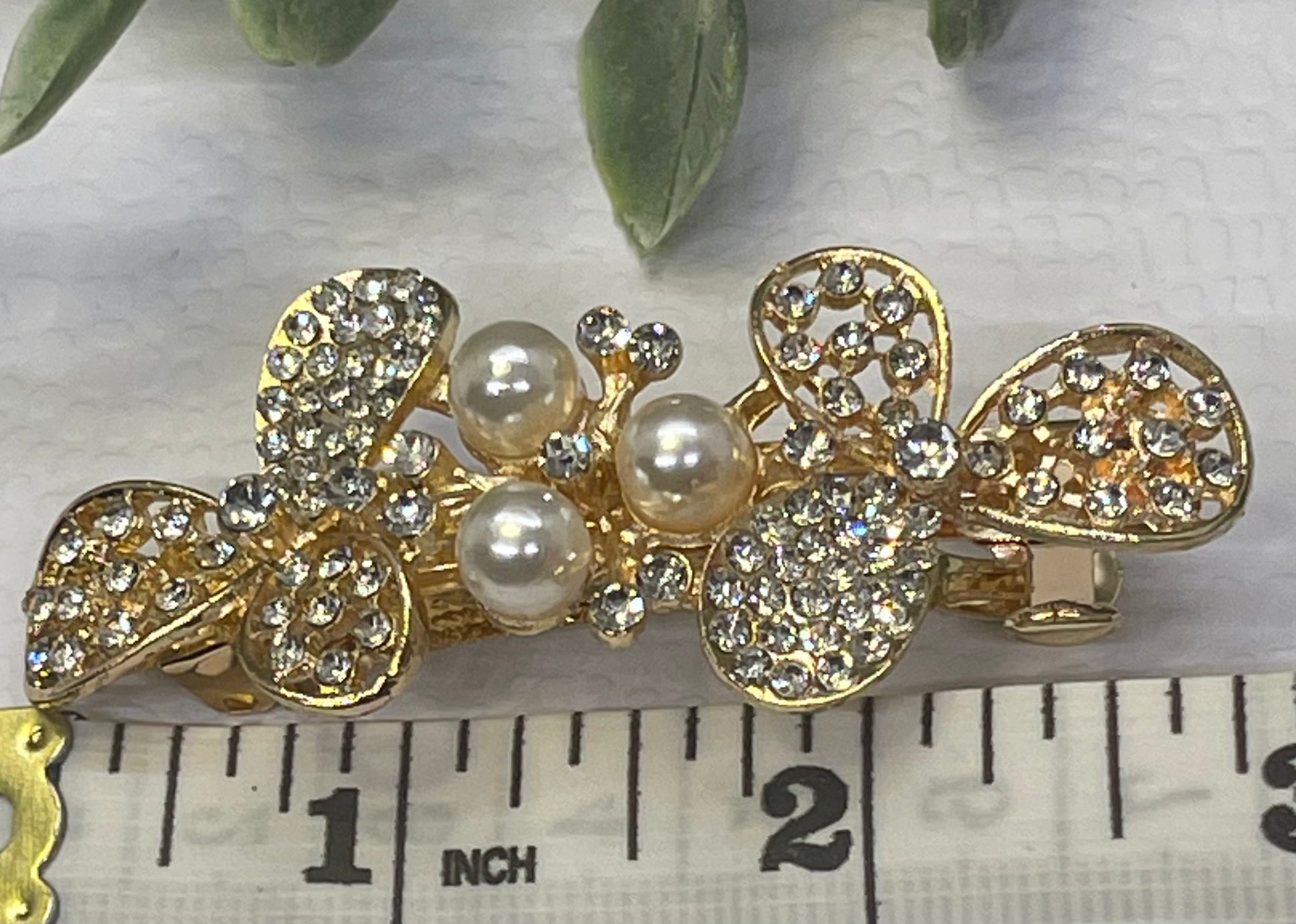 Pearl Crystal rhinestone barrette approximately 3.0” gold tone formal hair accessories gift wedding bridesmaid
