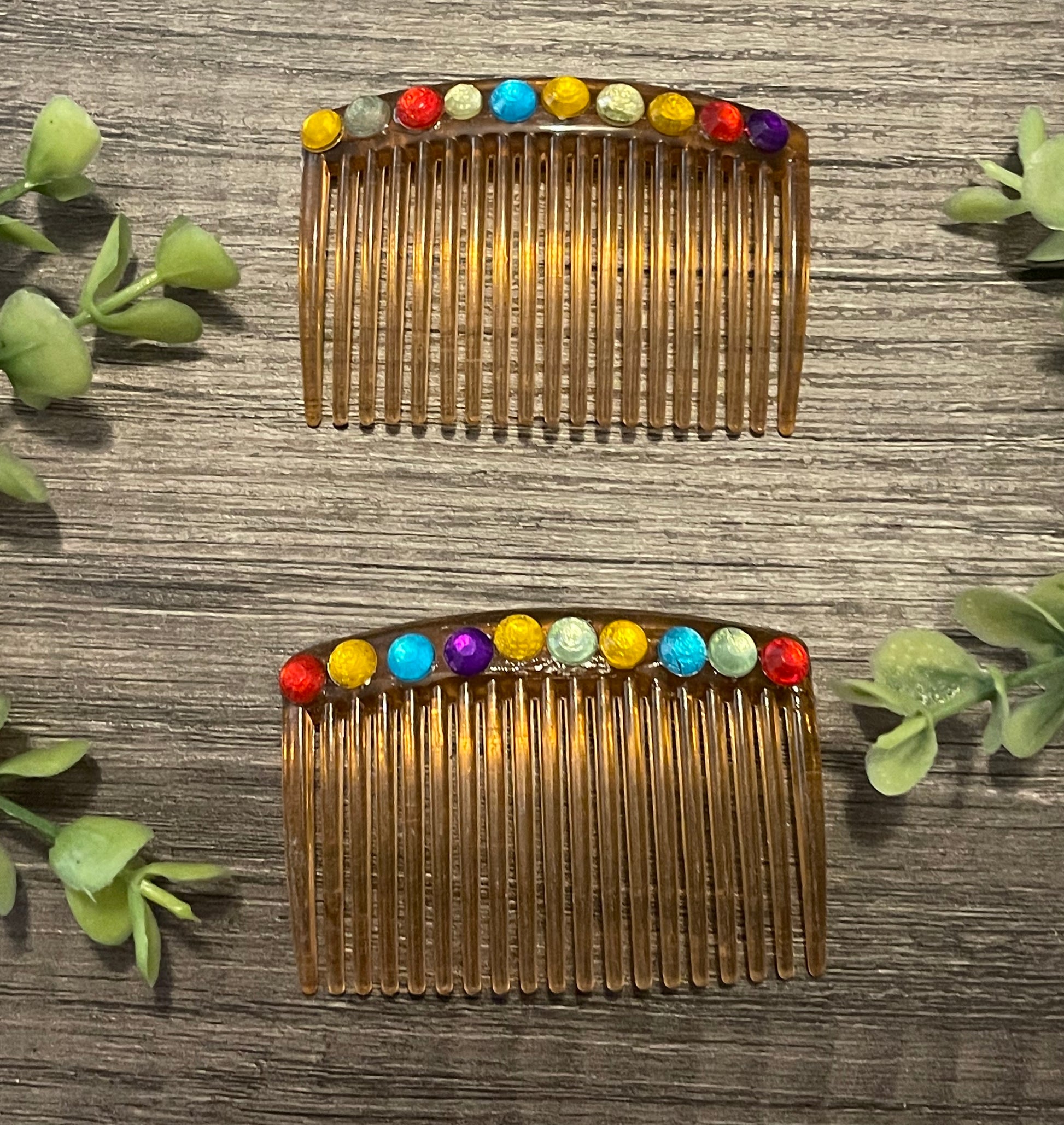 Rainbow crystal faux rhinestone 3.5” brown plastic side comb hair accessory bridal wedding Retro Bridal Party Prom Birthday gifts