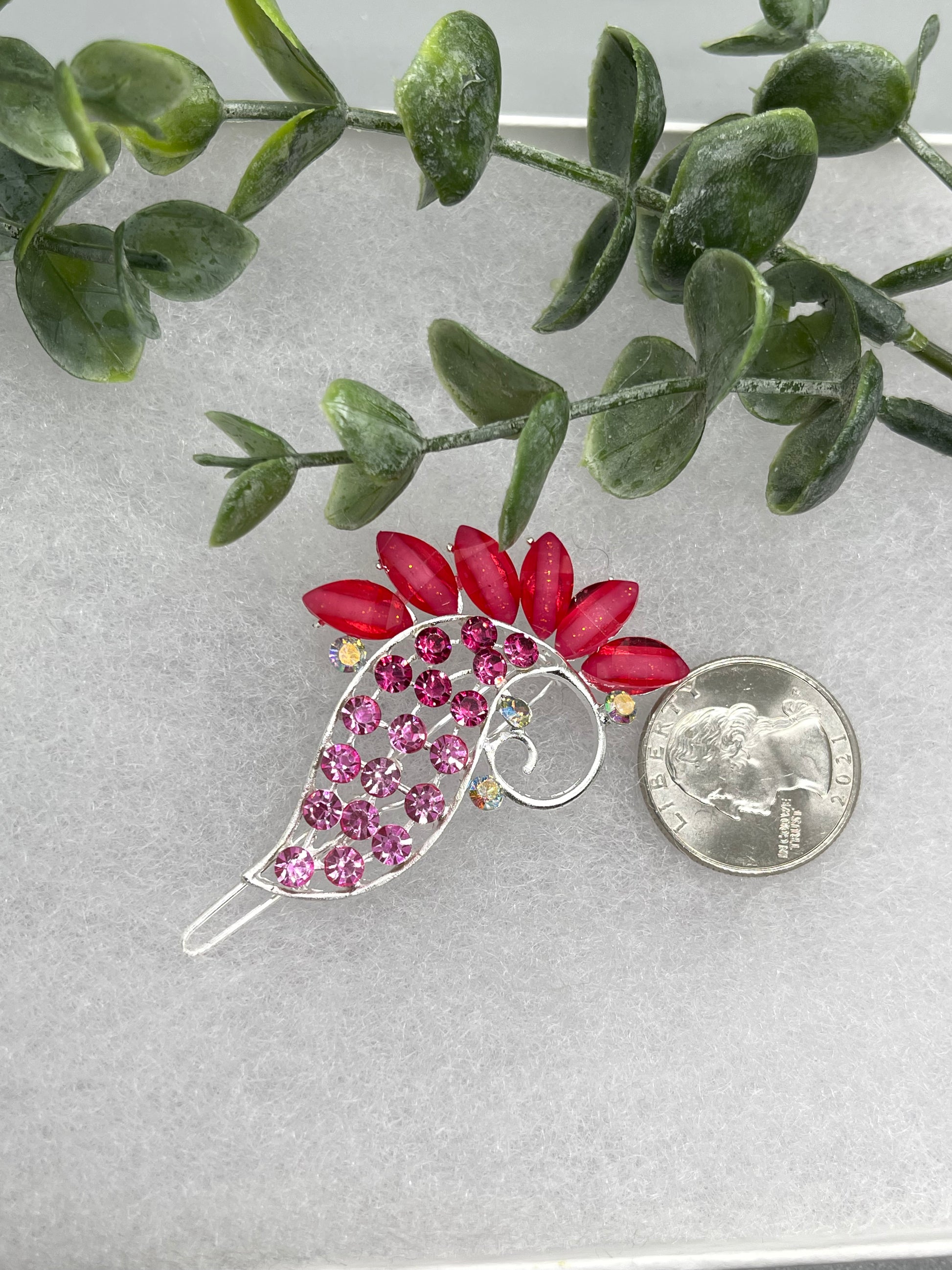 Red with pink Crystal Rhinestone peacock hair clip approximately 3.0”Metal silver tone formal hair accessory gift wedding bridal engagement
