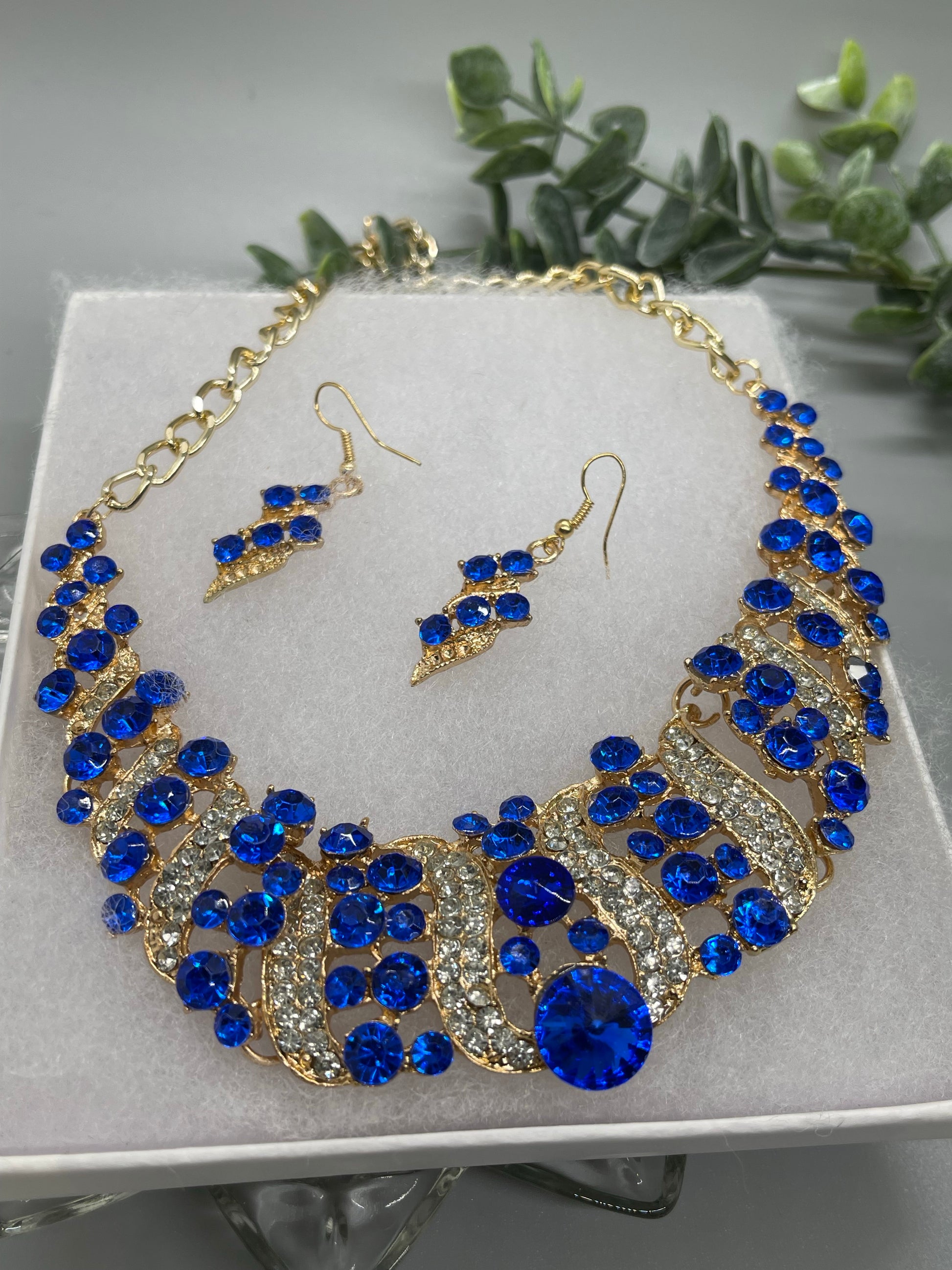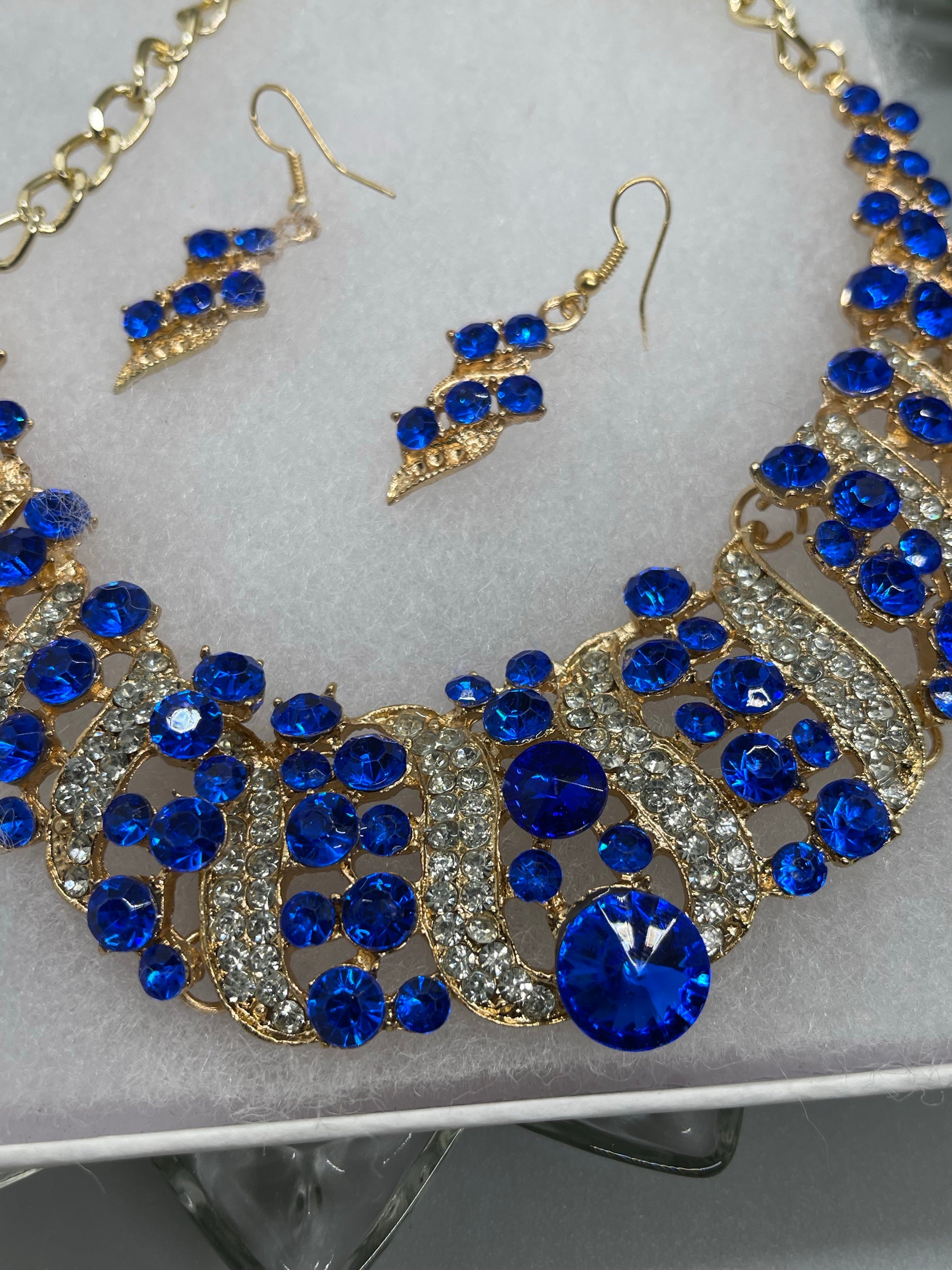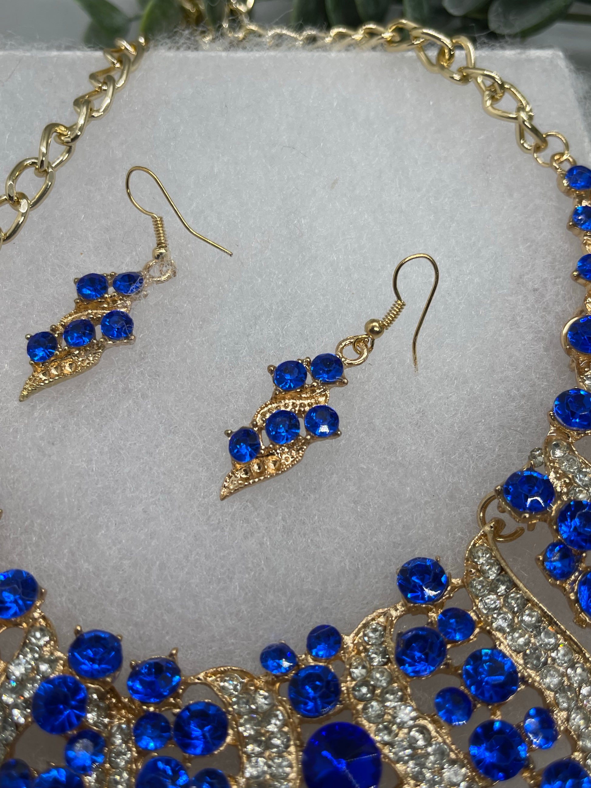 Royal blue Gold Crystal rhinestone necklace earrings set wedding engagement formal accessory