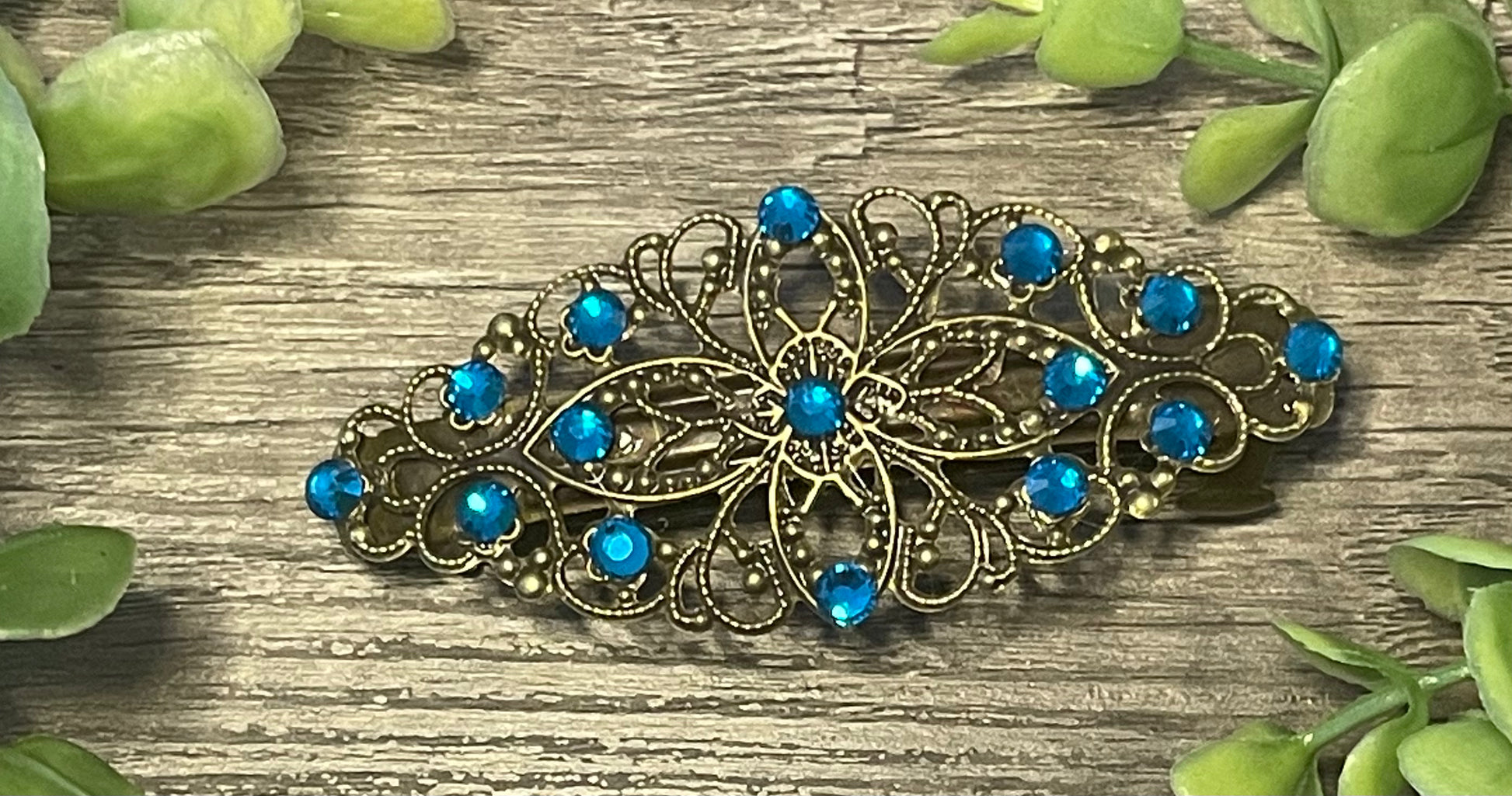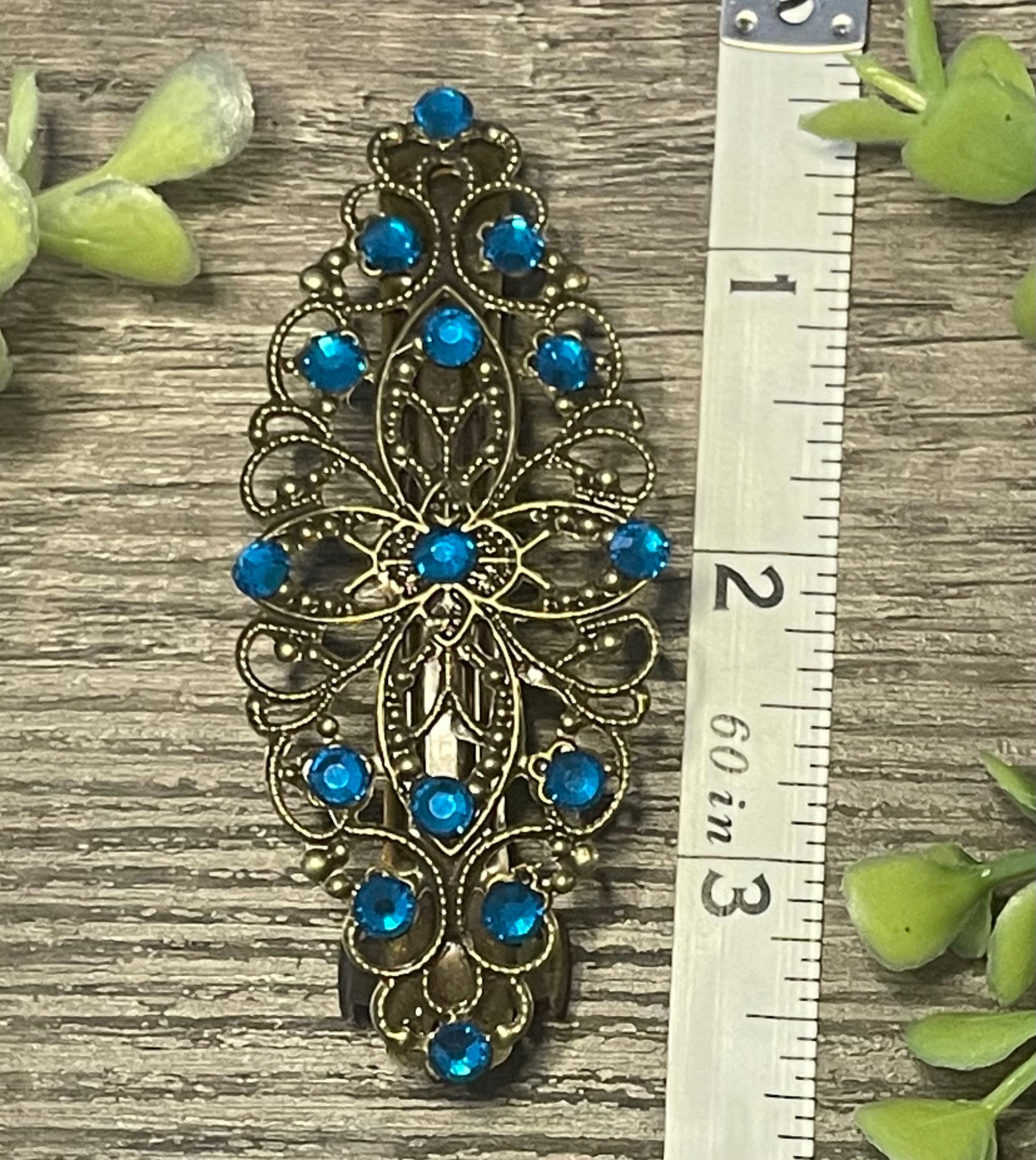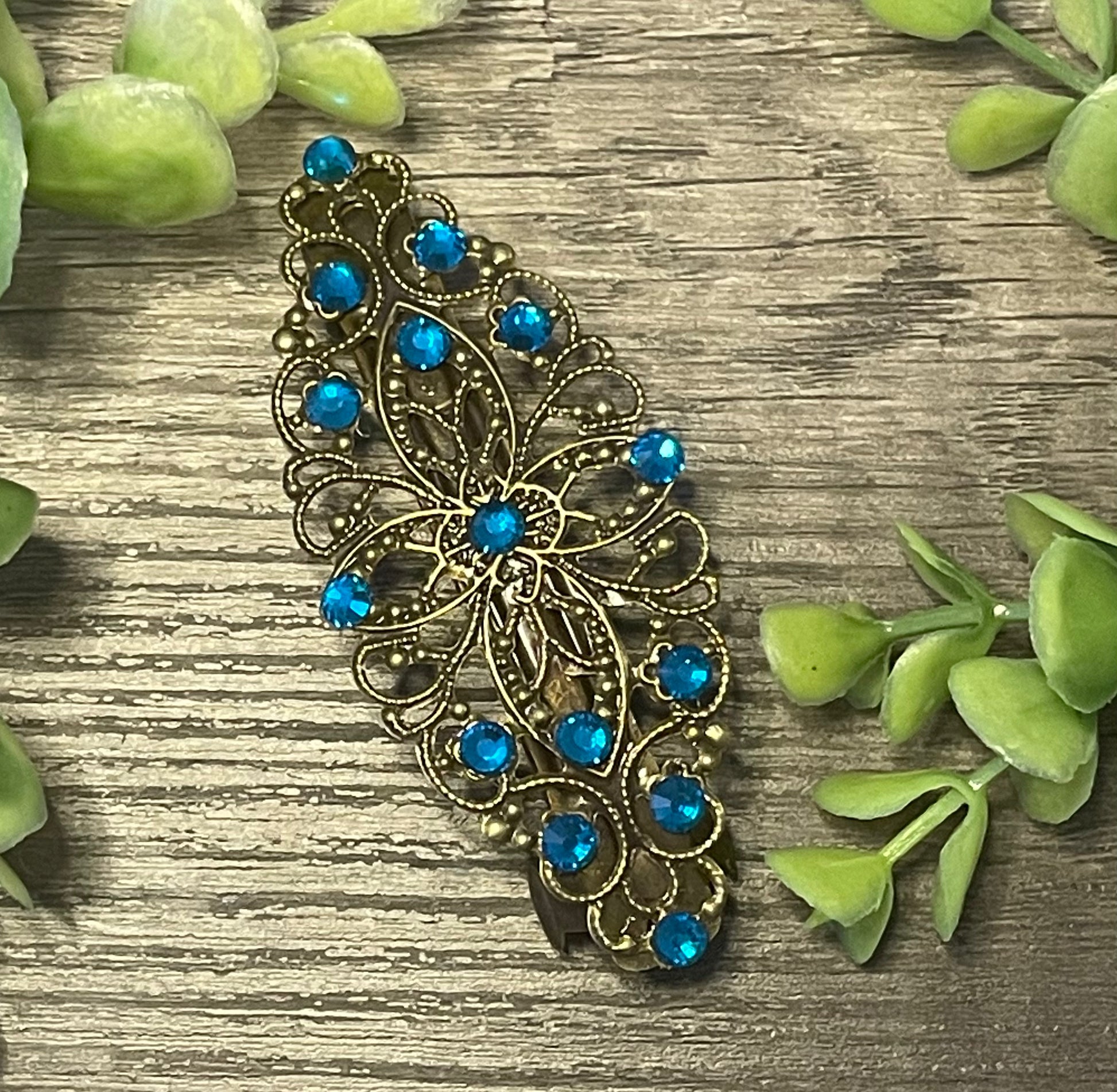 Sapphire teal crystal barrette Vintage Style 3.5”antique tone Metal bridal wedding shower birthday princess prom