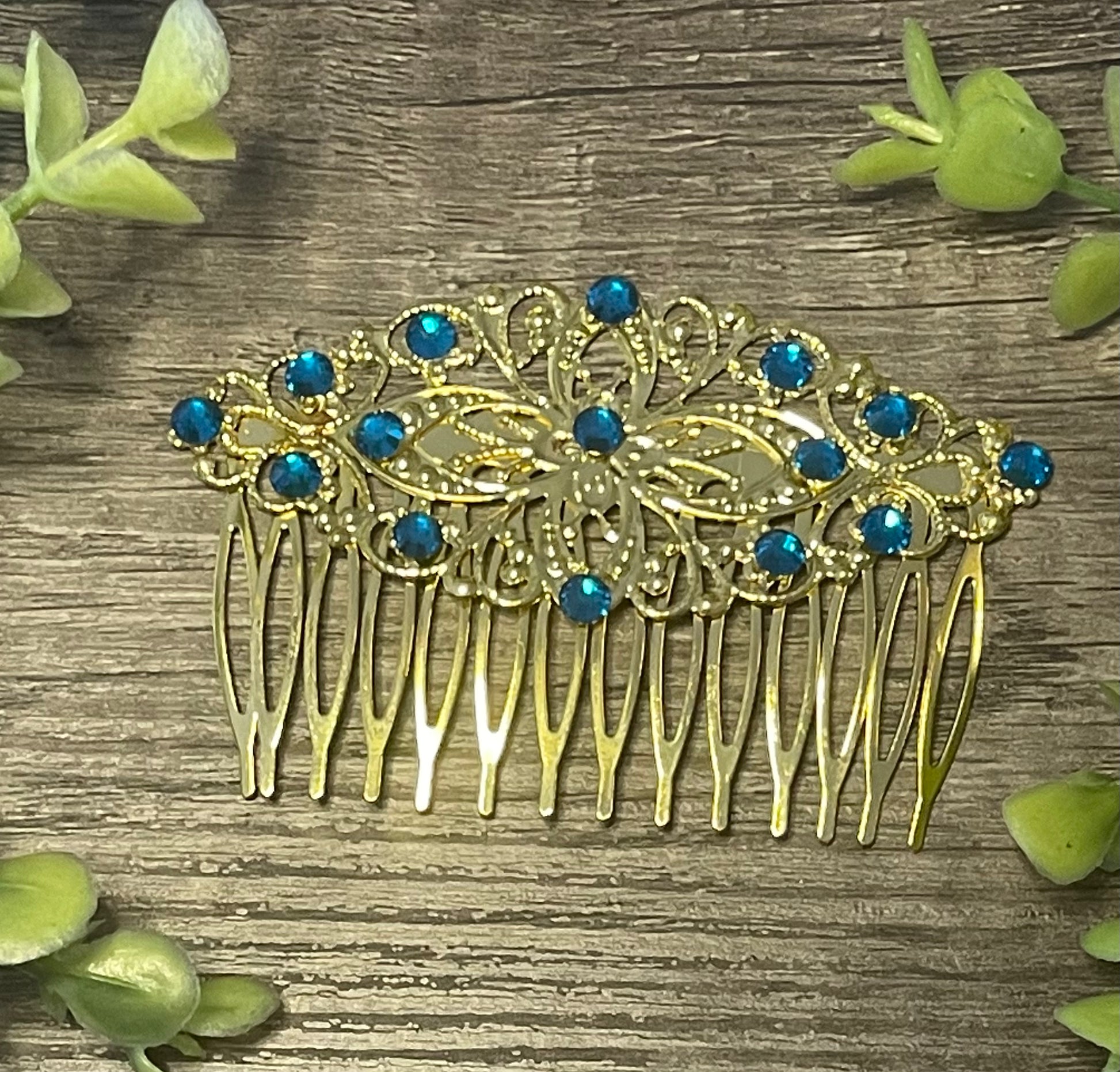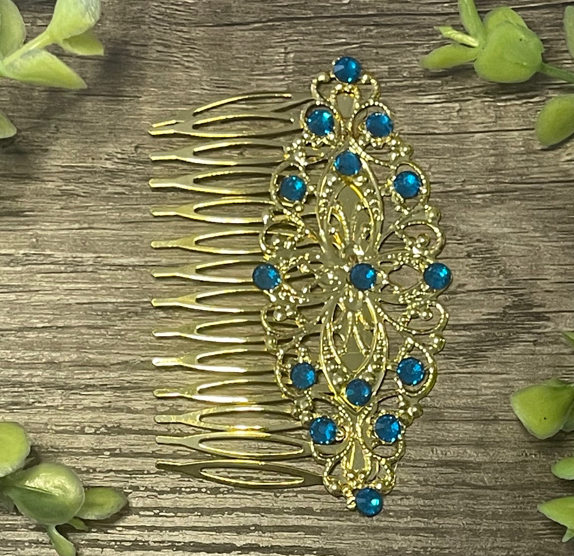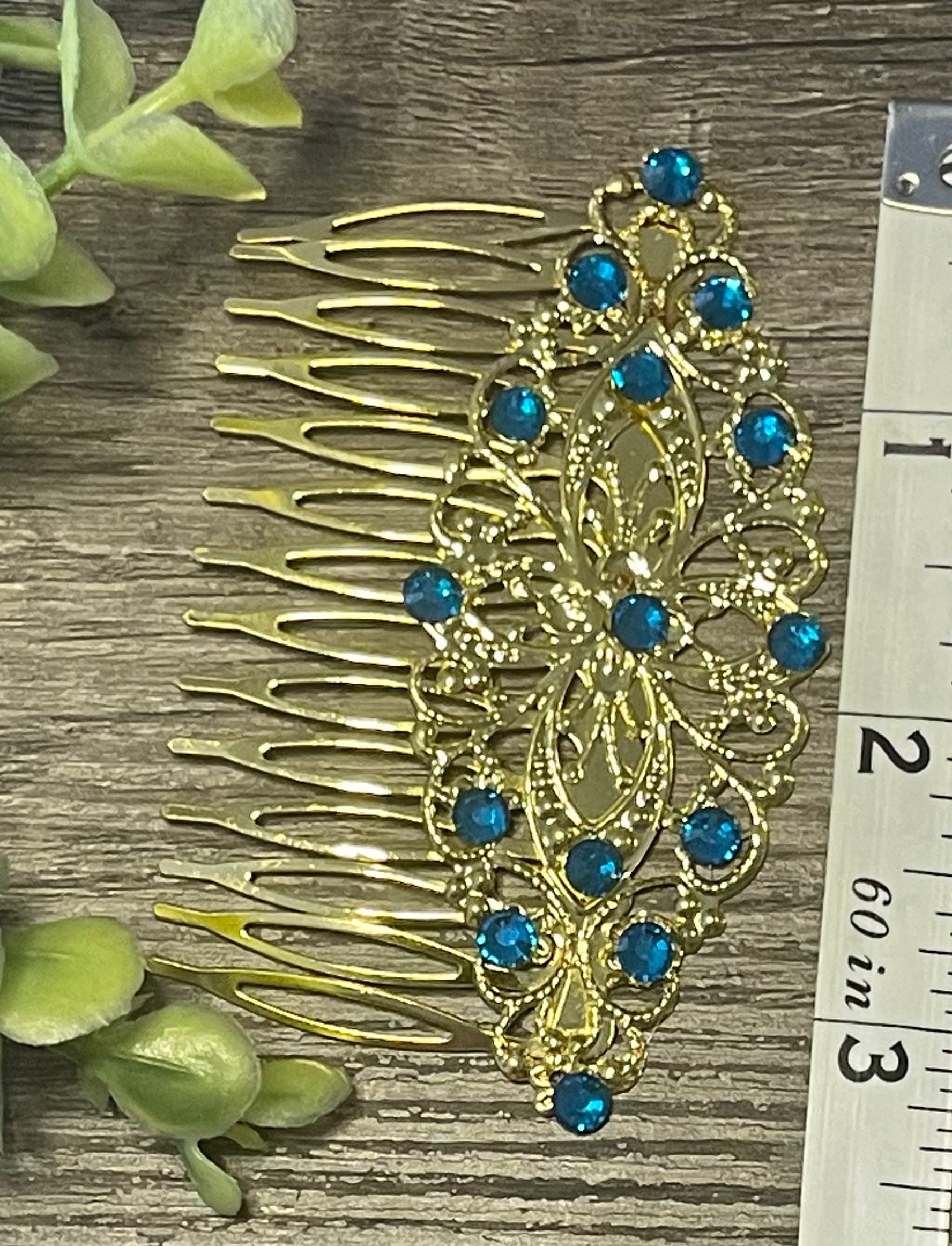 Sapphire teal crystal rhinestone Comb on 3.5” Gold Metal Hair Comb accessory Handmade Retro Bridal Party Prom birthday wedding bridal gift